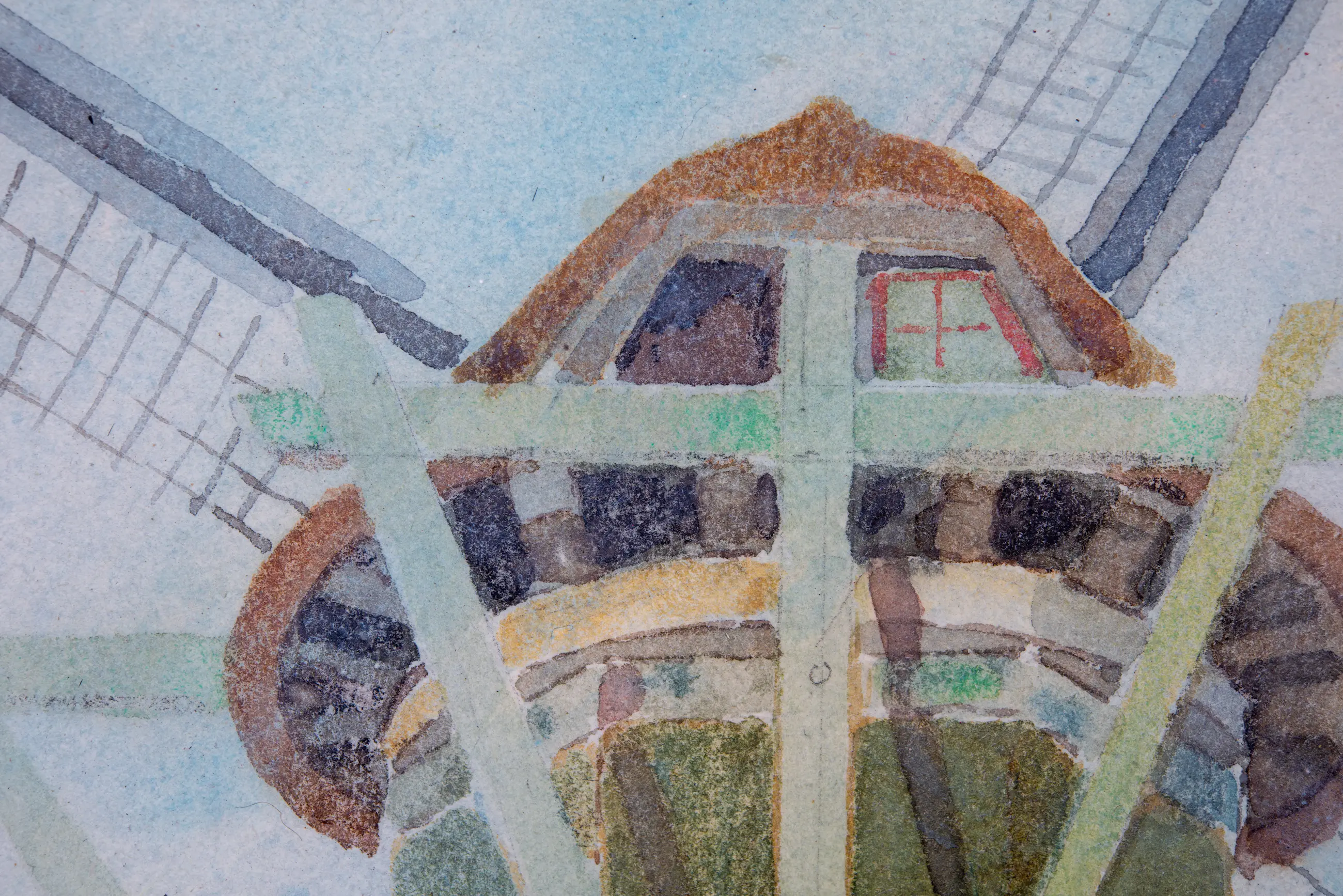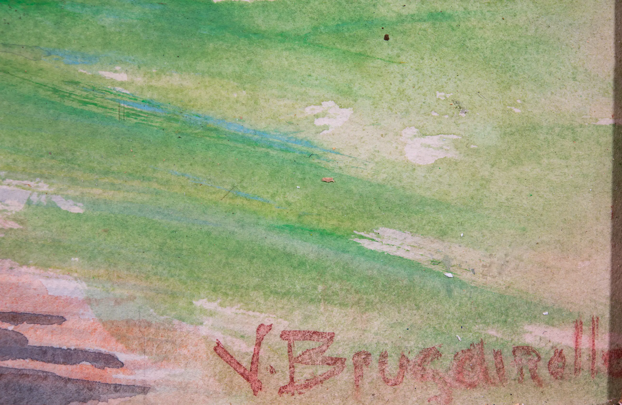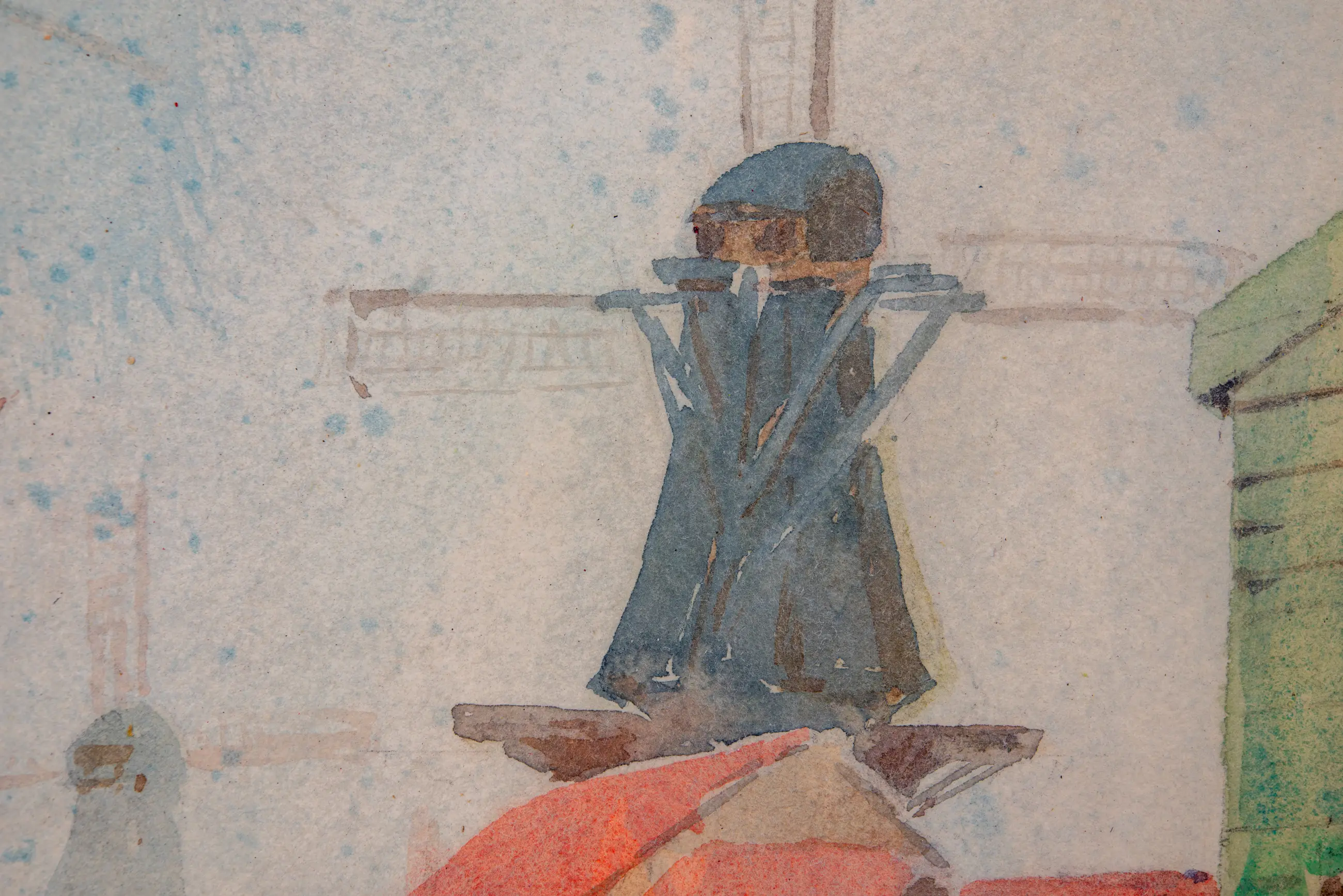 Dit charmante werk ( aquarel op paneel zonder lijst) is een fijn voorbeeld van het werk van de Franse kunstenaar Victor Brugairolles (1869-1936). Zijn schilderijen zijn gewild om hun delicate behandeling van licht en kleur, en dit stuk is daarop geen uitzondering. De afbeelding toont een idyllisch Nederlands landschap, met karakteristieke molens die zich spiegelen in het kalme water. De frisse, heldere kleuren en de vloeiende penseelstreken brengen de scène tot leven en weerspiegelen Brugairolles' vaardigheid in het vastleggen van het moment.