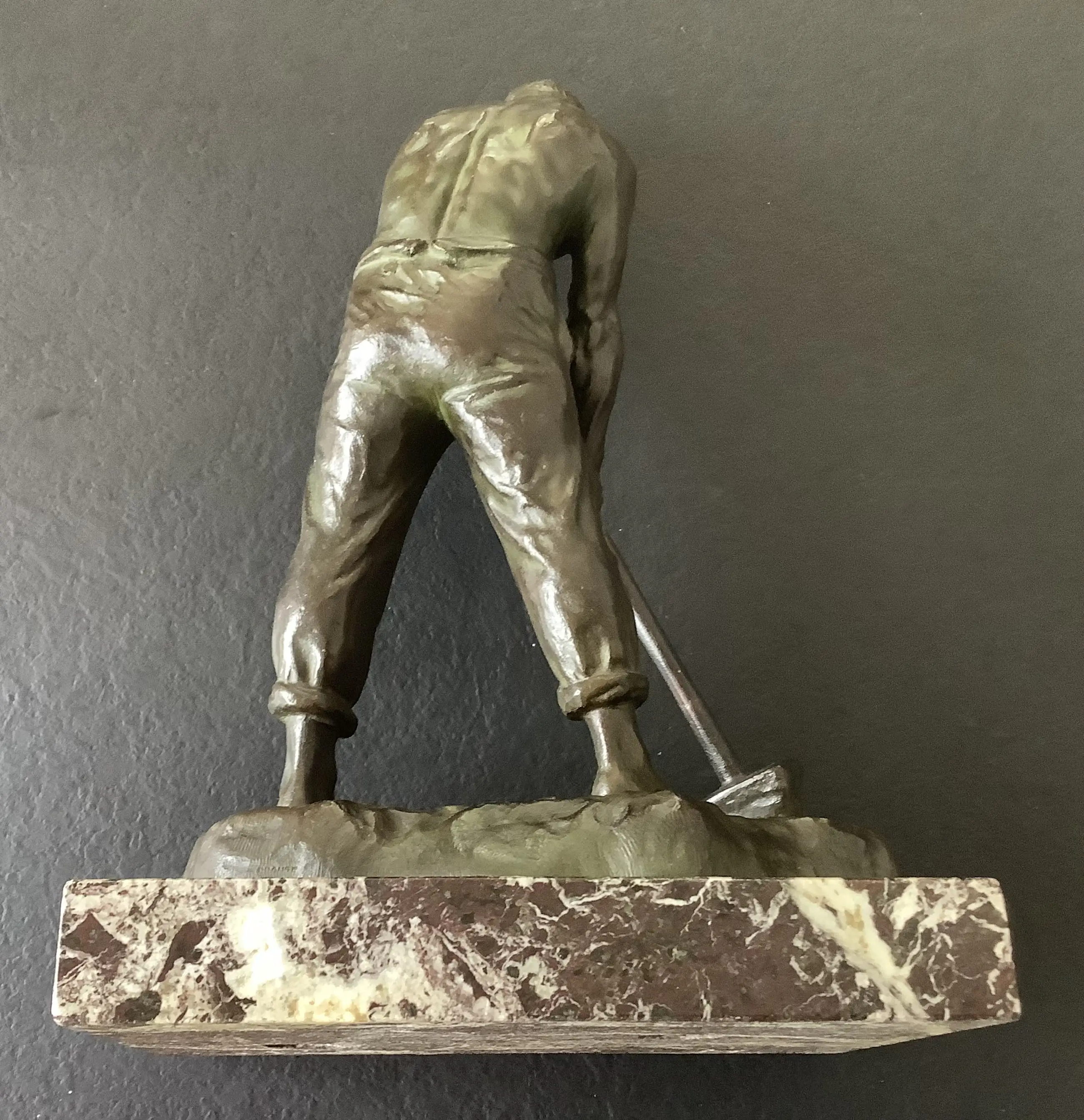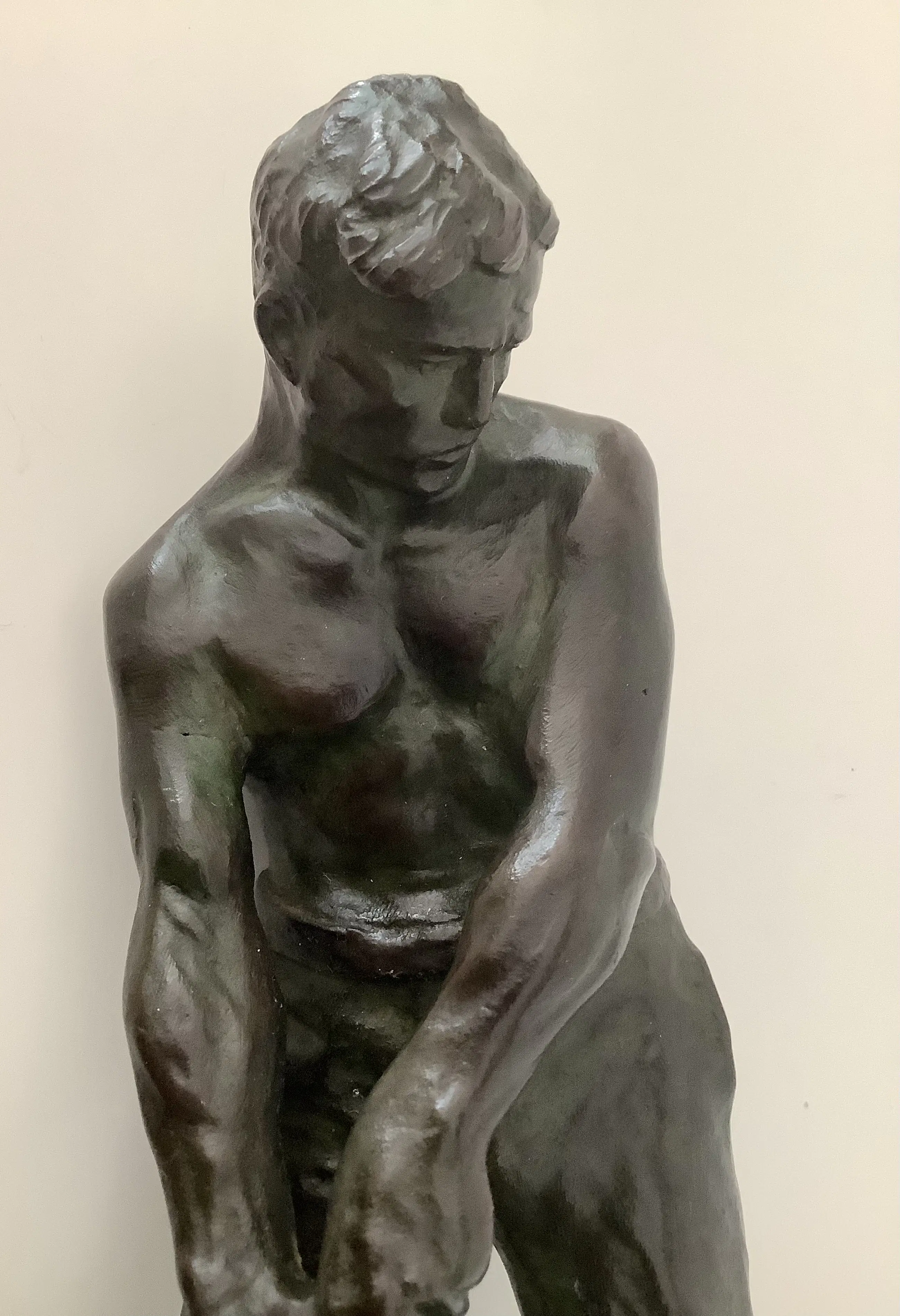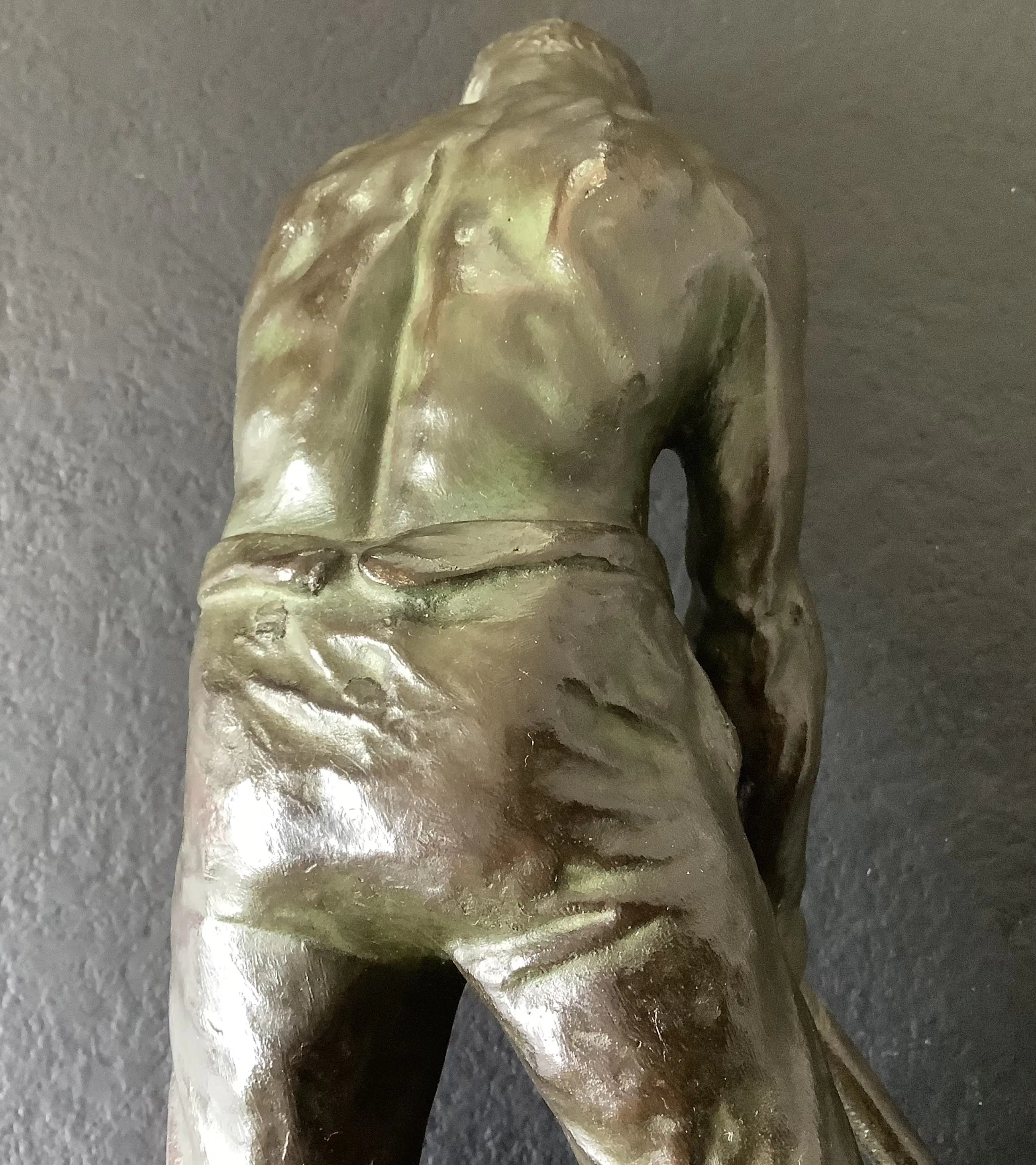 Fraaie sculptuur, jongeman met hamer. Anatomisch van hoge kwaliteit. Op bruin marmeren voet. Afm. marmer 3 x 19,5 x 14 cm.