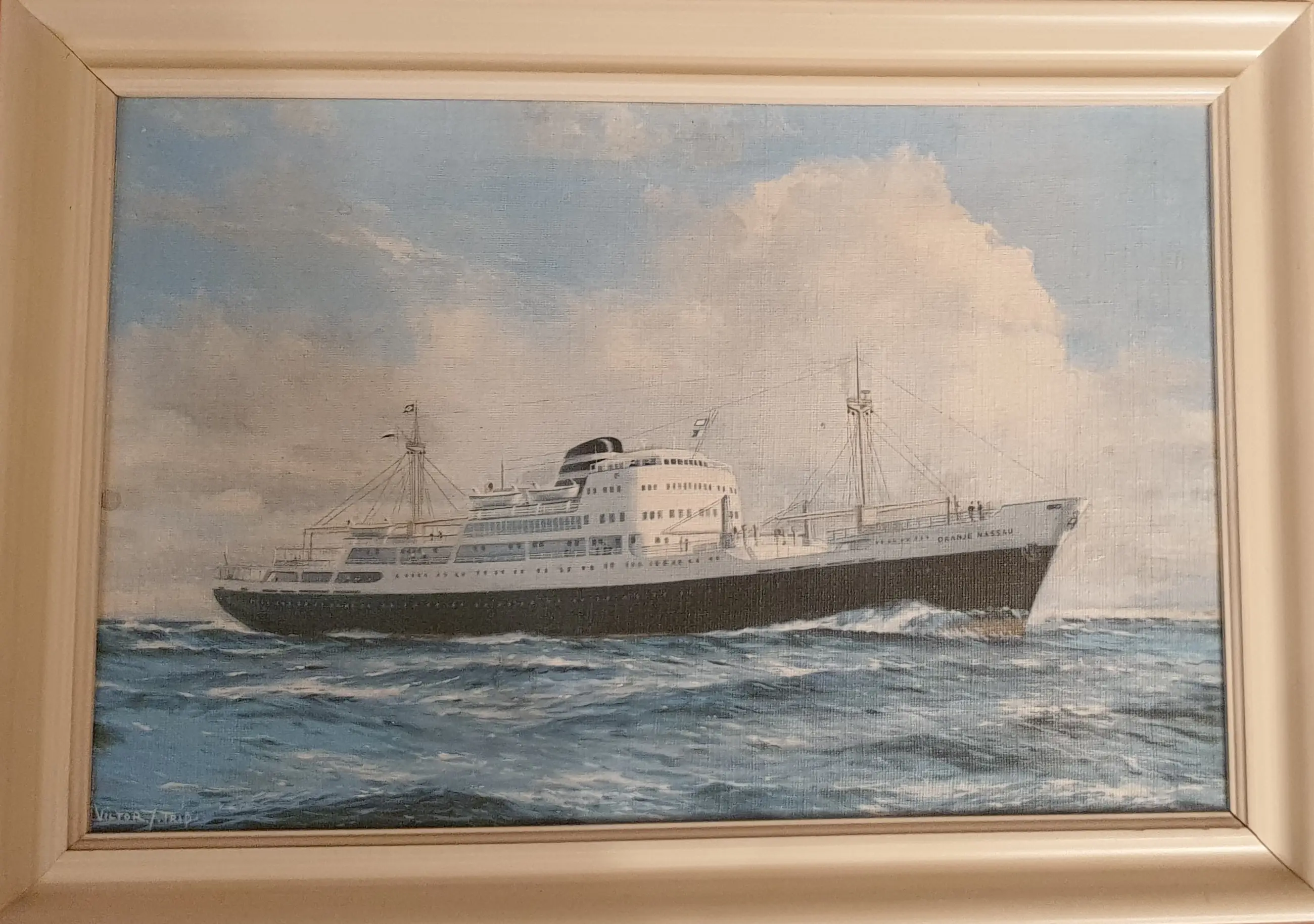 Het passagiersschip is in 1957 gebouwd in opdracht van de KNPM op de scheepswerf van de gebr. Pot te Bolnes (gemeente Ridderkerk). Mijn schoonvader die aan het schip heeft getekend, kreeg dit schilderij van de kunstenaar. Moet wellicht een keer worden schoongemaakt.