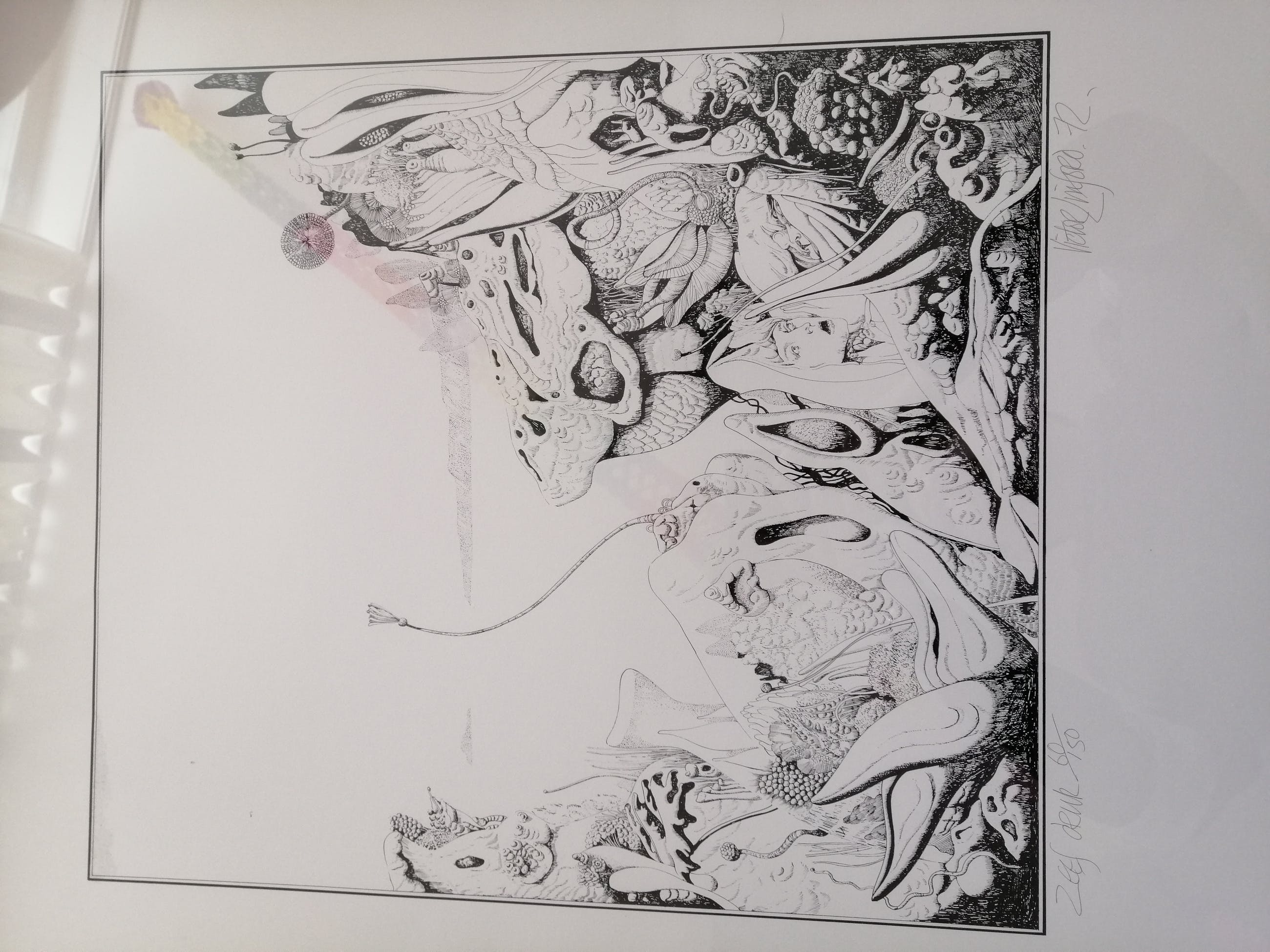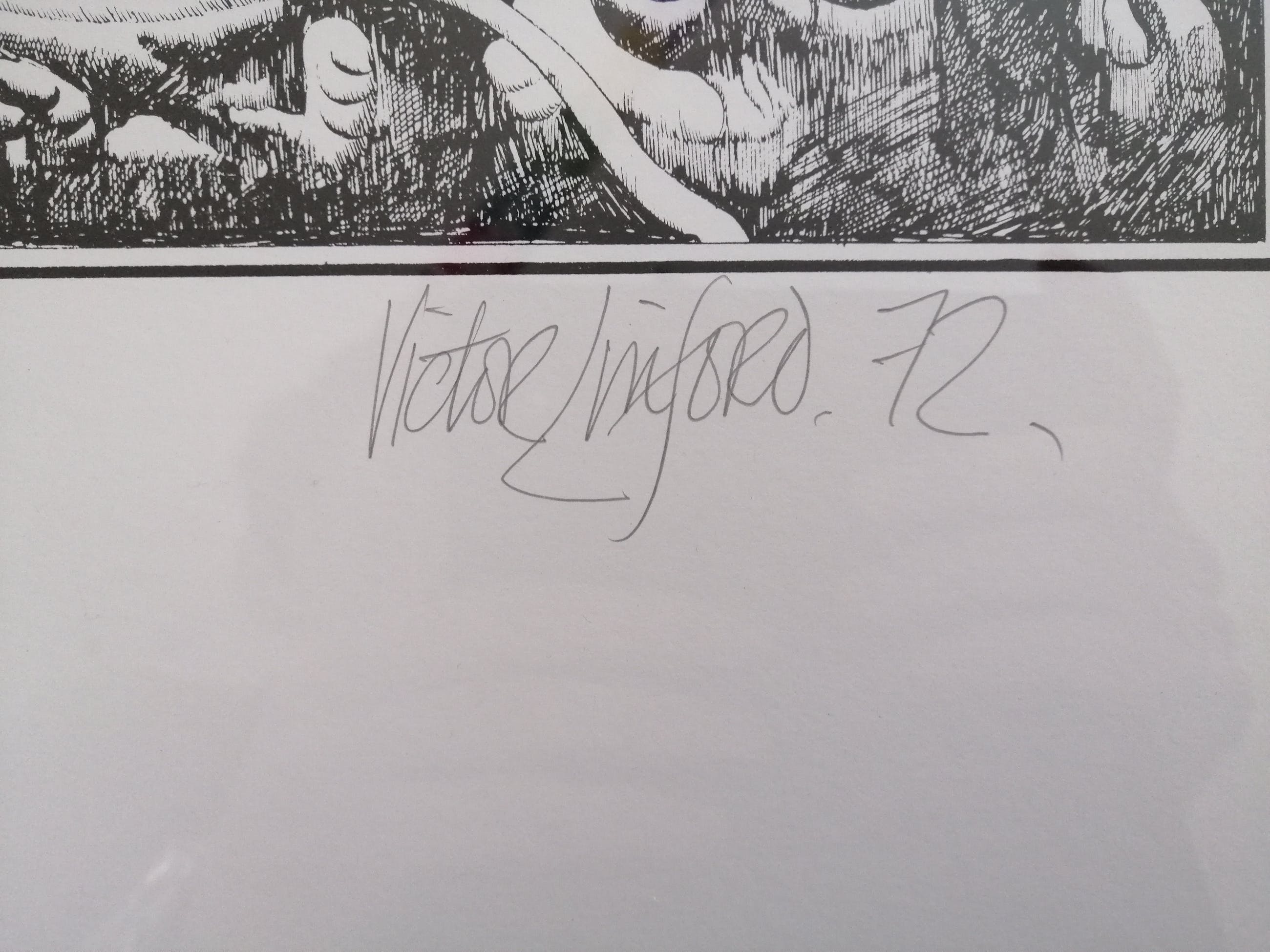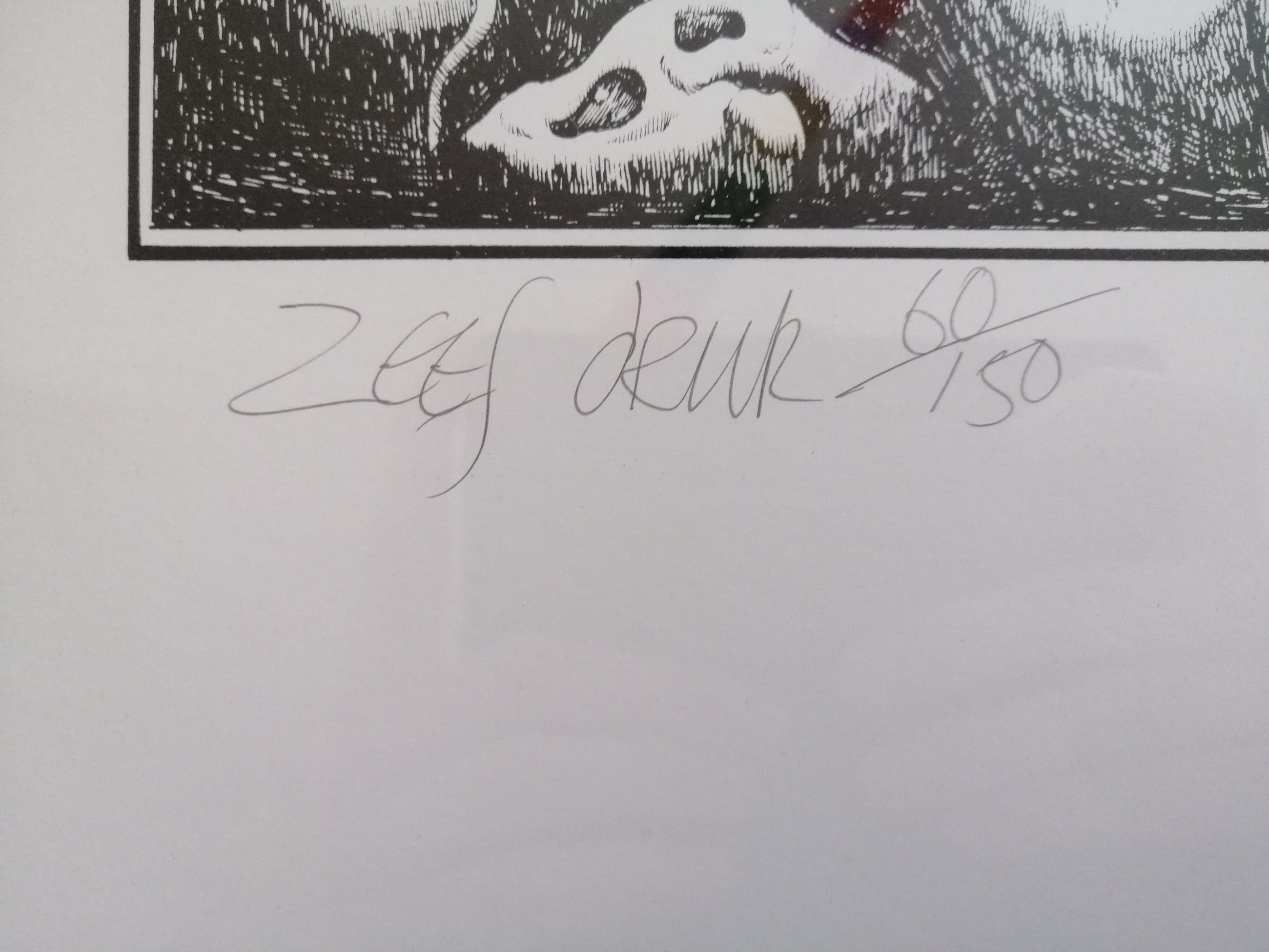 Hier een zeefdruk van zijn hand, door de kunstenaar met potlood genummerd 60 van 150, gesigneerd en gedateerd 1972. Het werk zit in een nette zilverkleurige metalen lijst achter transparant glas.