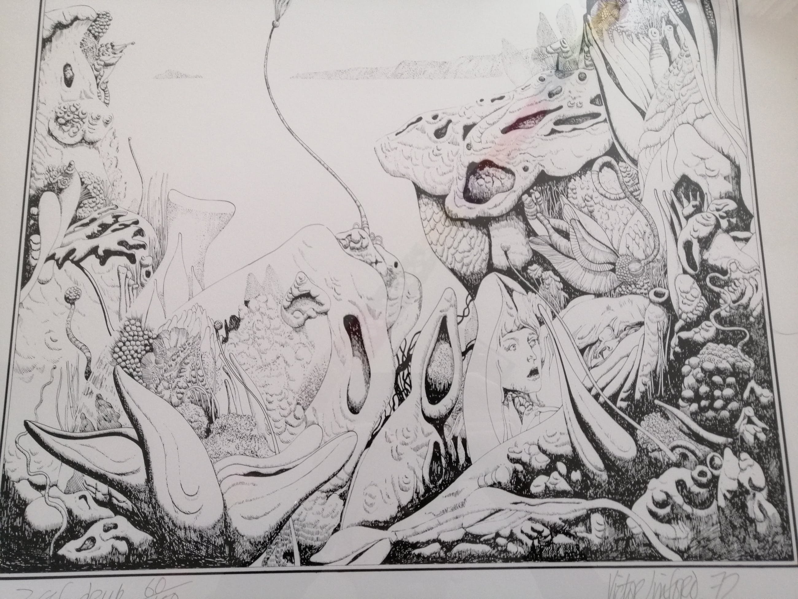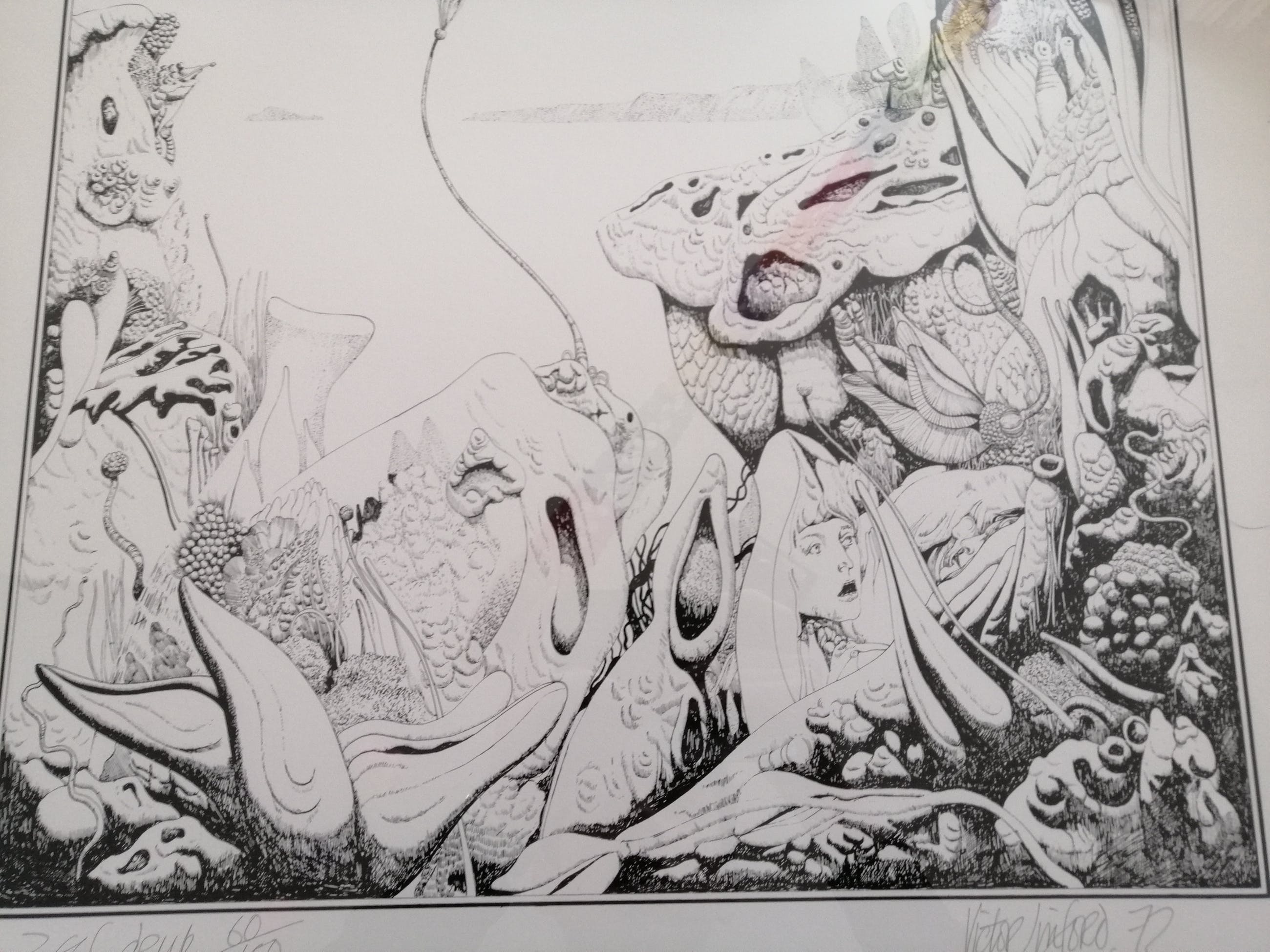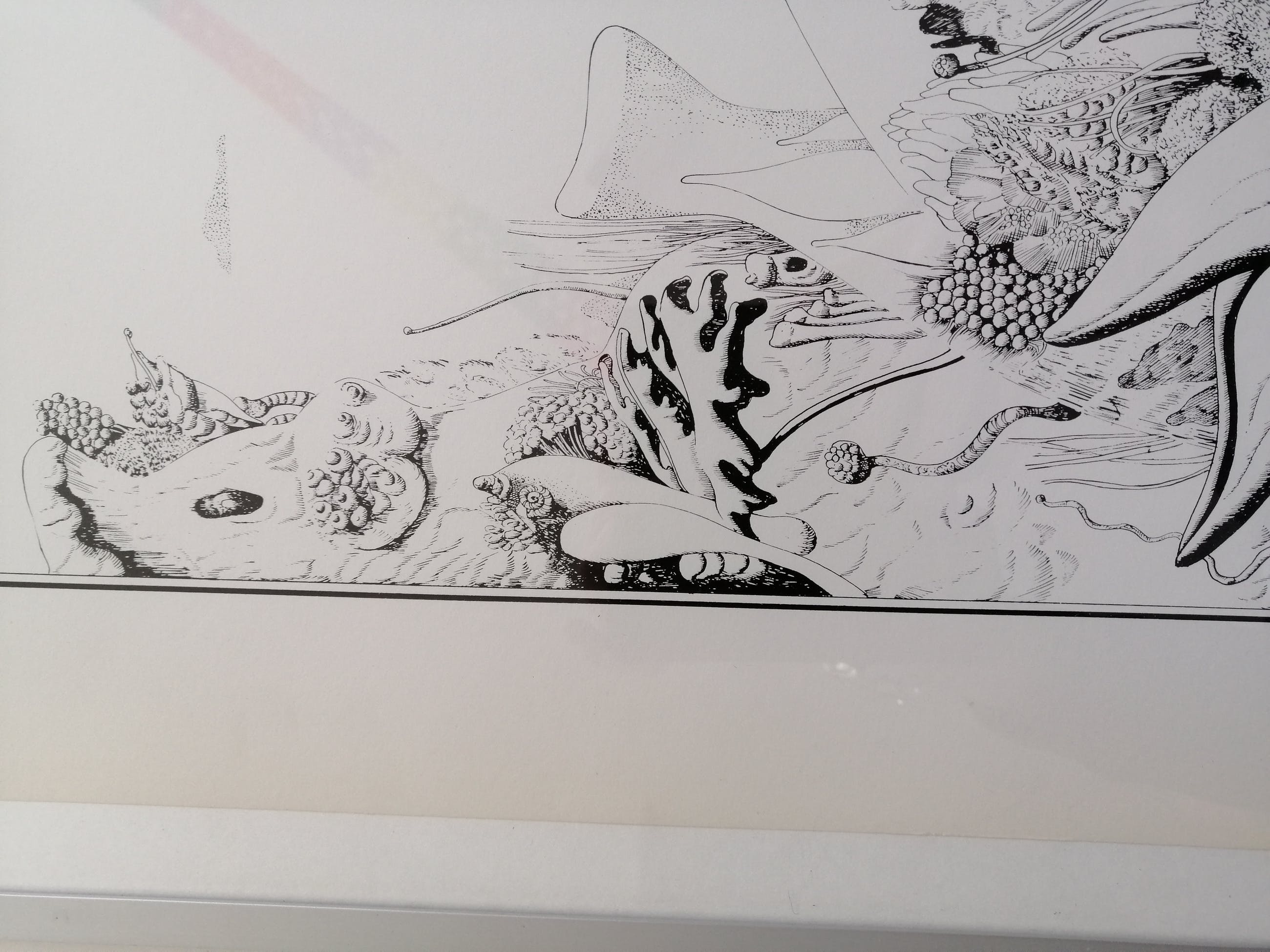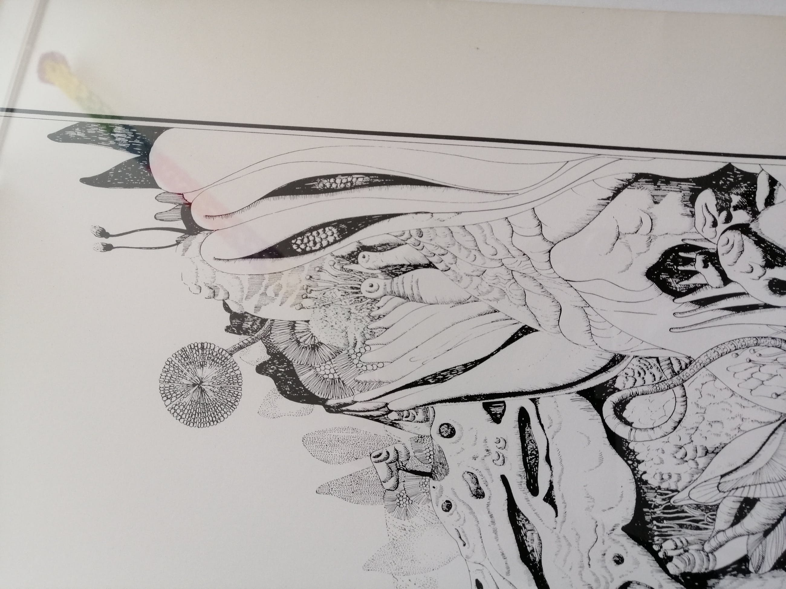 Hier een zeefdruk van zijn hand, door de kunstenaar met potlood genummerd 60 van 150, gesigneerd en gedateerd 1972. Het werk zit in een nette zilverkleurige metalen lijst achter transparant glas.