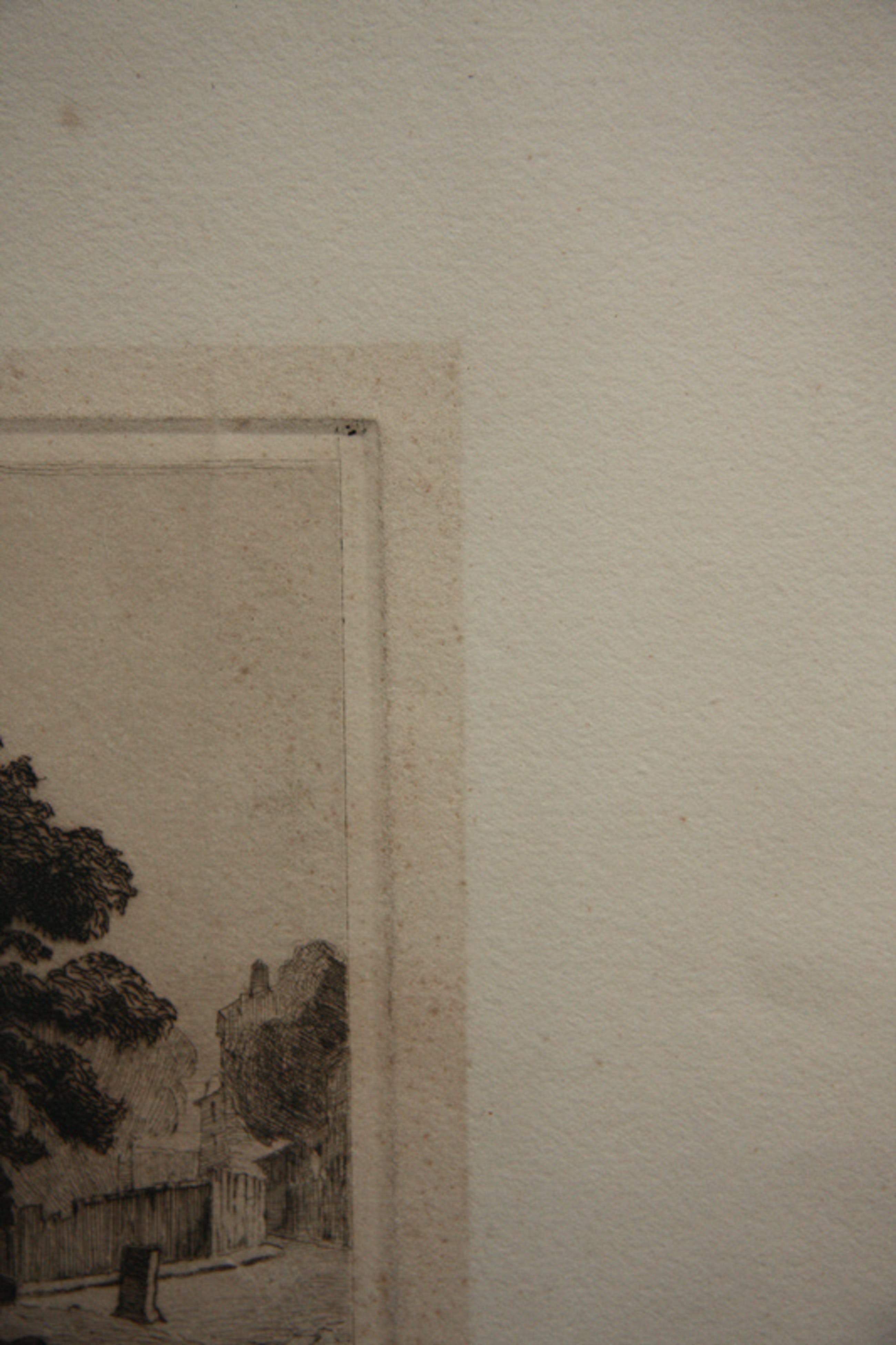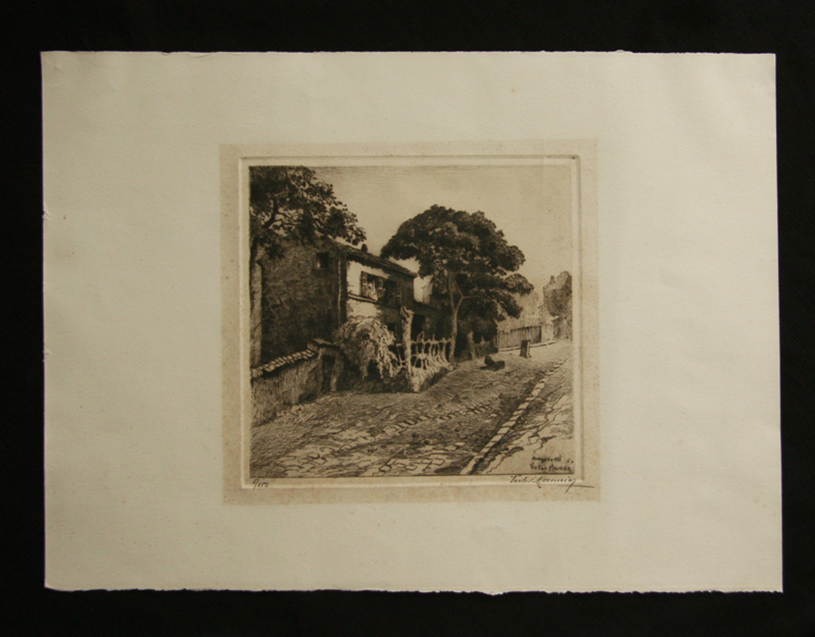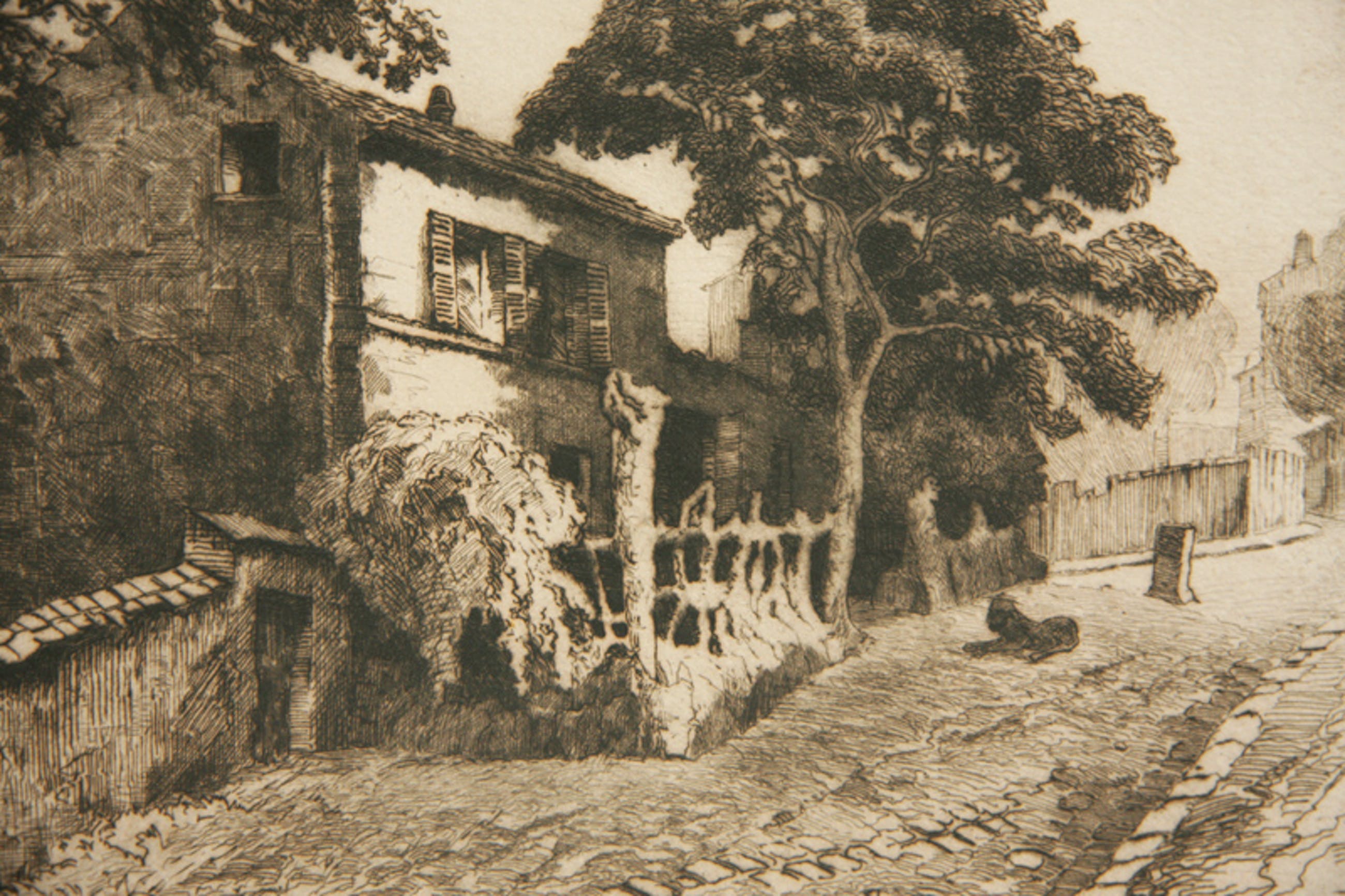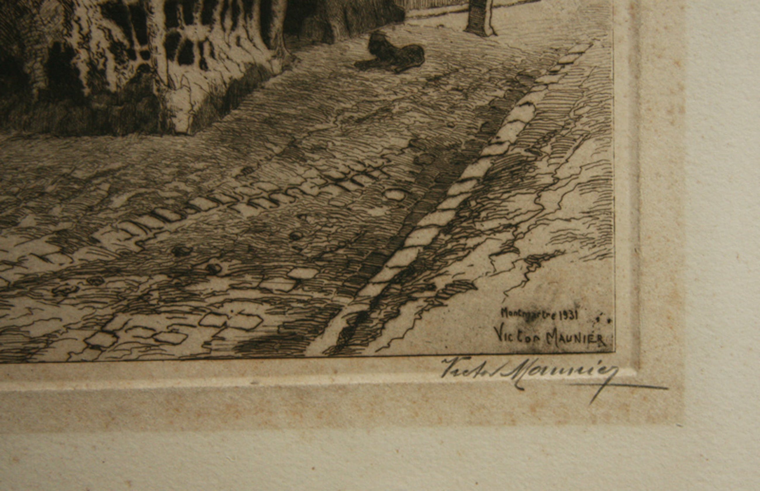 Victor Maunier - Cabaret Au Lapin Agile Montmartre, ets nr 5 van 150 ex. - 1931. Sfeervolle ets op stevig papier van het beroemde cabaret in de jaren '30, stamcafé van vele beroemde kunstenaars en schrijvers, w.o. Ernest Hemingway. Ook de hond op de afbeelding was beroemd. Afmeting papier 33 x 45 cm, beeld 19 x 20 cm.