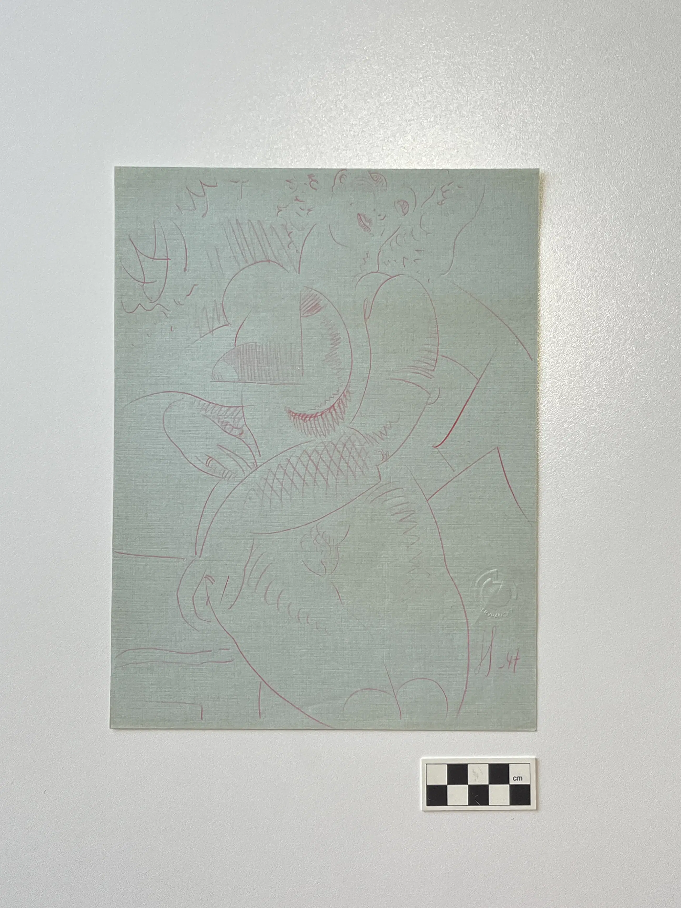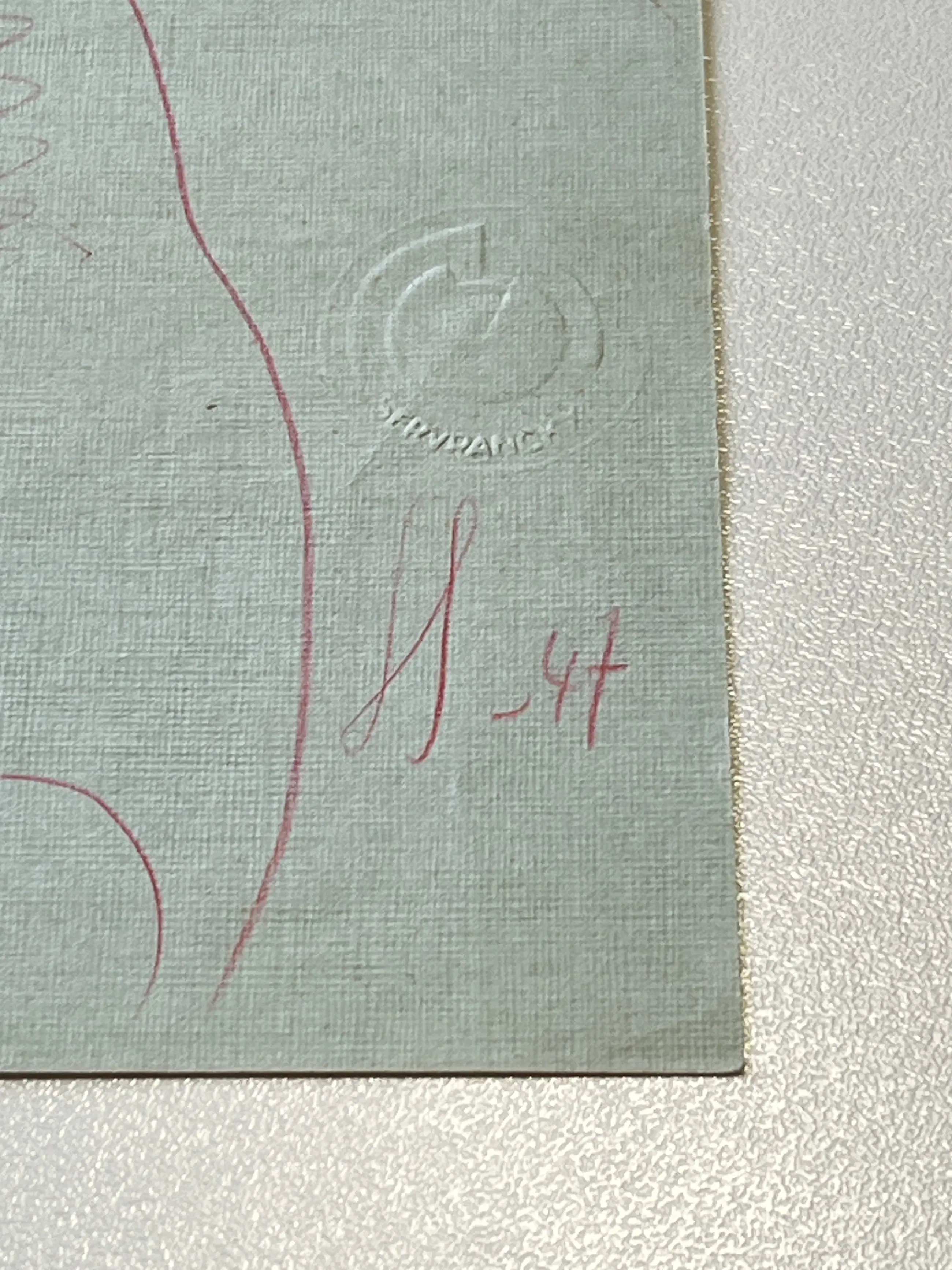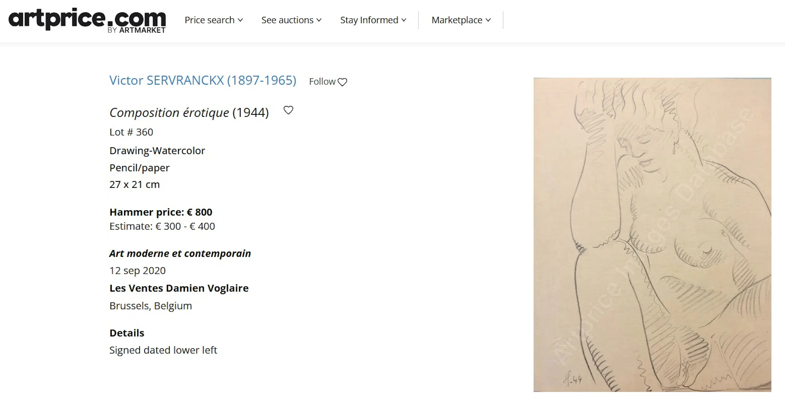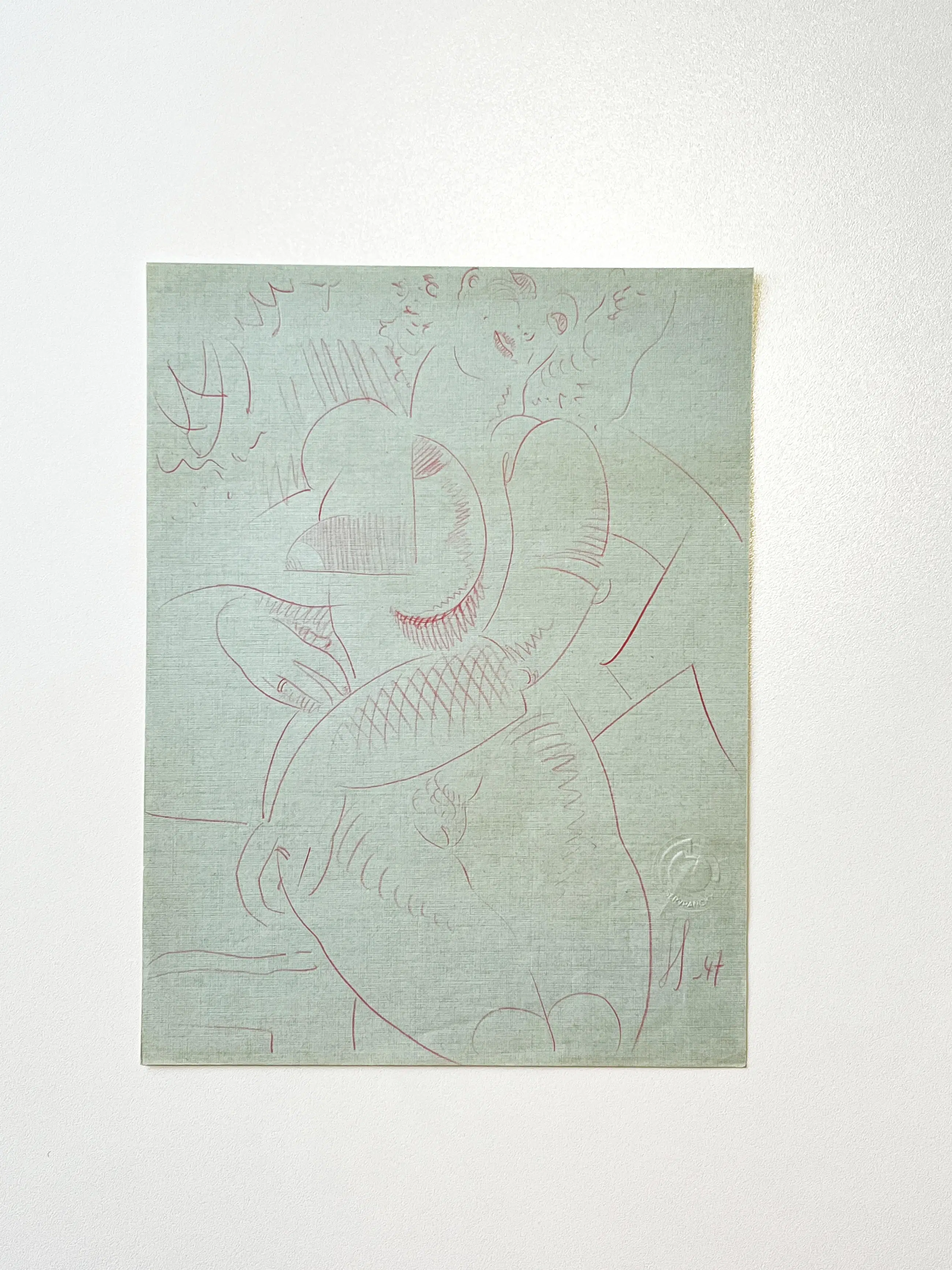 Het werk is getekend met roze kleurpotlood op mooi blauw reliëfpapier, het geheel is in perfecte staat ! Ter referentie een soortgelijke erotische tekening is gehamerd voor 800€.