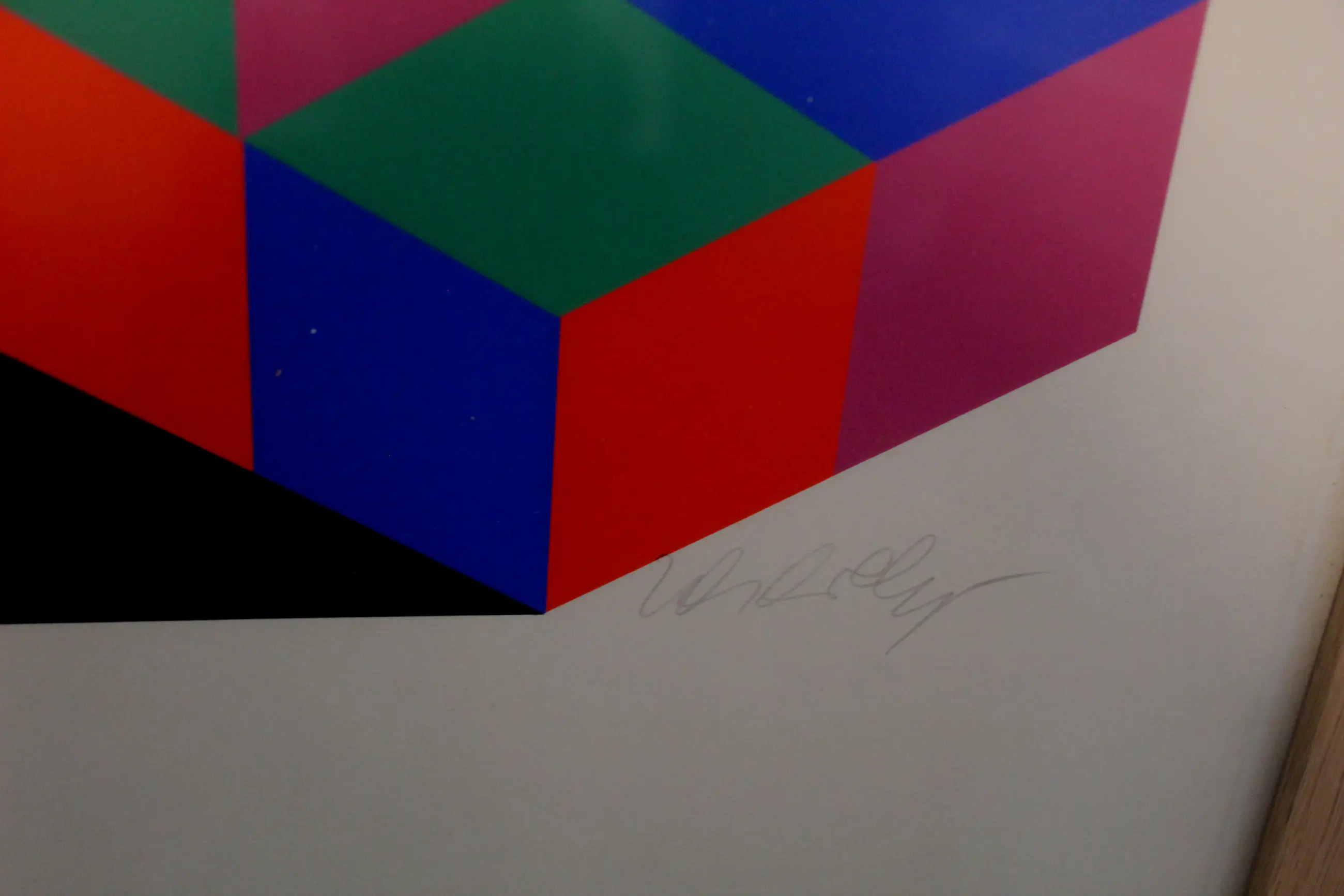 Ingelijste zeefdruk van Victor Vasarely. Oplage: 87/123. Afmetingen incl lijst: H42 x b33cm. Afmetingen voorstelling: H28x b24cm. Het werk is rechts onderaan gesigneerd door de kunstenaar. De authenticiteit van het aangeboden werk wordt volledig gegarandeerd. Een certificaat van echtheid kan, op aanvraag, worden gemaild.