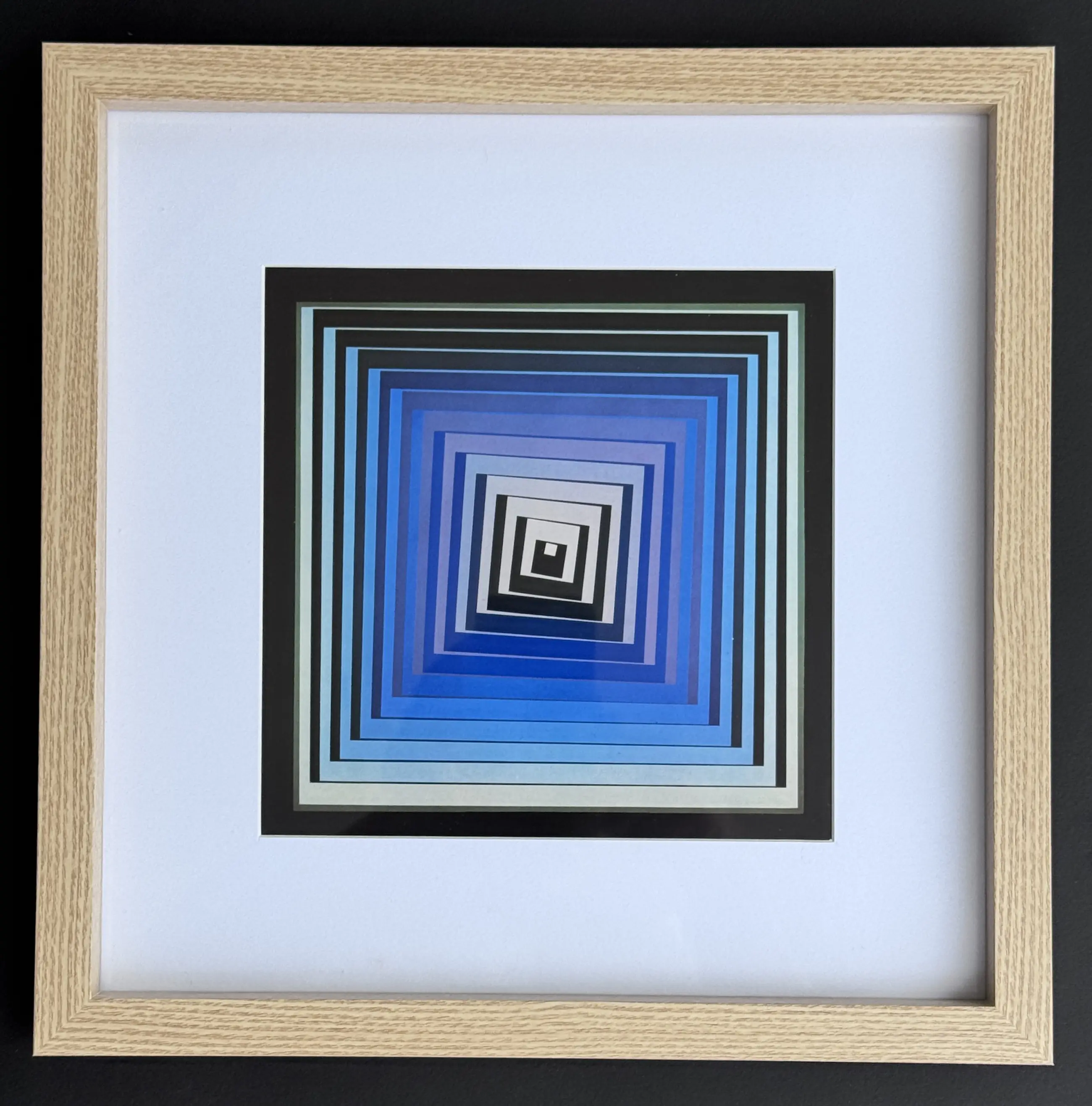 Elk werk is zorgvuldig ingelijst in een natuurlijke, lichte houten lijst met een matte afwerking, een witte passe-partout en beschermend glas. Het resultaat is ingetogen, elegant en eigentijds, ideaal voor een designinterieur of een moderne kunstcollectie.