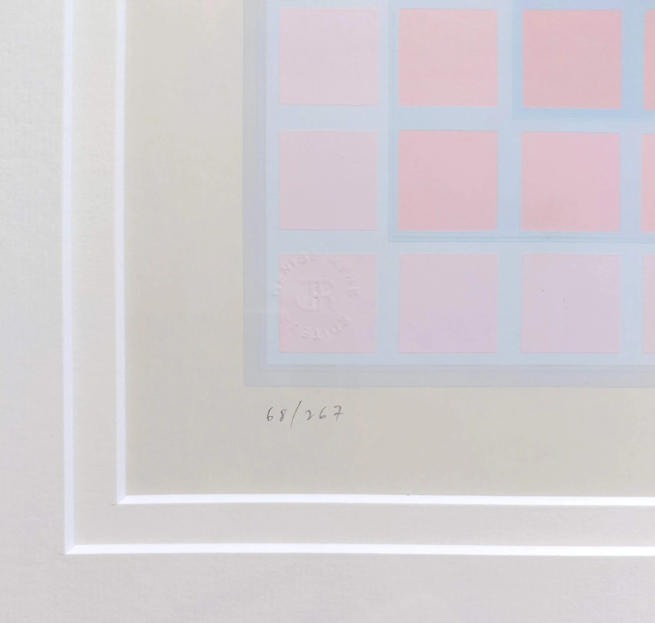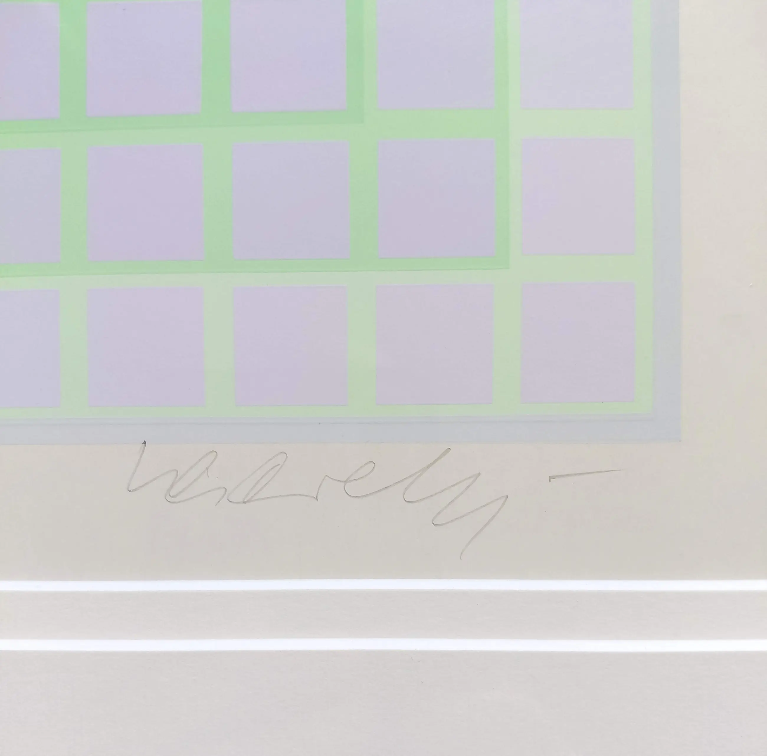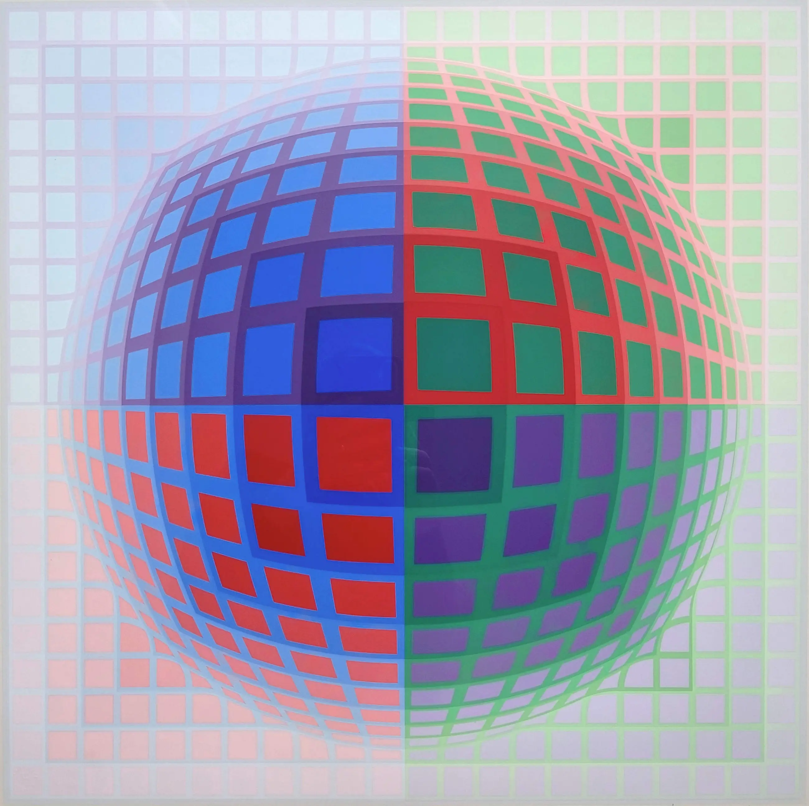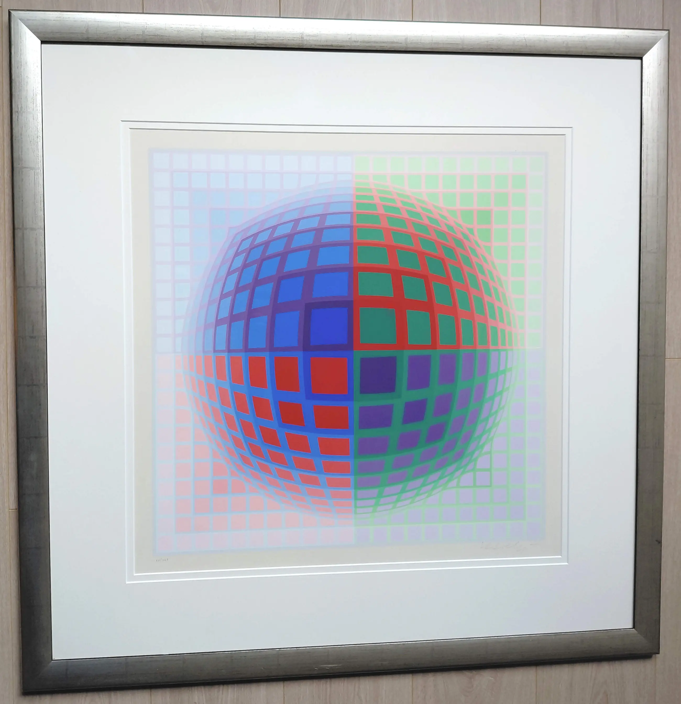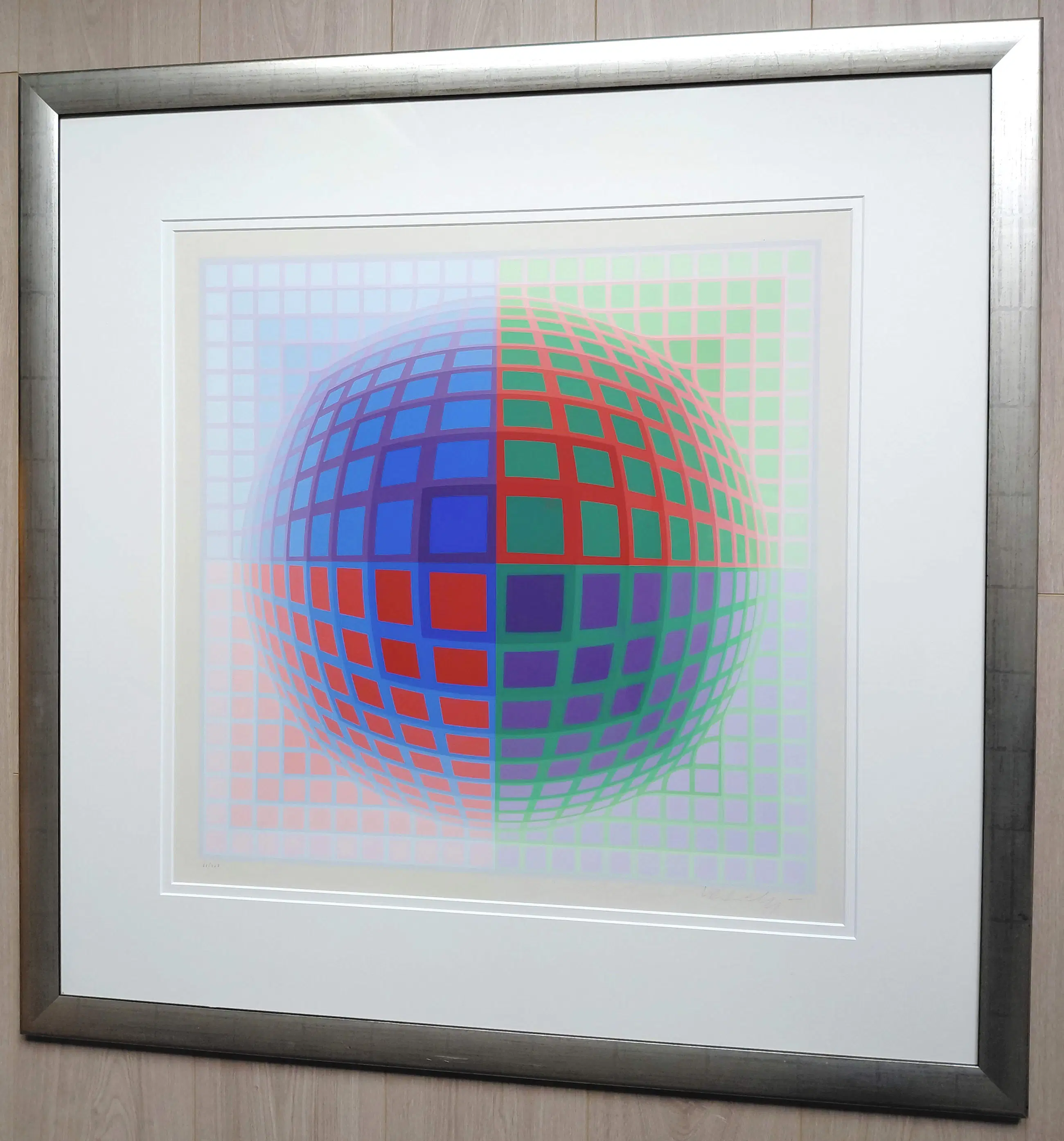 Prachtig, hypnotiserend werk van Victor Vasarely. Zeefdruk op papier, met potlood gesigneerd en genummerd (68/267) en met blindstempel van de eveneens vermaarde uitgever “Denise René Editeur”. Zeer mooi, professioneel ingelijst, achter glas en met smetteloze, zuurvrije passe-partouts. Alles in uitstekende conditie.