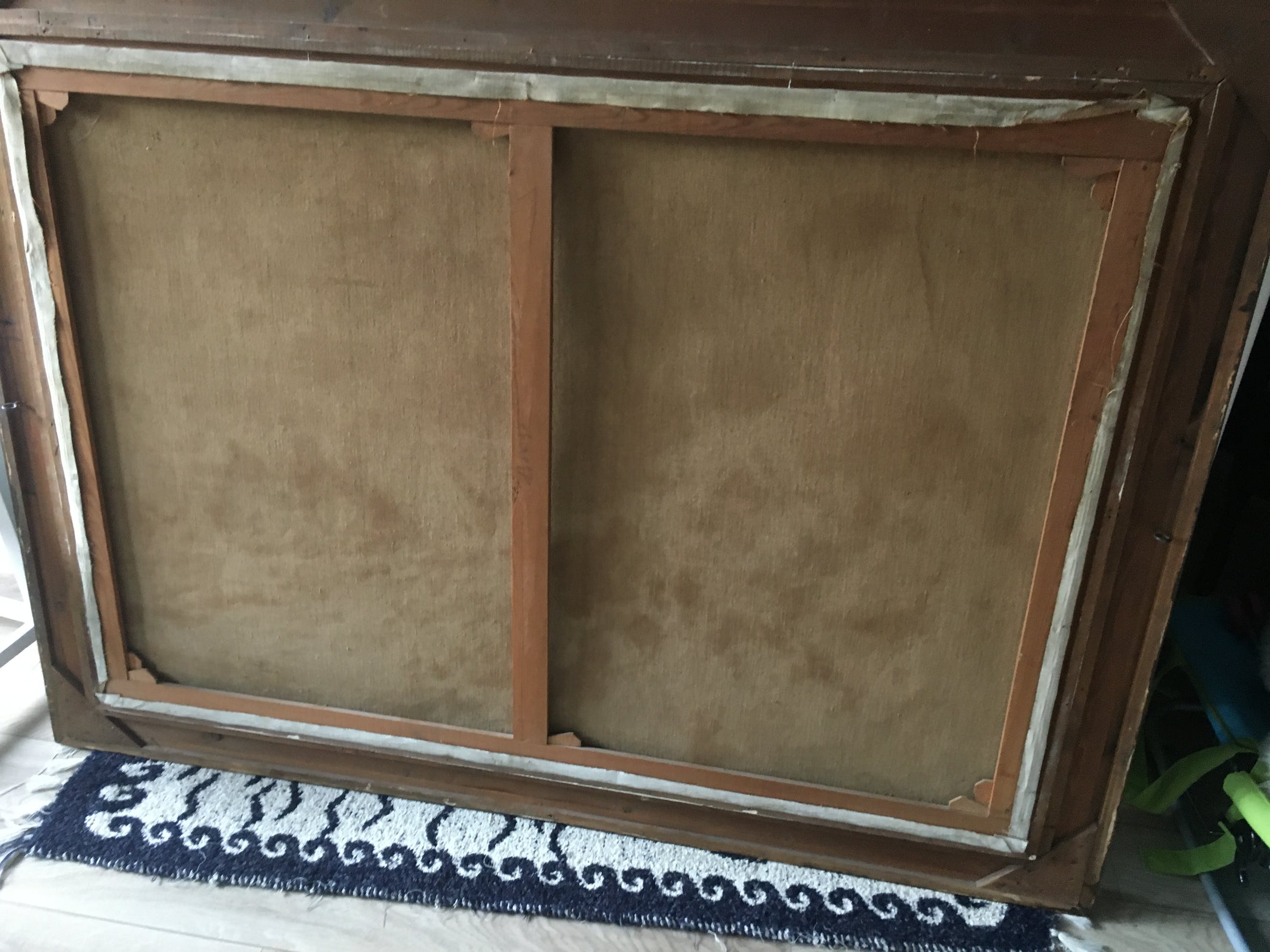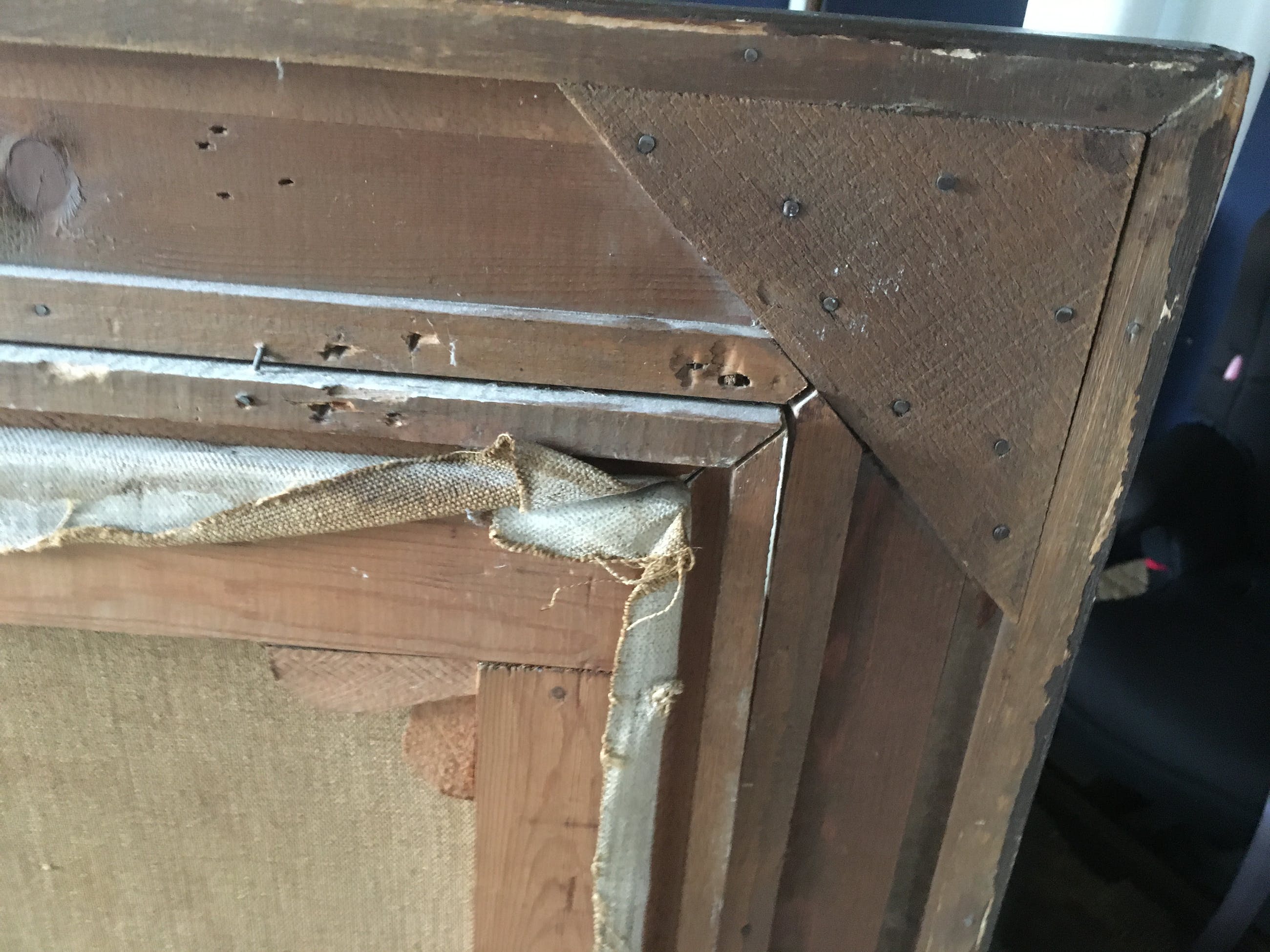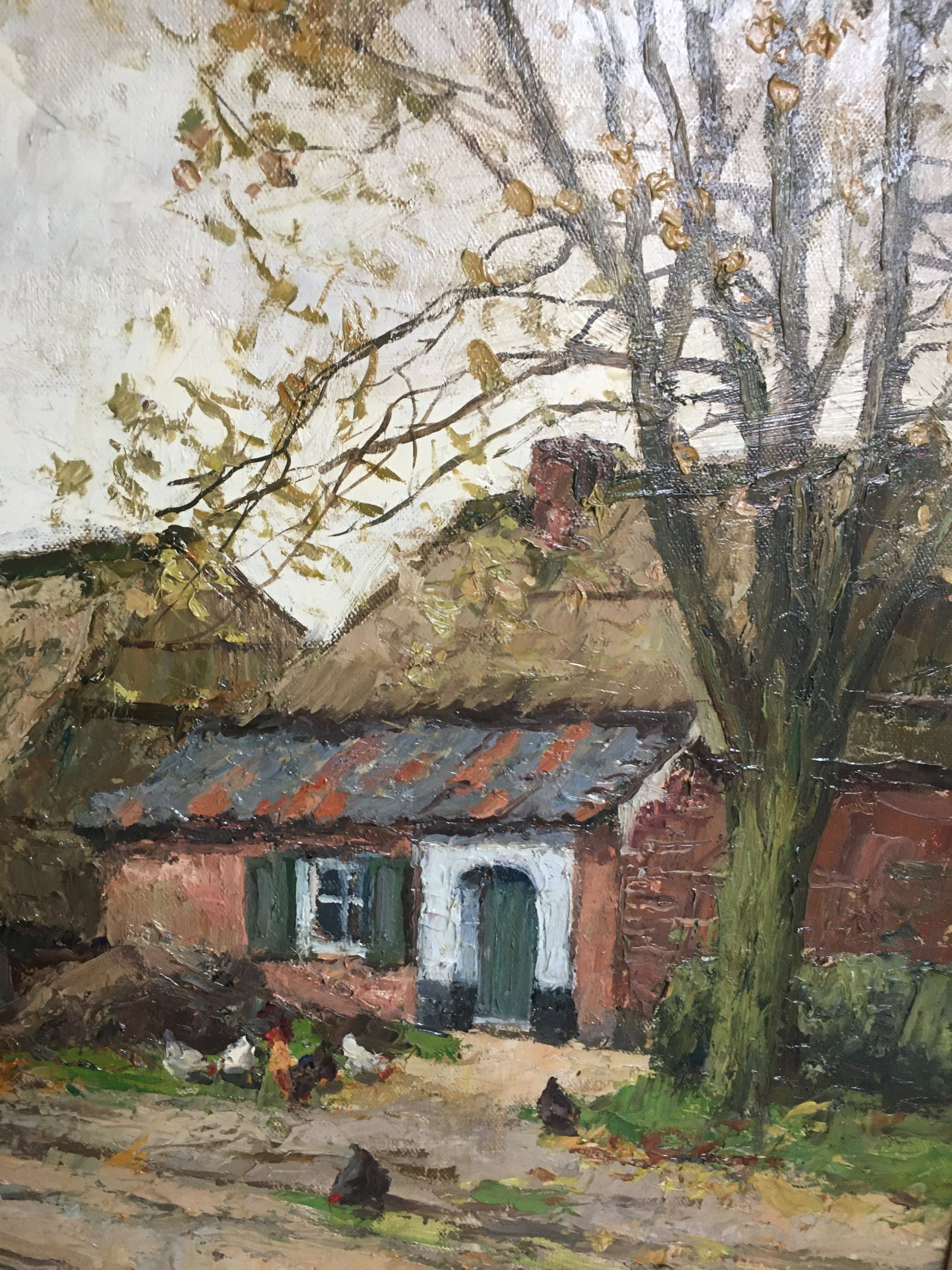Dit schilderij is ooit één keer verhuisd van een galerij naar het appartement van mijn schoonmoeder, waar het altijd op dezelfde "promminente" plek heeft gehangen. Wij zien geen beschadigingen aande verf of het doek.