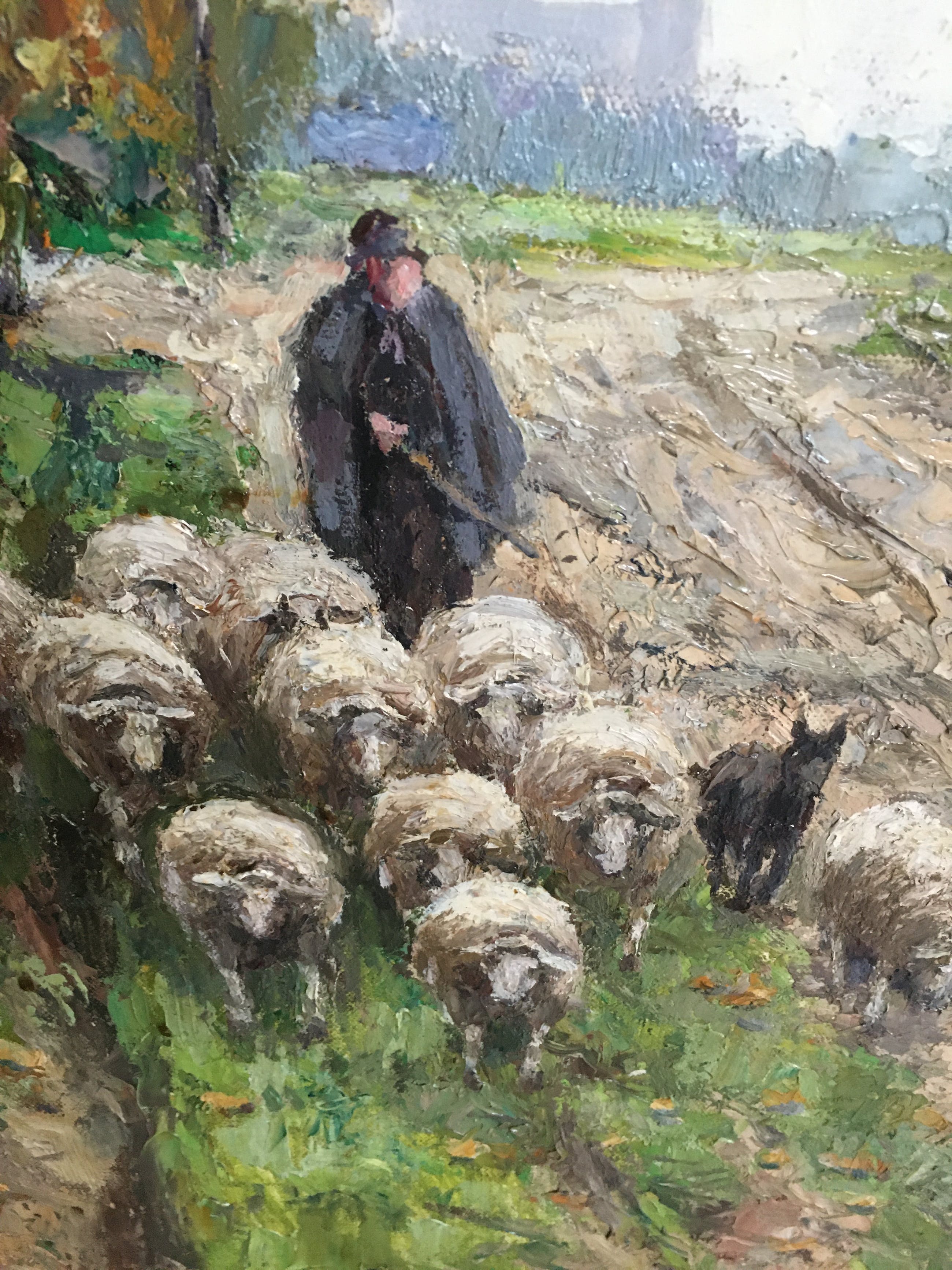 Het originele schilderij beeld een (volgens ons) Kempische boerderij af die langs een landweg ligt. Er is een herder te zien die zijn schapen hoedt en er scharrelen kippen rond op het erf. De boerderij staat in de schaduw van enkele hoge loofbomen. In de verte is nog een tweede boerderij te zien... Aan de horizon ziet men het silouet van een kerk dat zou kunnen helpen om de juiste locatie van het tafereel te bepalen.
