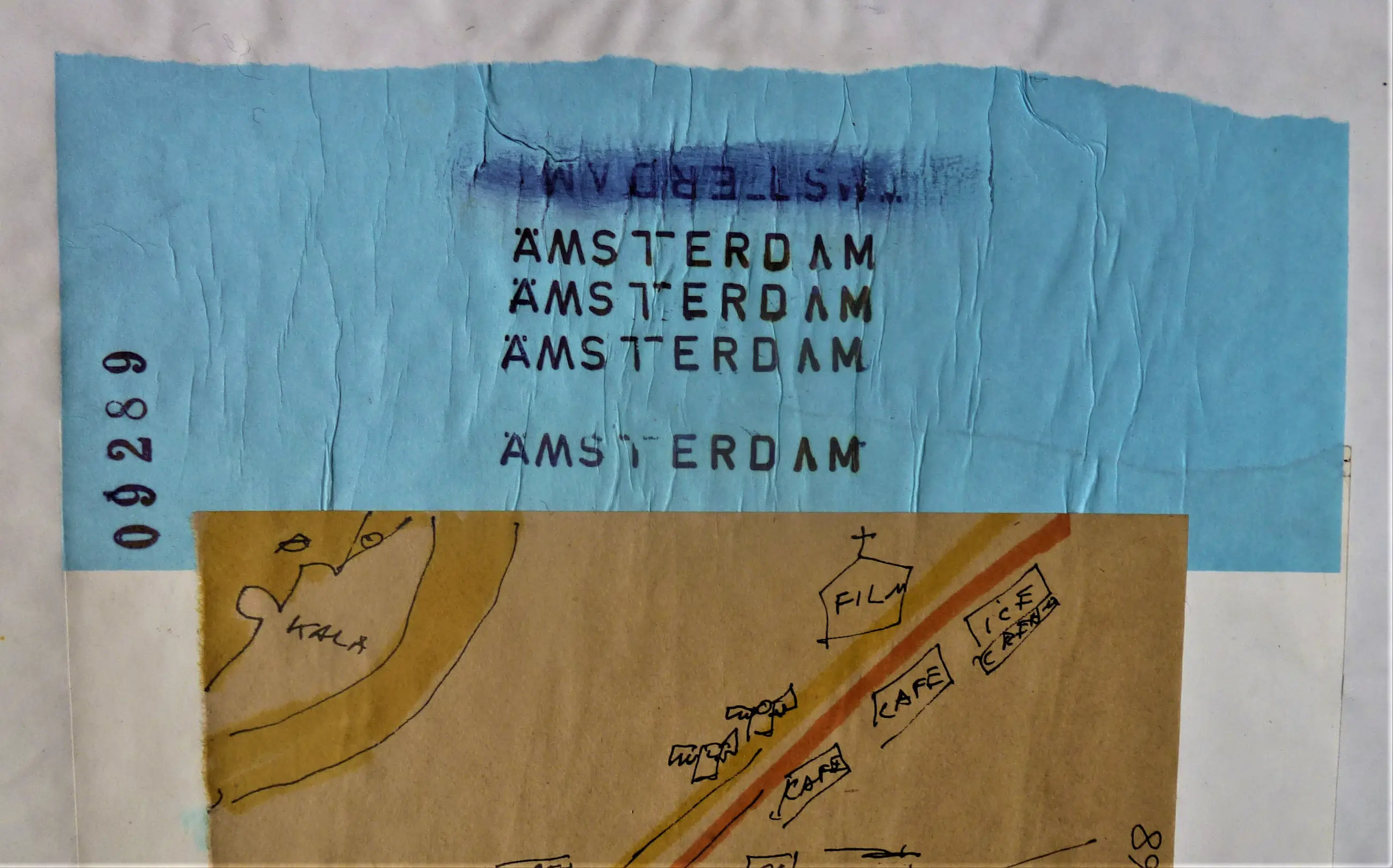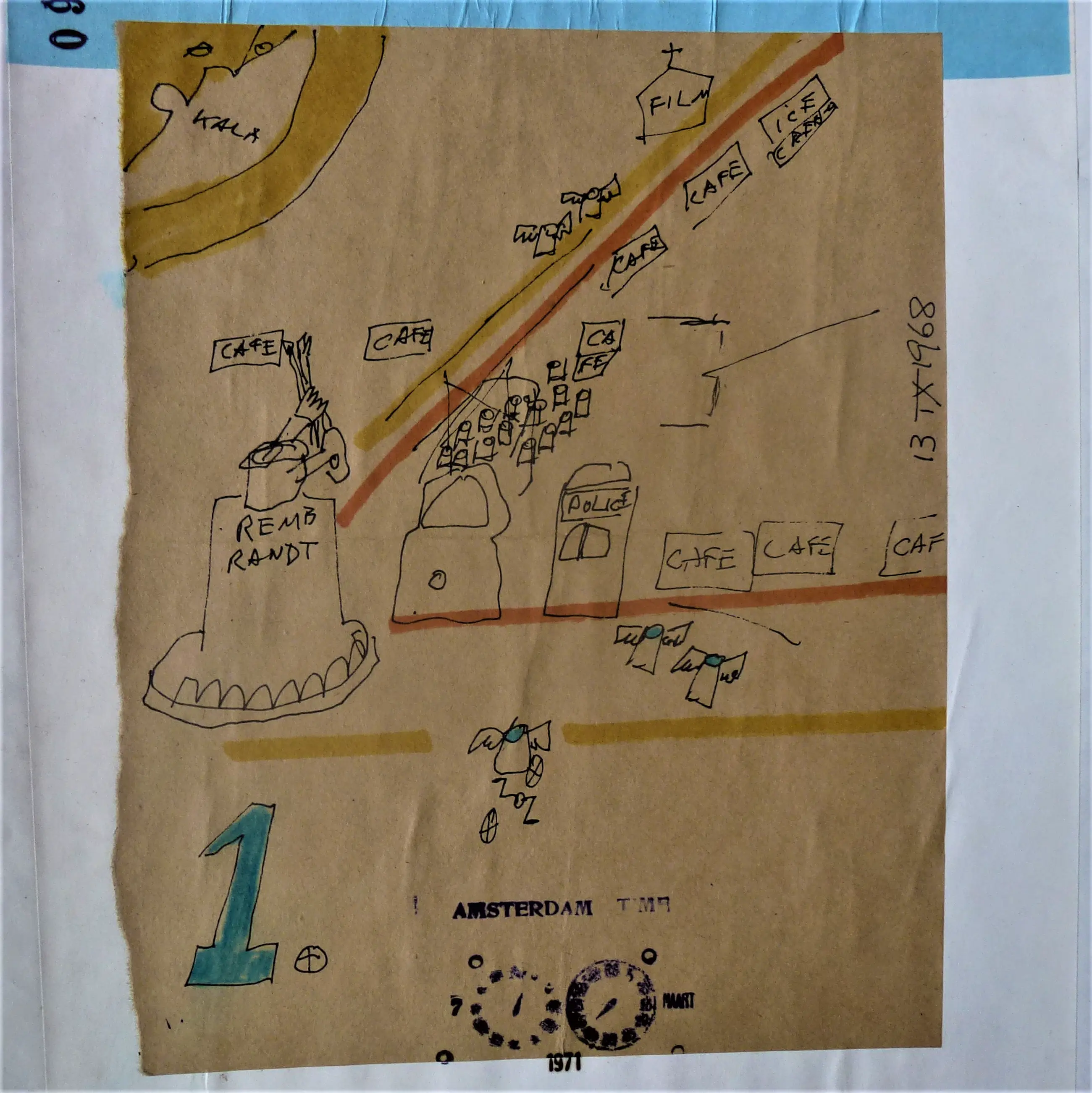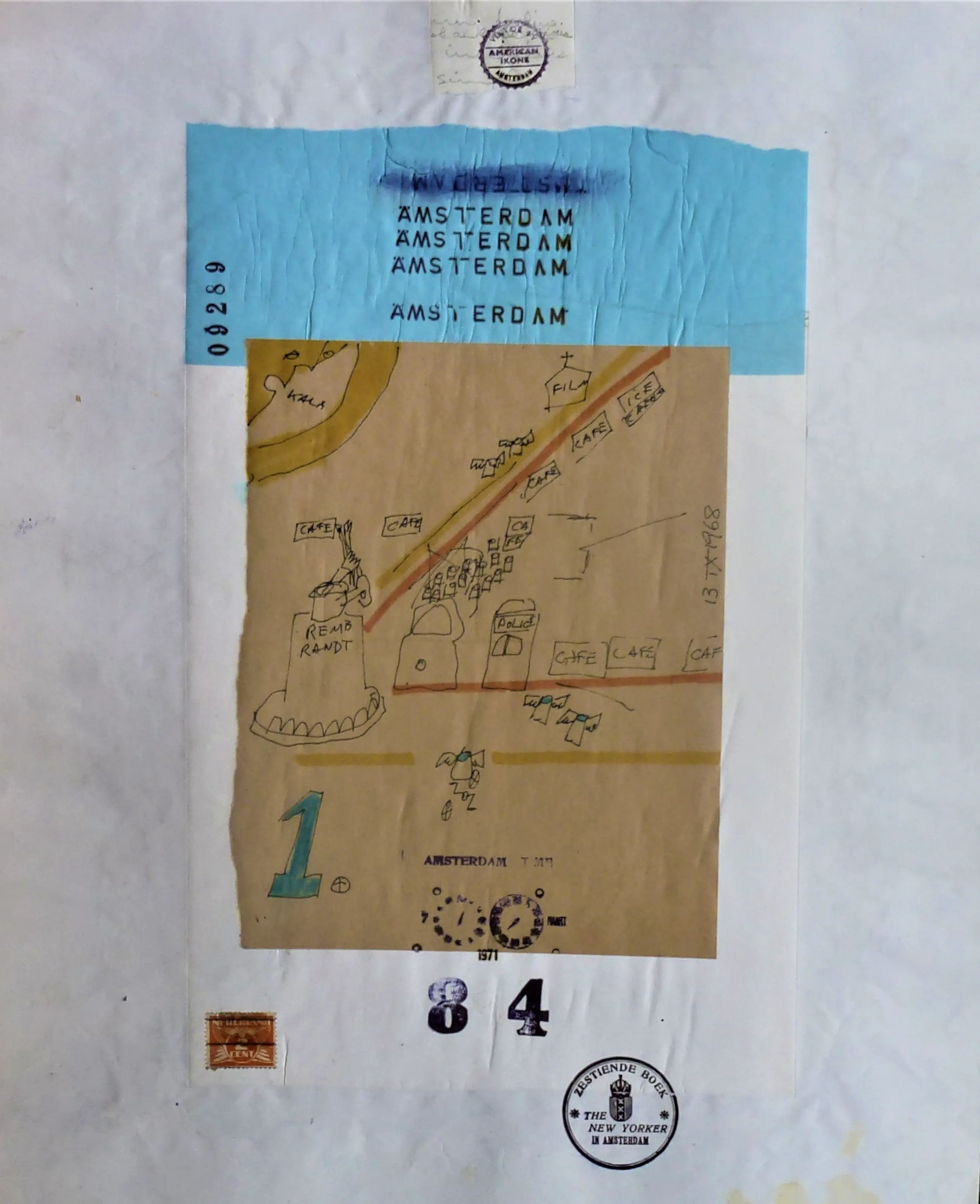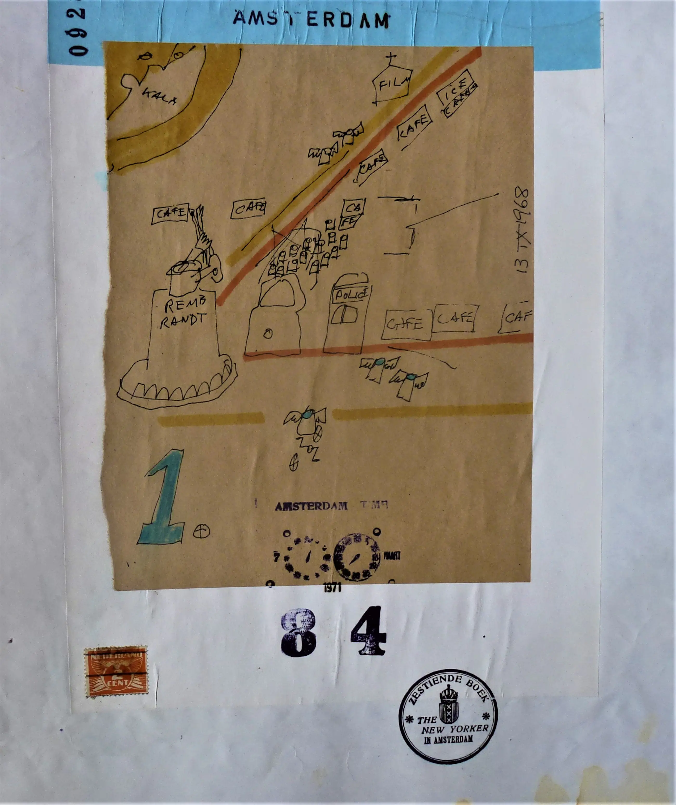 Logboek blad van het schip Henry David Thoreau. Uit het Zestiende Boek The New Yorker in Amsterdam . Geplakt en gestempel door Viktor Four/ Carl Walter Gluck. Gedateerd: 13 IX 1968 Titel : Amsterdam. Rembrandt cafe Afmetingen : 44 .cm x 34,5 cm Genummerd : 84 Conditie : goed Herkomst gekocht in de jaren '70 van de kunstenaar, Wordt aangetekend verzonden