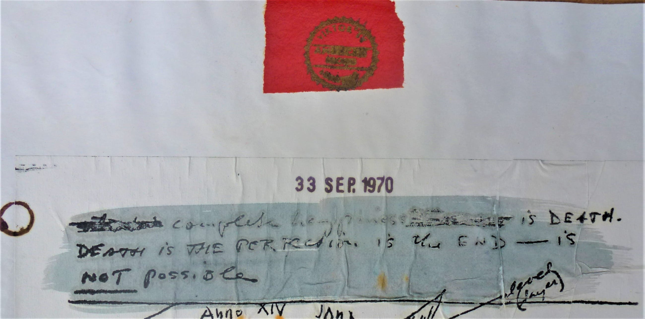Logboek blad van het schip Henry David Thoreau. Uit het achtste boek Please Admit One Elephant Getekend geplakt en gestempel door Viktor Four/ Carl Walter Gluck. Gedateerd: 33 sep 1970 . Titel : Death is the other side of immortal. Afmetingen : 44 cm x 34,5 cm Genummerd : 79 Herkomst gekocht in de jaren '70 van de kunstenaar, Wordt aangetekend verzonden