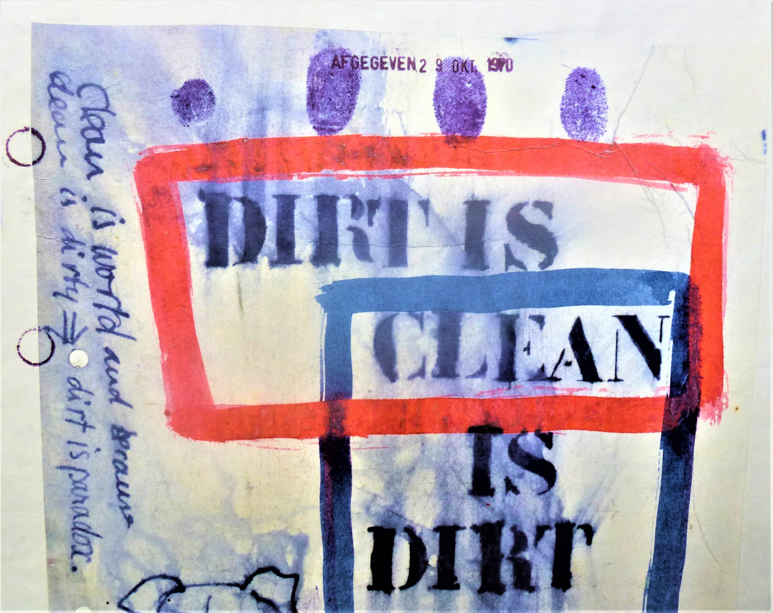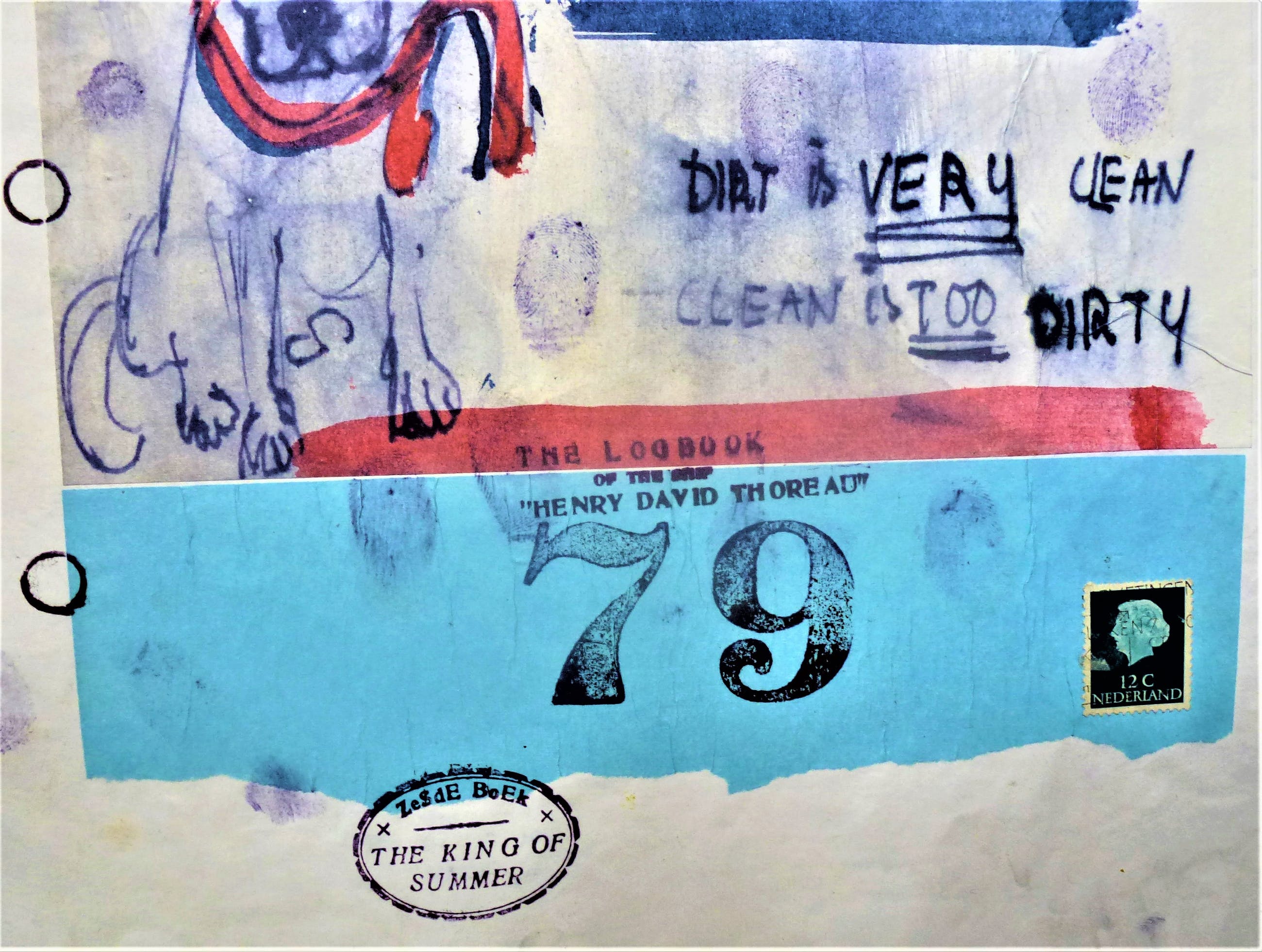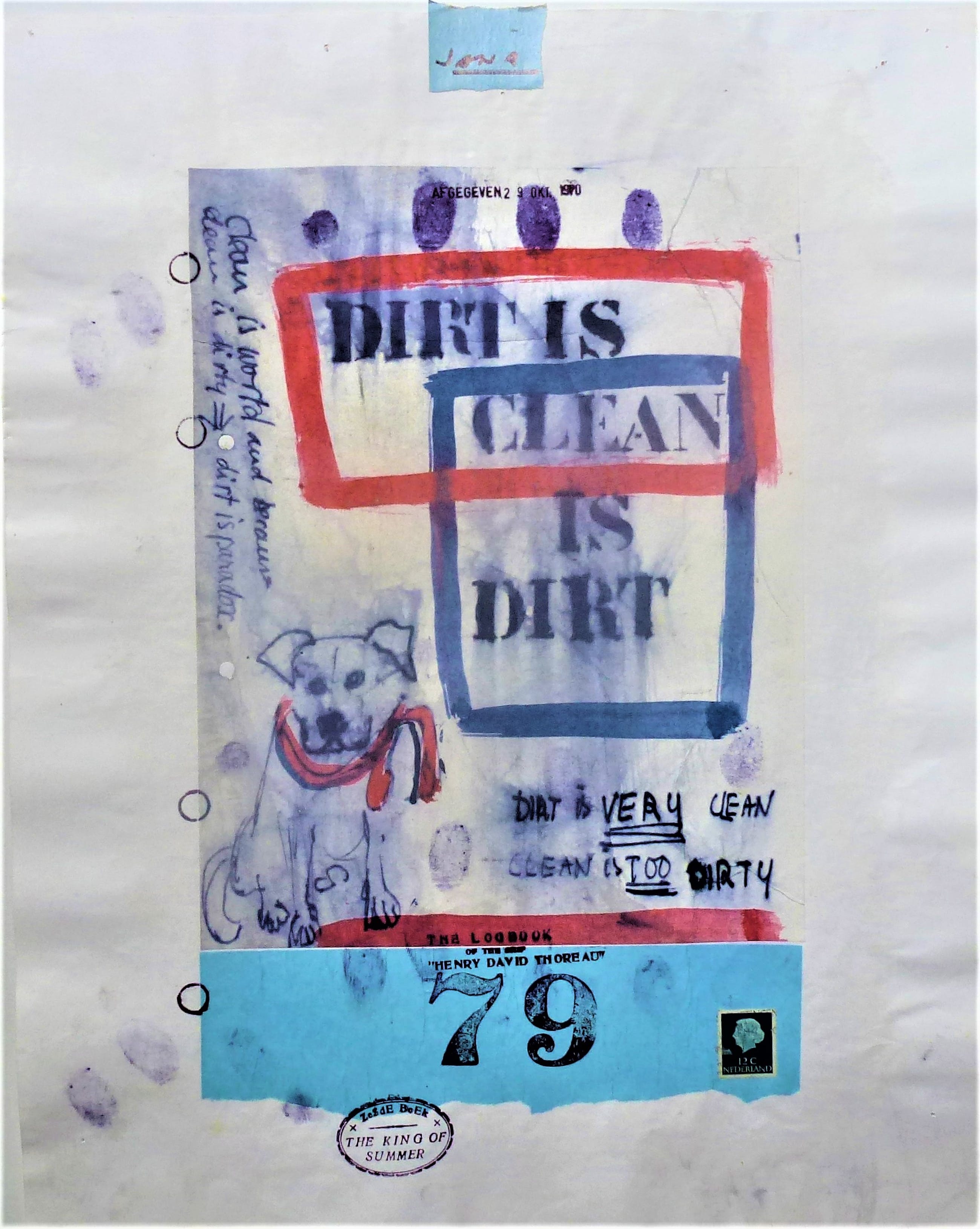Logboek blad van het schip Henry David Thoreau. Uit het zesde boek The King of Summer Getekend geplakt en gestempel door Viktor Four/ Carl Walter Gluck. Gedateerd 29 Okt 1970 . Titel : DIRT IS CLEAN CLEAN IS DIRT . Afmetingen : 44 cm x 34,5 cm Genummerd : 79 Herkomst gekocht in de jaren '70 van de kunstenaar, Wordt aangetekend verzonden