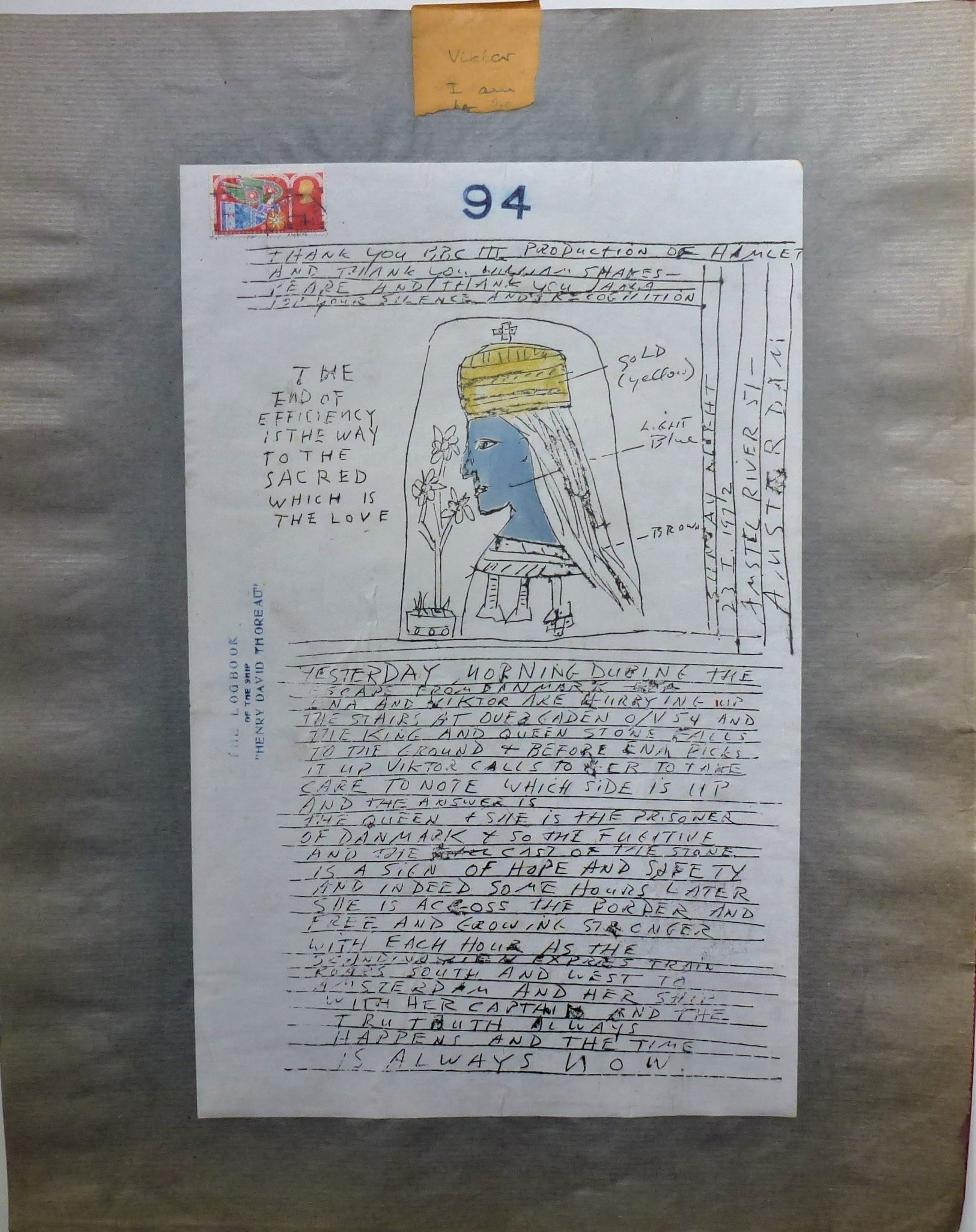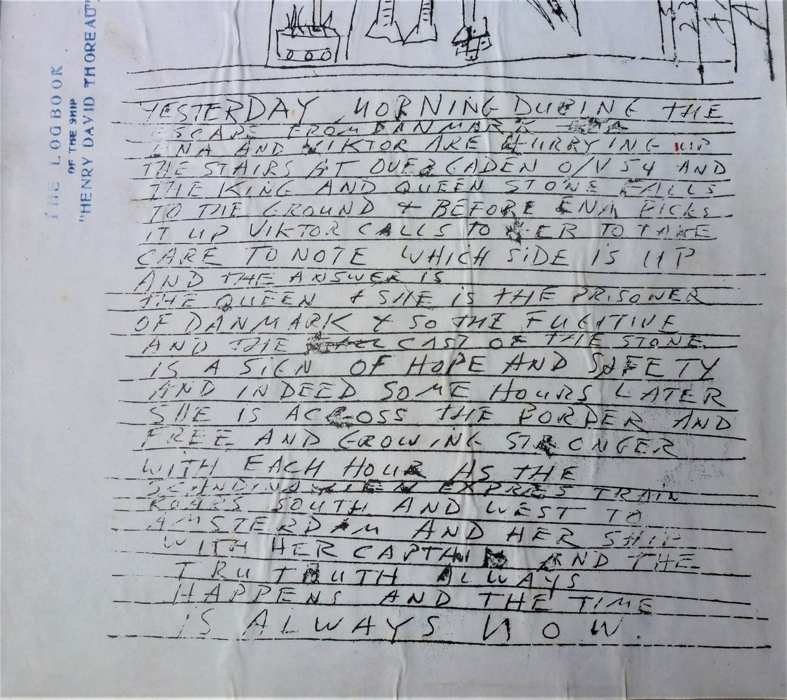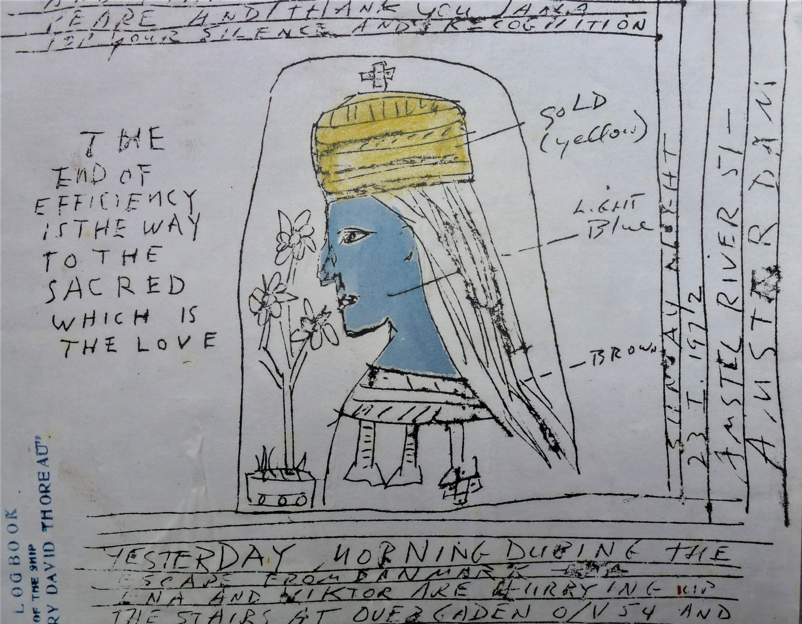 Logboek blad van het schip Henry David Thoreau. Getekend geplakt en gestempel door Viktor Four/ Carl Walter Gluck. Gedateerd : 23 januari 1972 The end of efficiency is the way to the sacred which is the love . Afmetingen : 43,5 cm x 34 cm Genummerd :94 Herkomst gekocht in de jaren '70 van de kunstenaar, Wordt aangetekend verzonden