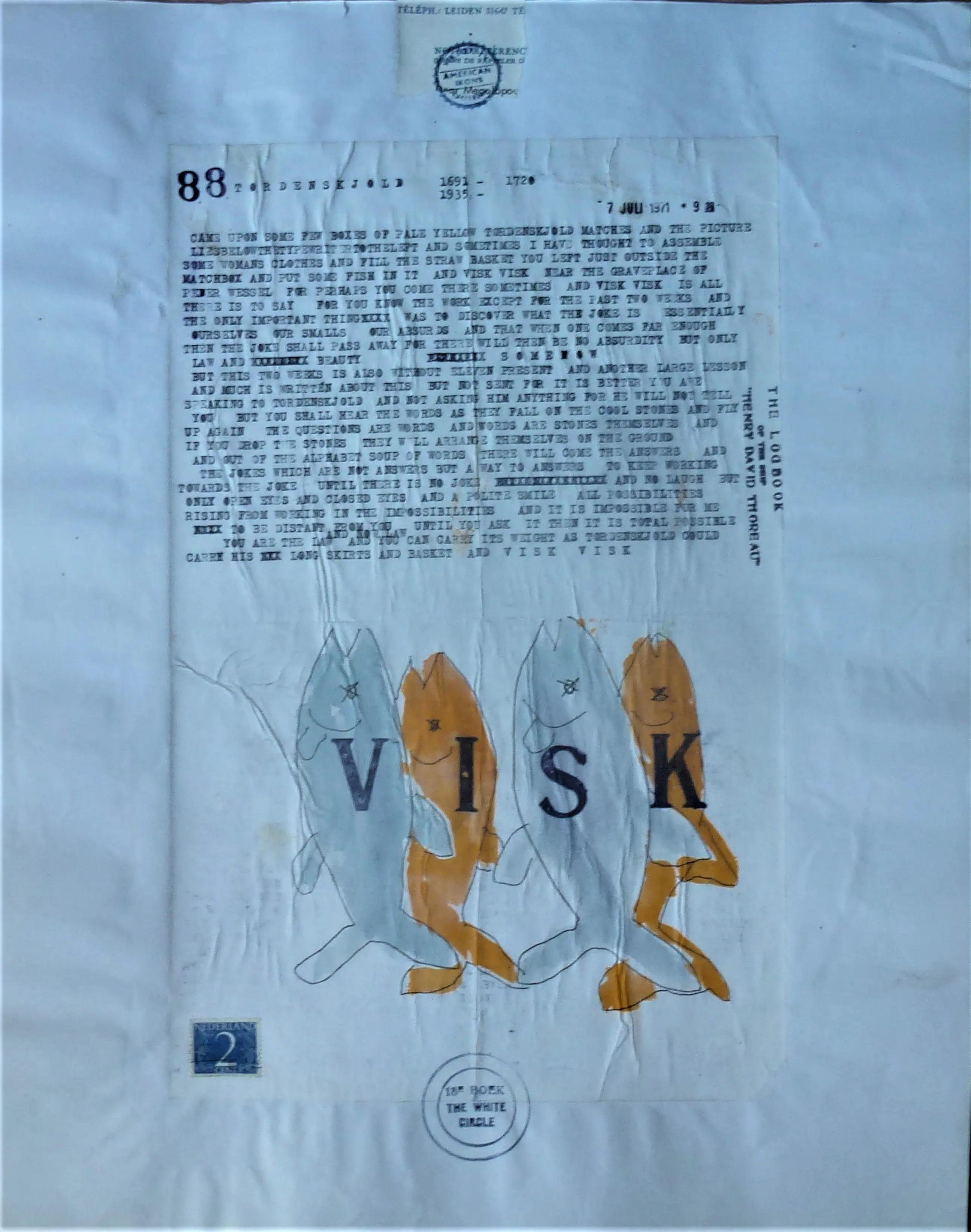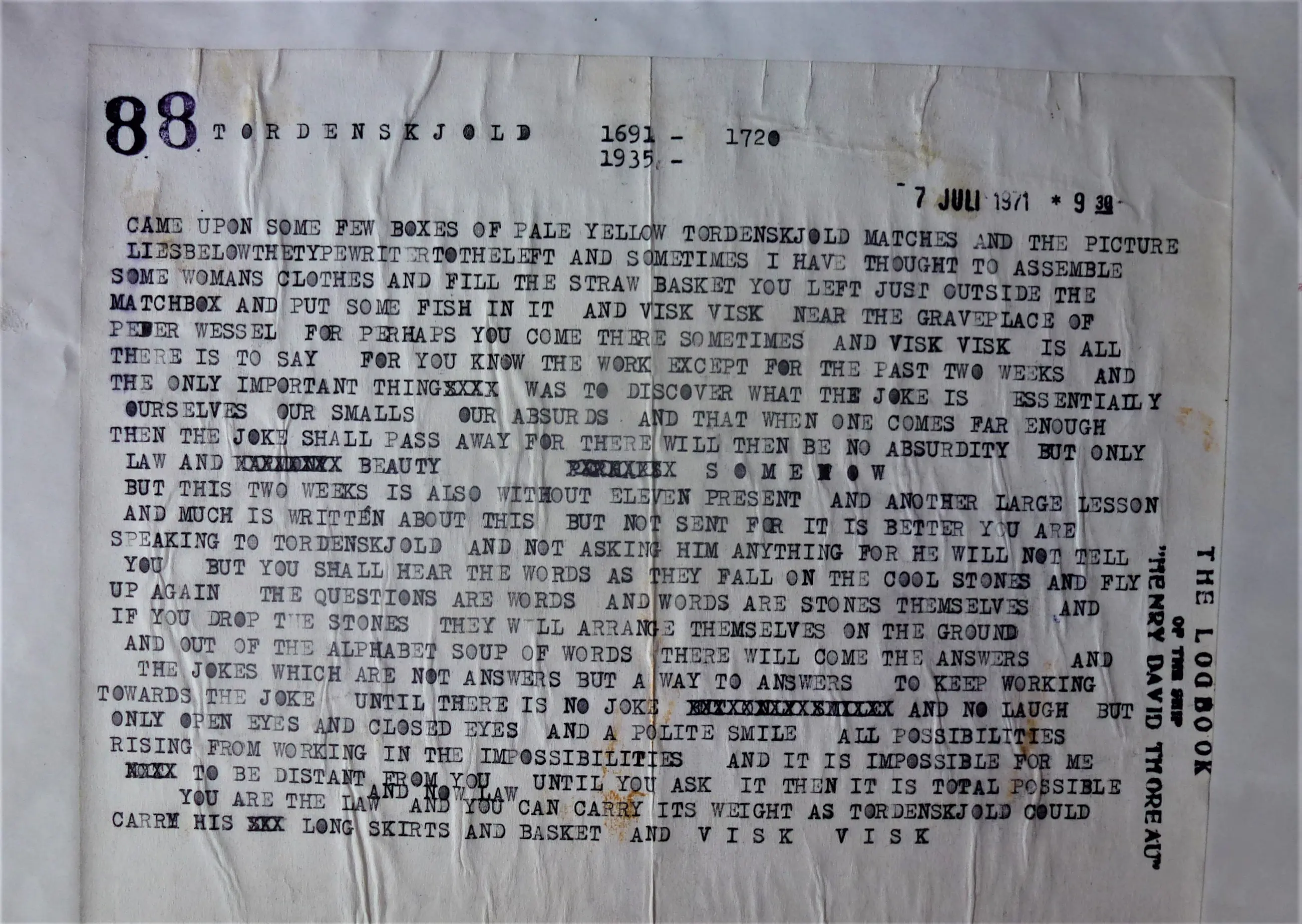 Logboek blad van het schip Henry David Thoreau . Uit het 18e boek The White Circle. Gedateerd 7 juli 1971. Tekst : TORDENSKJOLD VISK Genummerd 88 Getekend gestempeld en geplakt door Viktor IV /Walter Carl Gluck Afmetingen : 43,5 cm x 34,5 cm. Conditie : goed. Herkomst : Gekocht in de jaren '70 van de kunstenaar Wordt aangetekend verzonden .