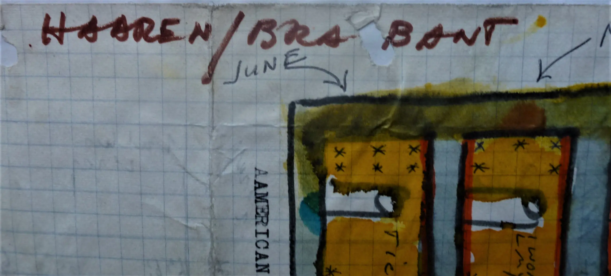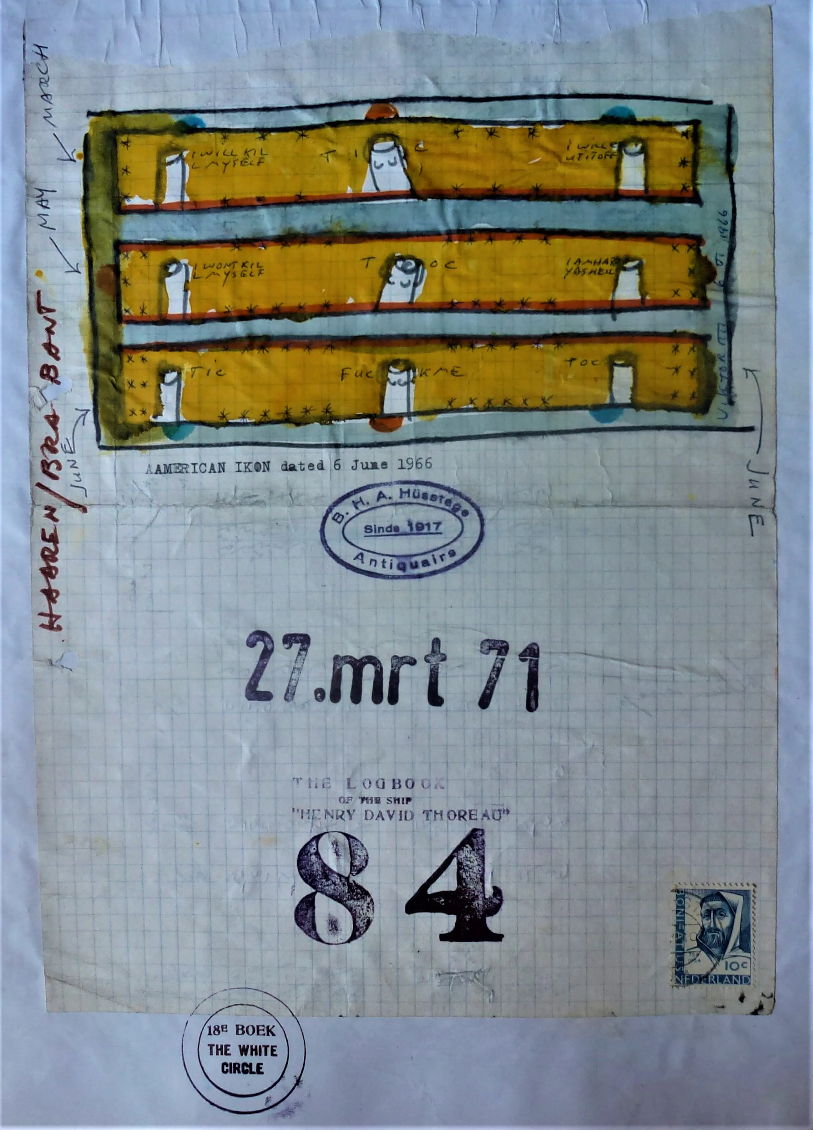 Logboek blad van het schip Henry David Thoreau . Uit het 18e boek The White Circle. Gedateerd 27. mrt 71. Tekst :American Ikon dated 6 june 1966 Haaren/Brabant Genummerd 84 Getekend gestempeld en geplakt door Viktor IV /Walter Carl Gluck Afmetingen : 43,5 cm x 34,5 cm. Conditie : goed. Herkomst : Gekocht in de jaren '70 van de kunstenaar Wordt aangetekend verzonden .