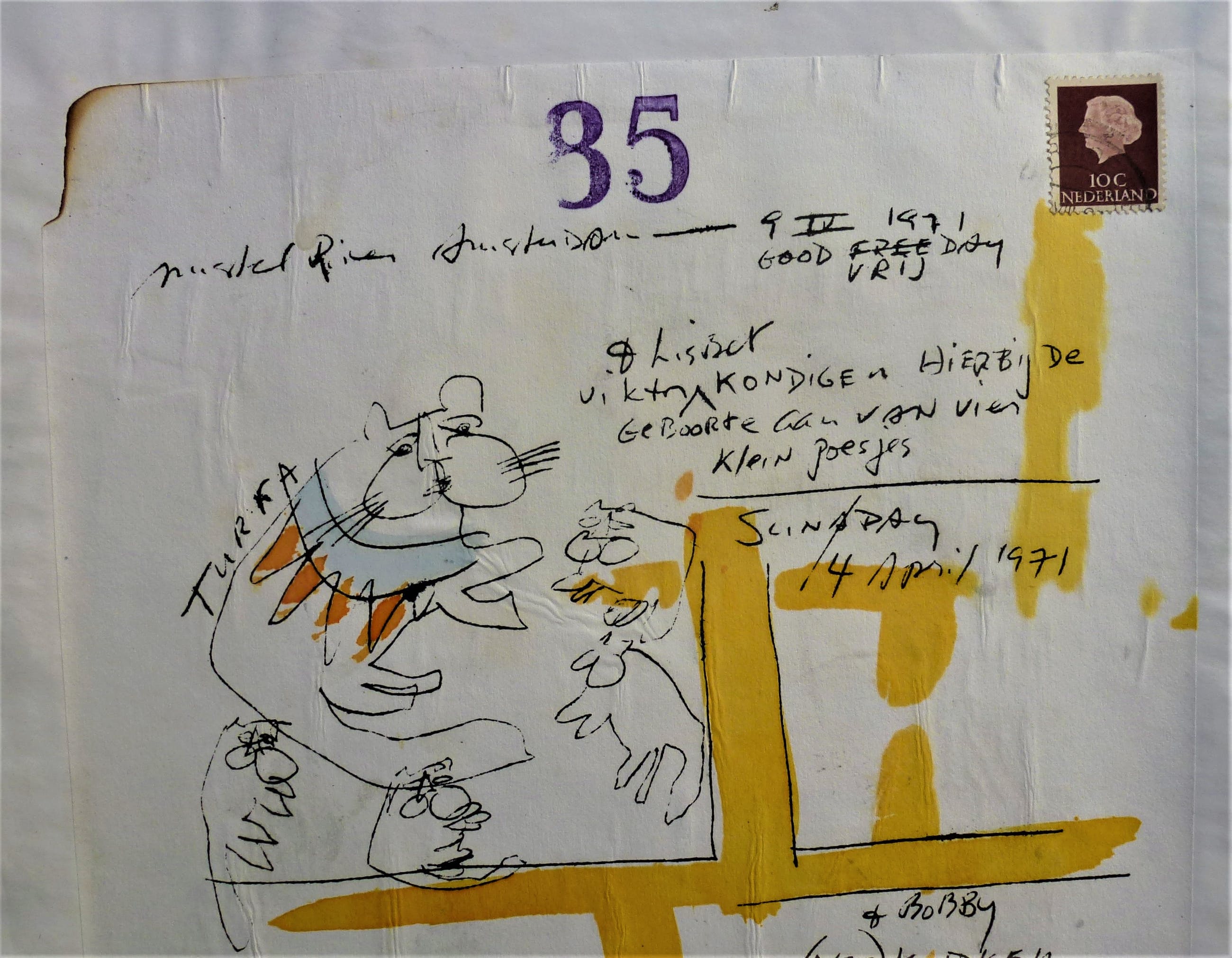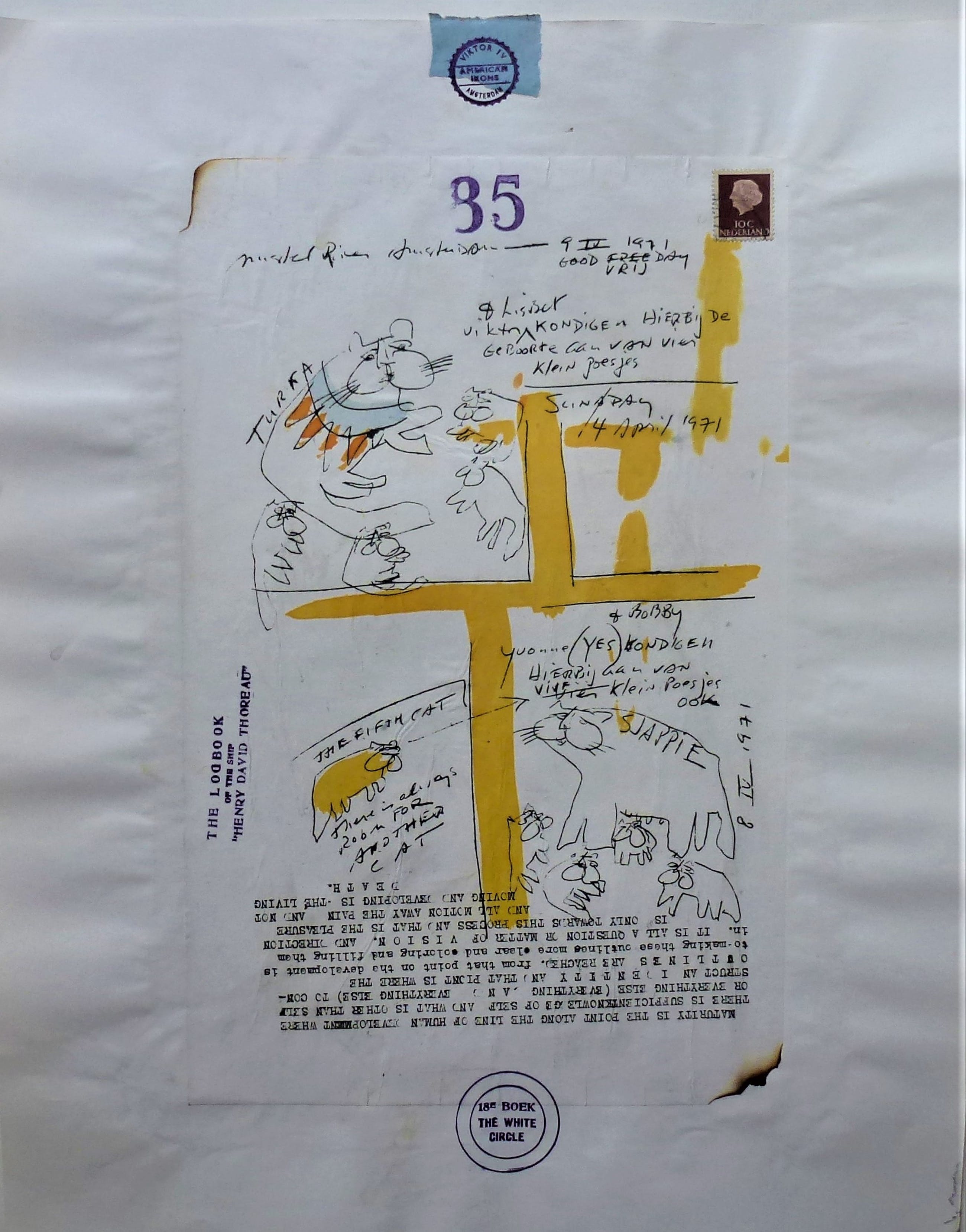 Logboek blad van het schip Henry David Thoreau. Uit het 18e boek The White Circle . Getekend geplakt en gestempel door Viktor Four/ Carl Walter Gluck. Gedateerd :Sunday 4 april 1971 . Titel :Viktor & Lisbet kondigen de geboorte aan van 4 klein poesjes . Afmetingen : 44 cm x 34,5 cm Genummerd 85 . Herkomst gekocht in de jaren '70 van de kunstenaar, Wordt aangetekend verzonden