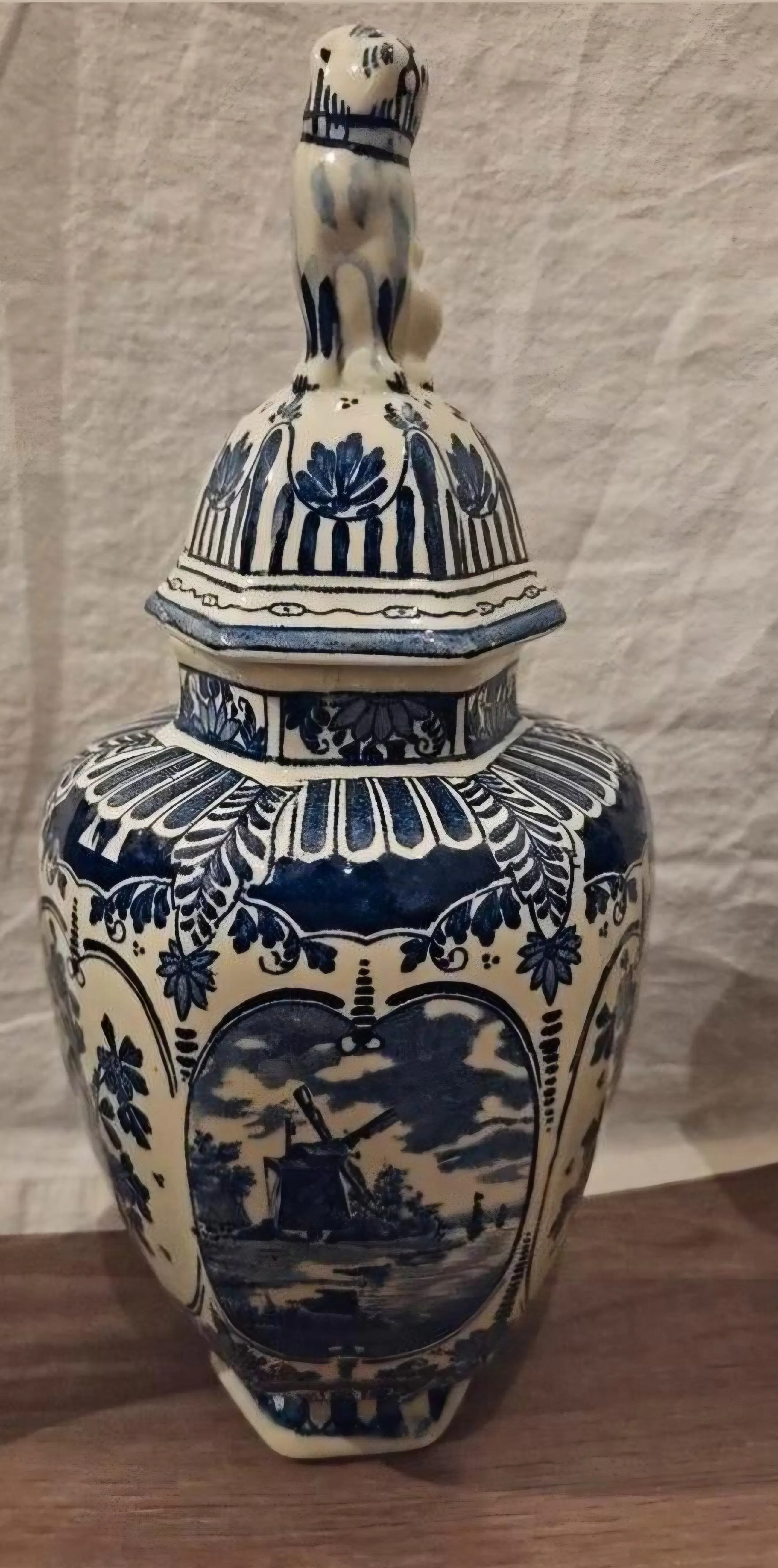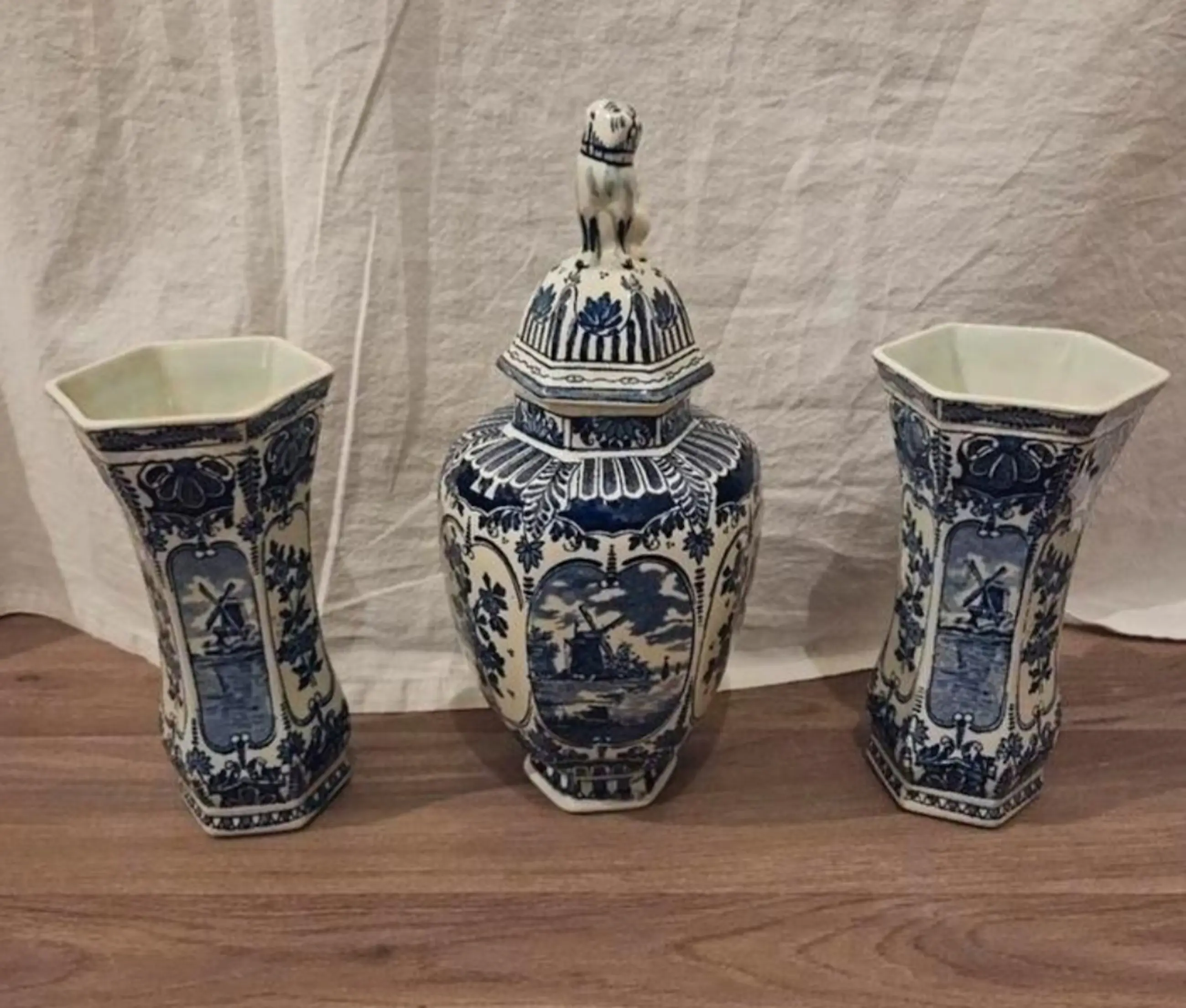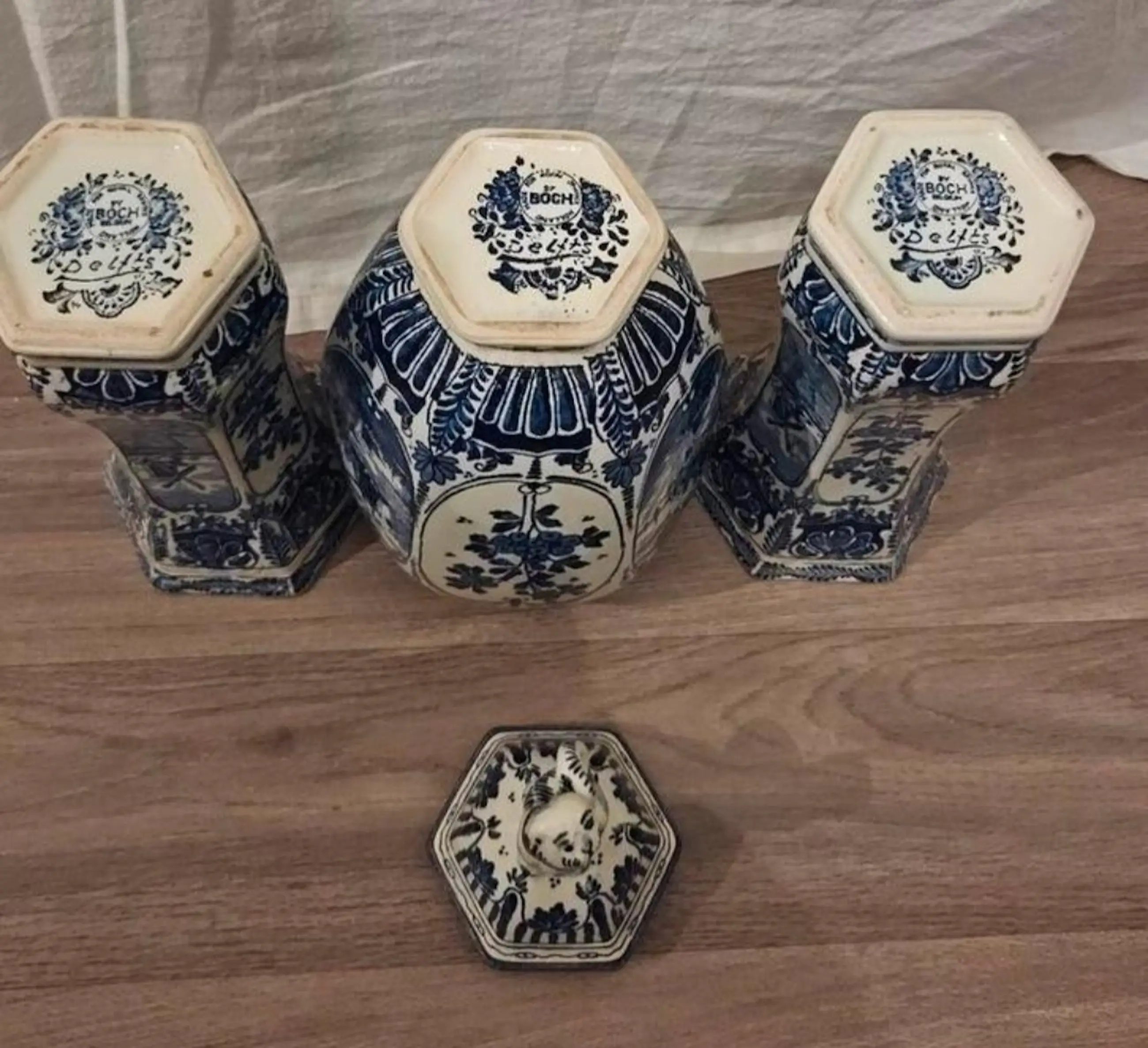 Dit is een Delfts Blauw kaststel gemaakt door Boch in opdracht van Royal Sphinx Holland. Het betreft een driedelig stel bestaande uit twee bekervazen en een dekselvaas, met een traditioneel Hollands landschap decor inclusief molens. Productinformatie Producent: Boch Frères Kéramis (België) voor Royal Sphinx (Maastricht, Nederland). Periode: Veel van deze sets dateren uit de jaren 50 of 60, of tussen 1969 en 1979. Materiaal: Aardewerk of porselein, vaak handgeschilderd of met transferware decoratie. Kenmerken: De vazen zijn zeshoekig gevormd en de deksel van de middelste vaas is voorzien van een figuur, vaak een 'Foo Dog' of leeuw genoemd. Decoratie: Typische Delfts blauwe voorstellingen van windmolens, waterlandschappen en bloemmotieven.