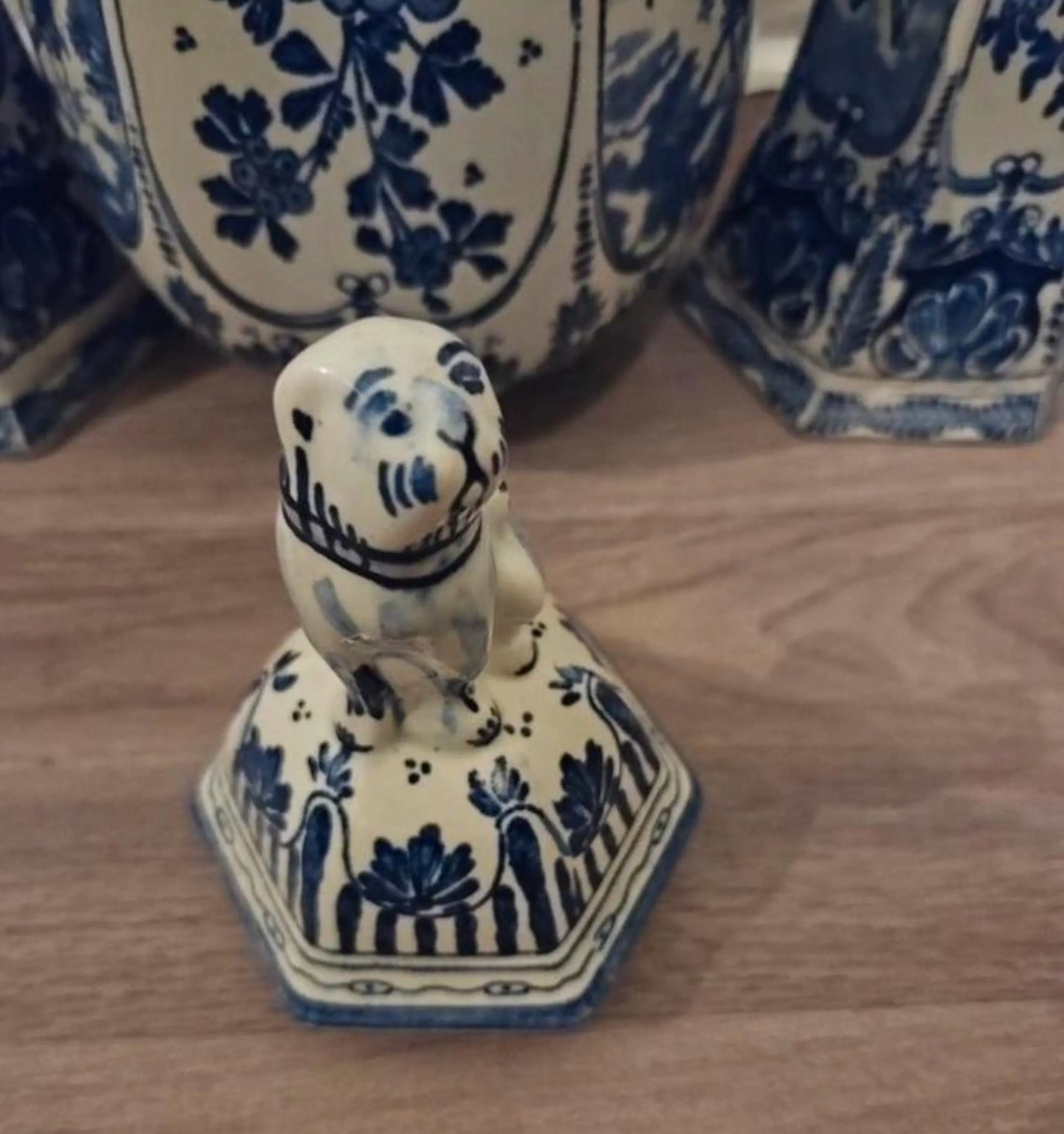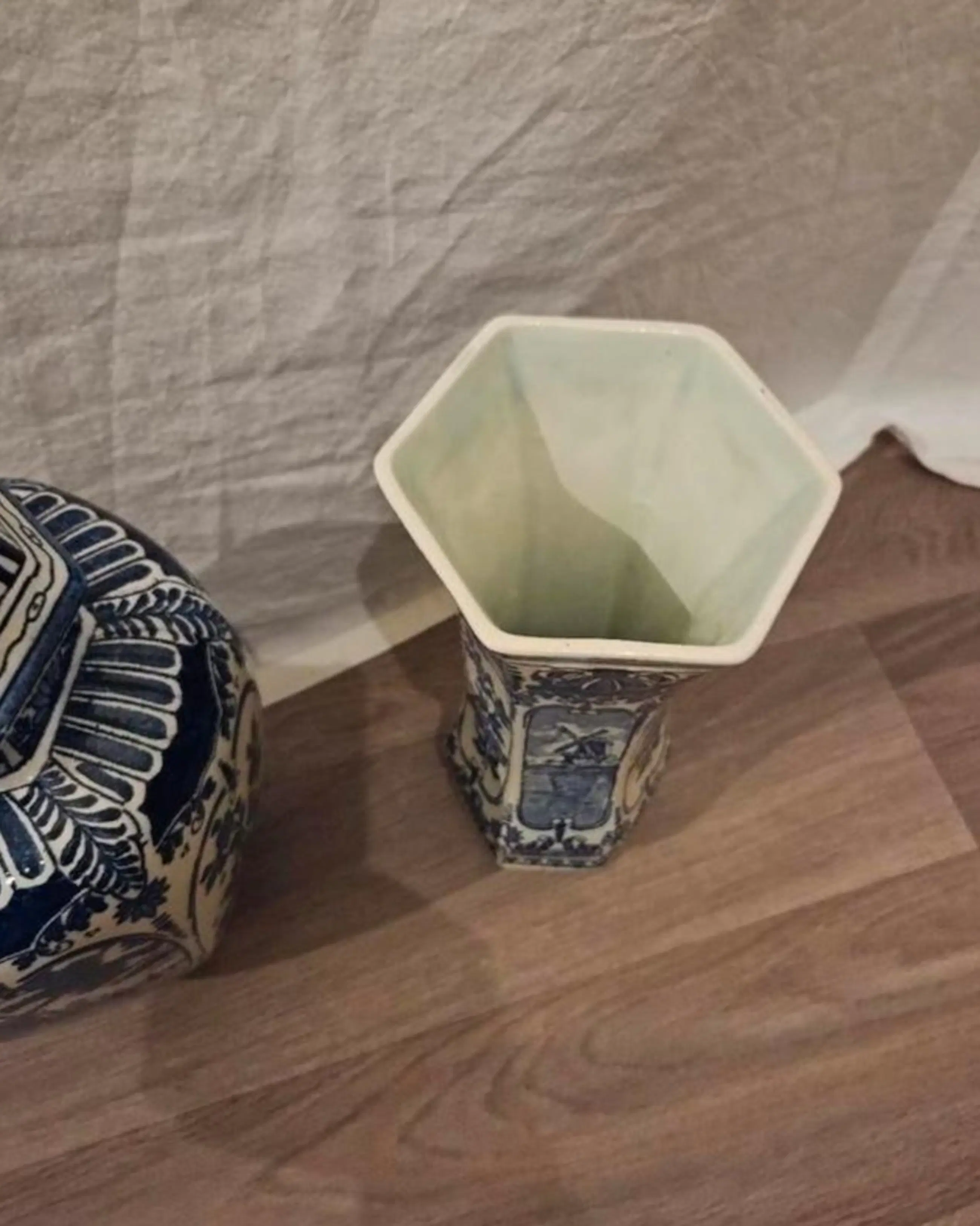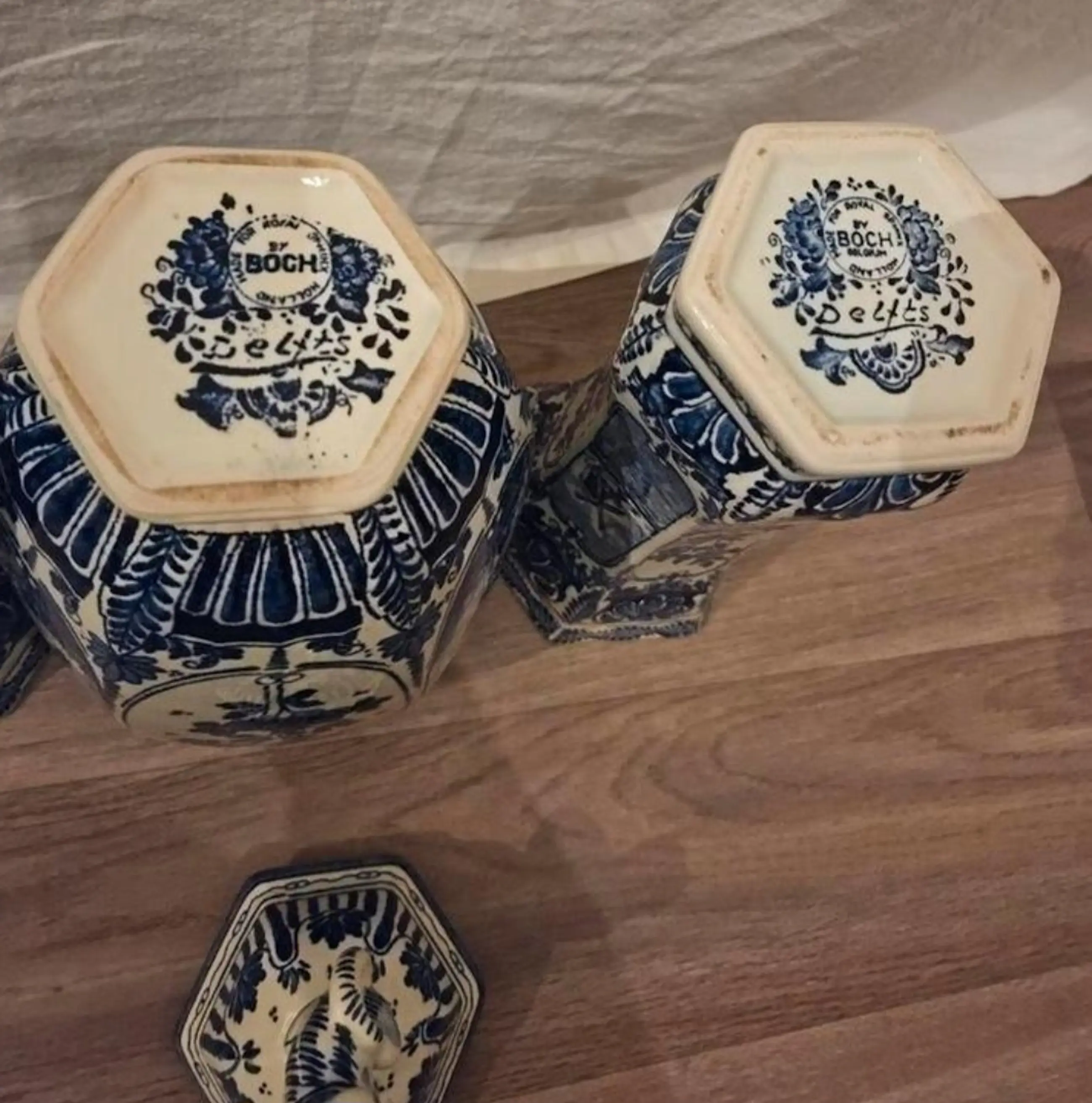 Dit is een Delfts Blauw kaststel gemaakt door Boch in opdracht van Royal Sphinx Holland. Het betreft een driedelig stel bestaande uit twee bekervazen en een dekselvaas, met een traditioneel Hollands landschap decor inclusief molens. Productinformatie Producent: Boch Frères Kéramis (België) voor Royal Sphinx (Maastricht, Nederland). Periode: Veel van deze sets dateren uit de jaren 50 of 60, of tussen 1969 en 1979. Materiaal: Aardewerk of porselein, vaak handgeschilderd of met transferware decoratie. Kenmerken: De vazen zijn zeshoekig gevormd en de deksel van de middelste vaas is voorzien van een figuur, vaak een 'Foo Dog' of leeuw genoemd. Decoratie: Typische Delfts blauwe voorstellingen van windmolens, waterlandschappen en bloemmotieven.