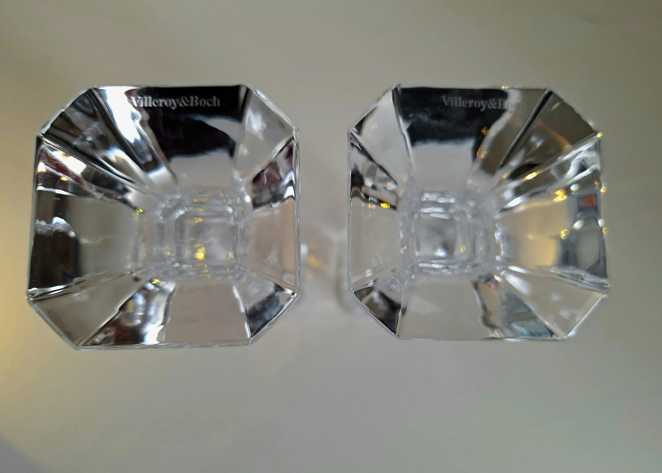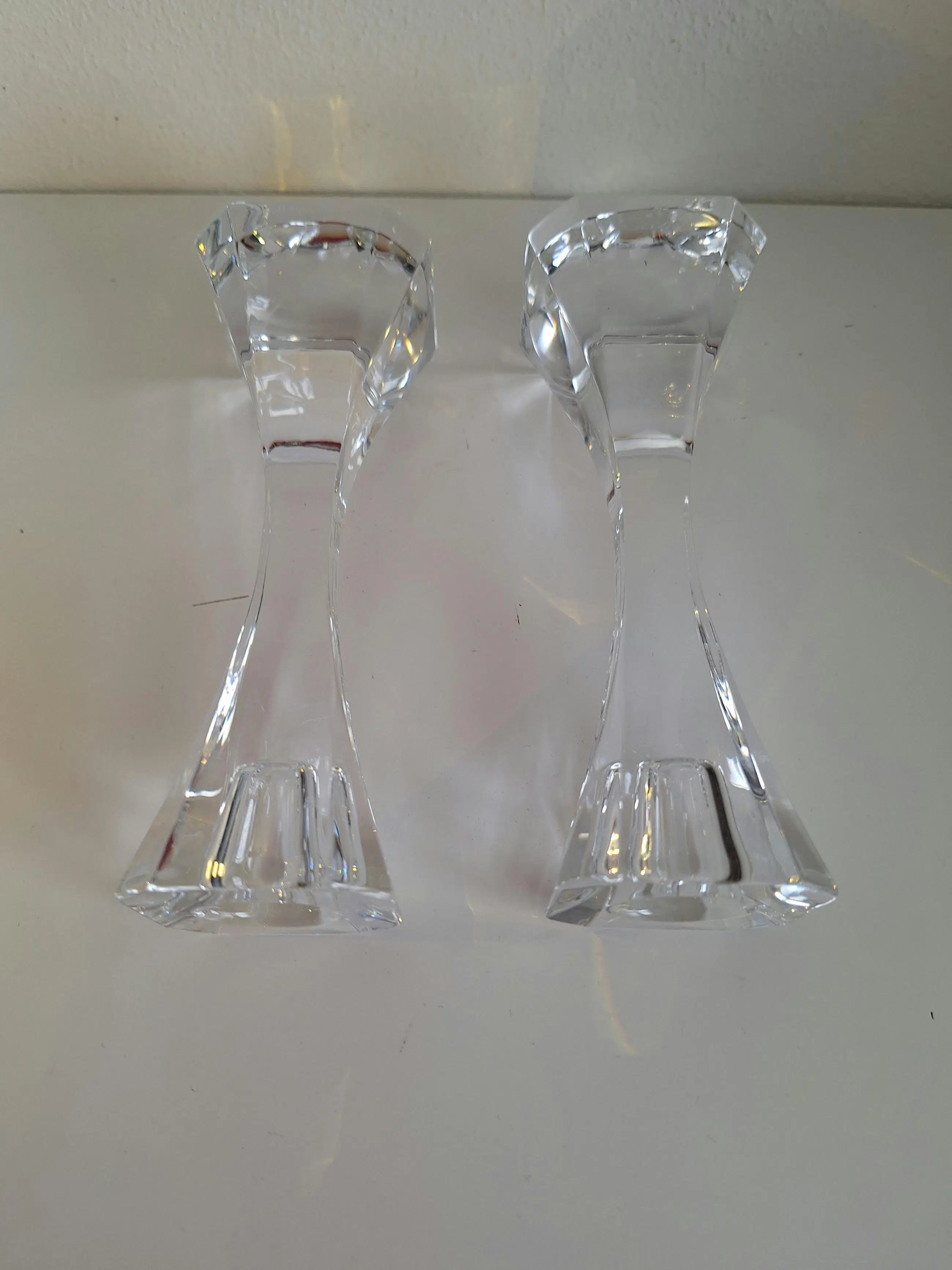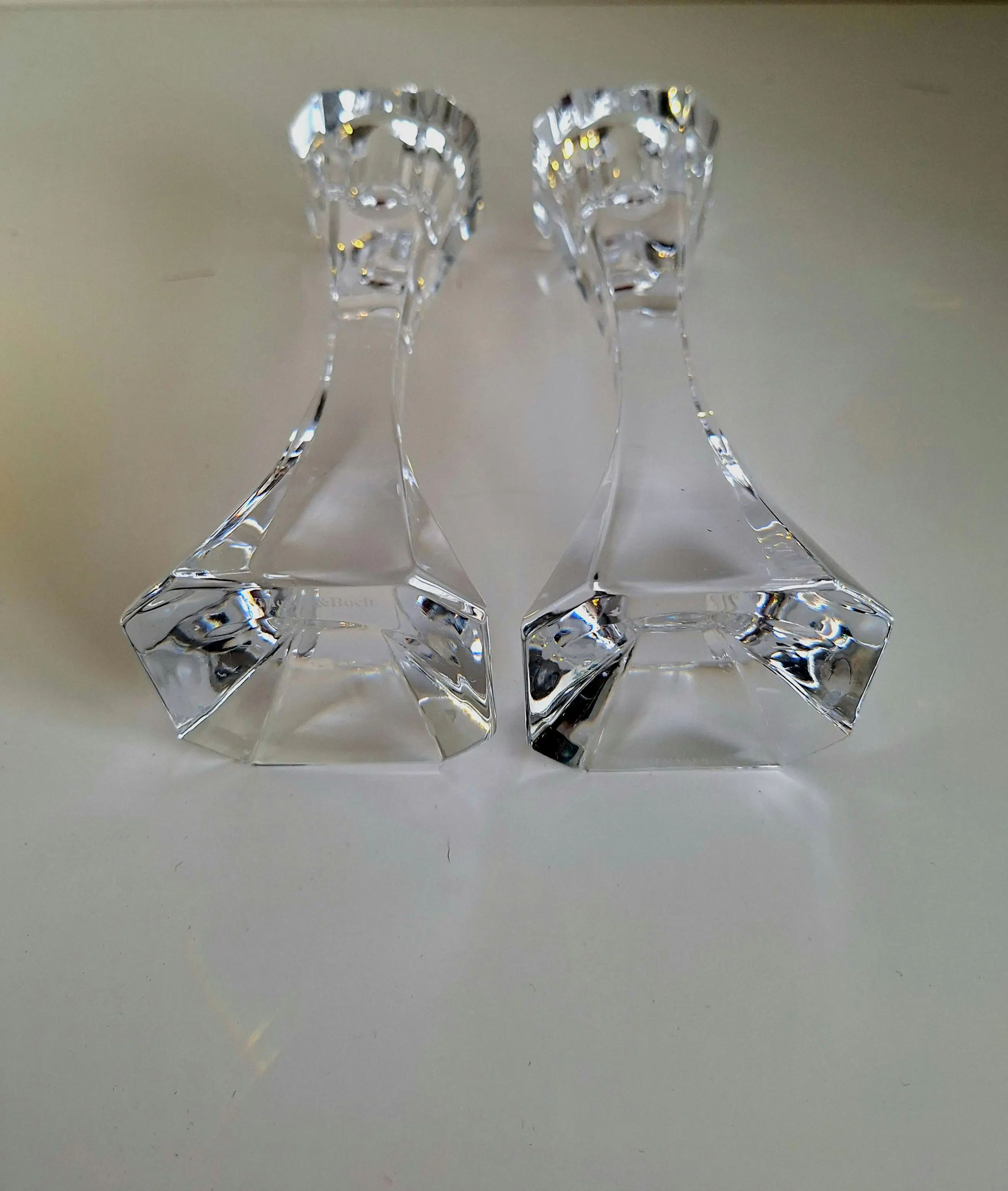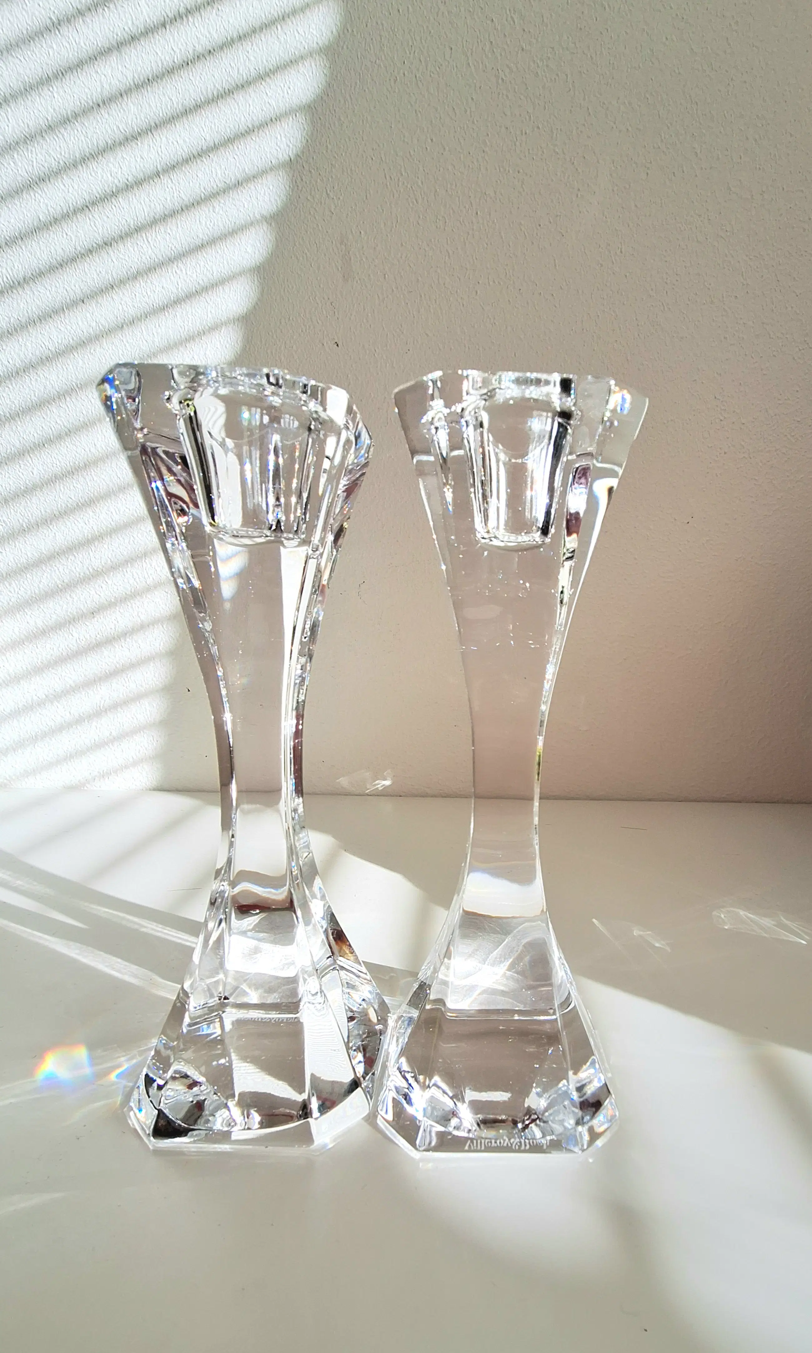 Van het fijnste kristal vervaardigd; twee kaarsenstandaards van Villeroy en Boch.