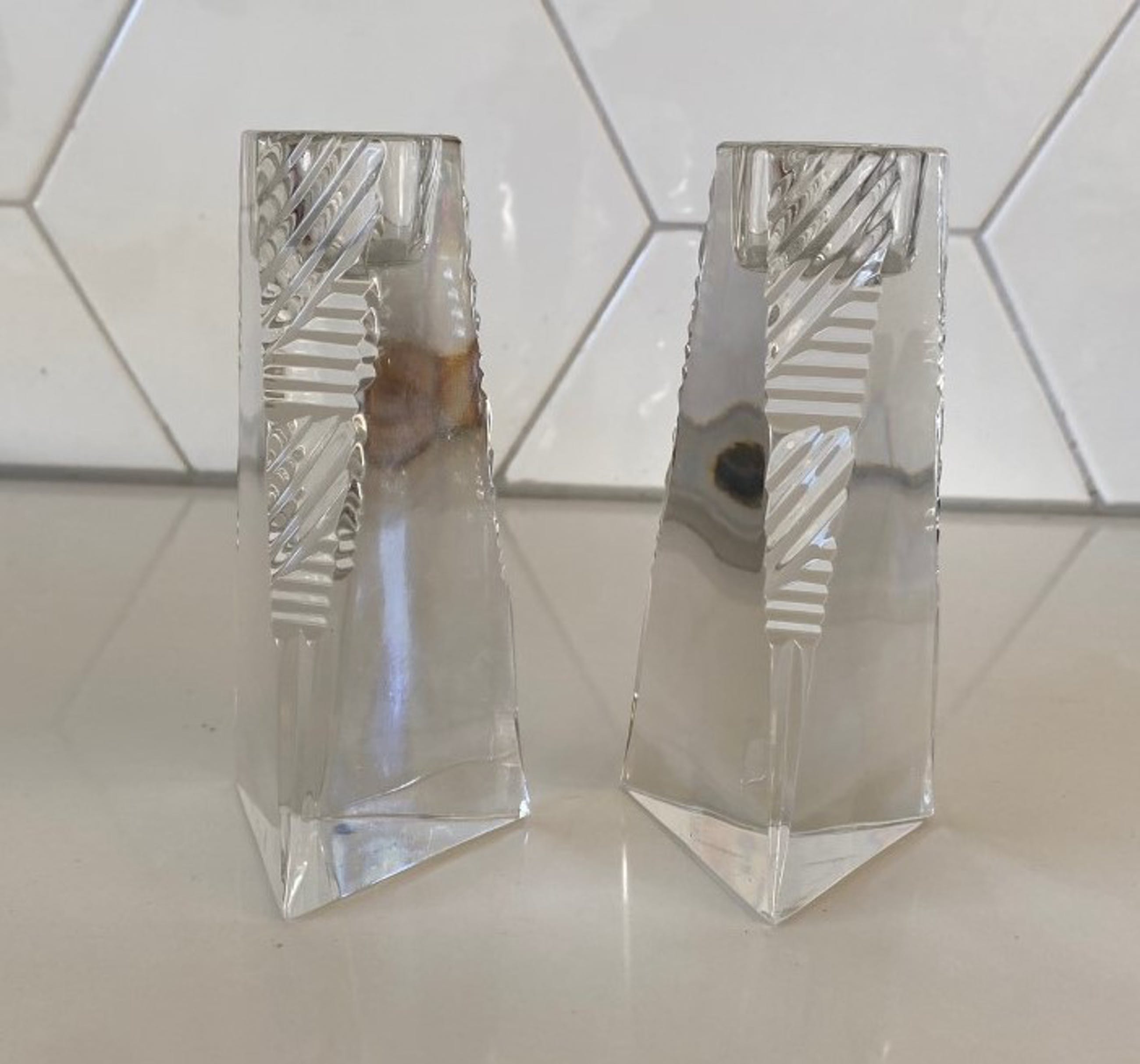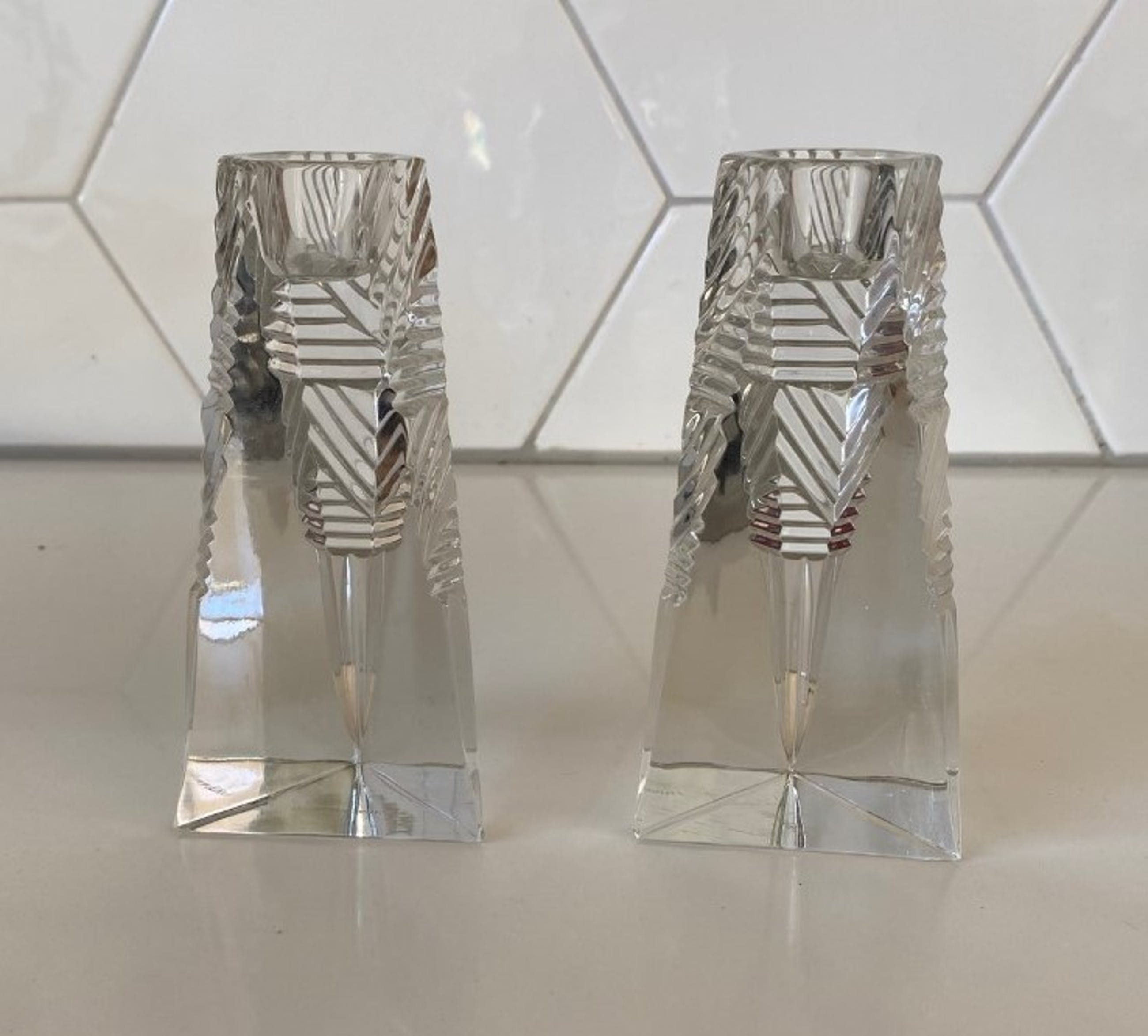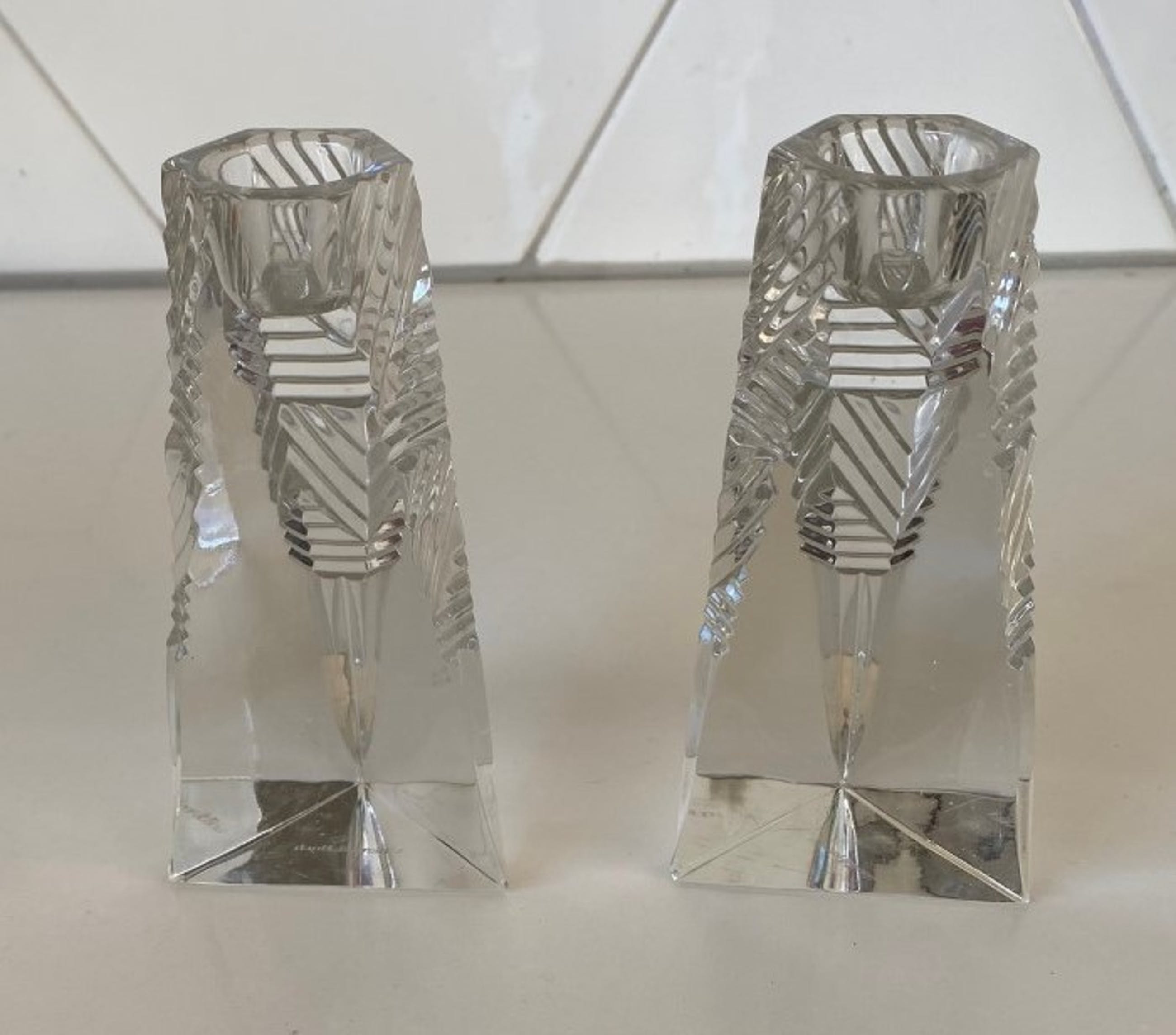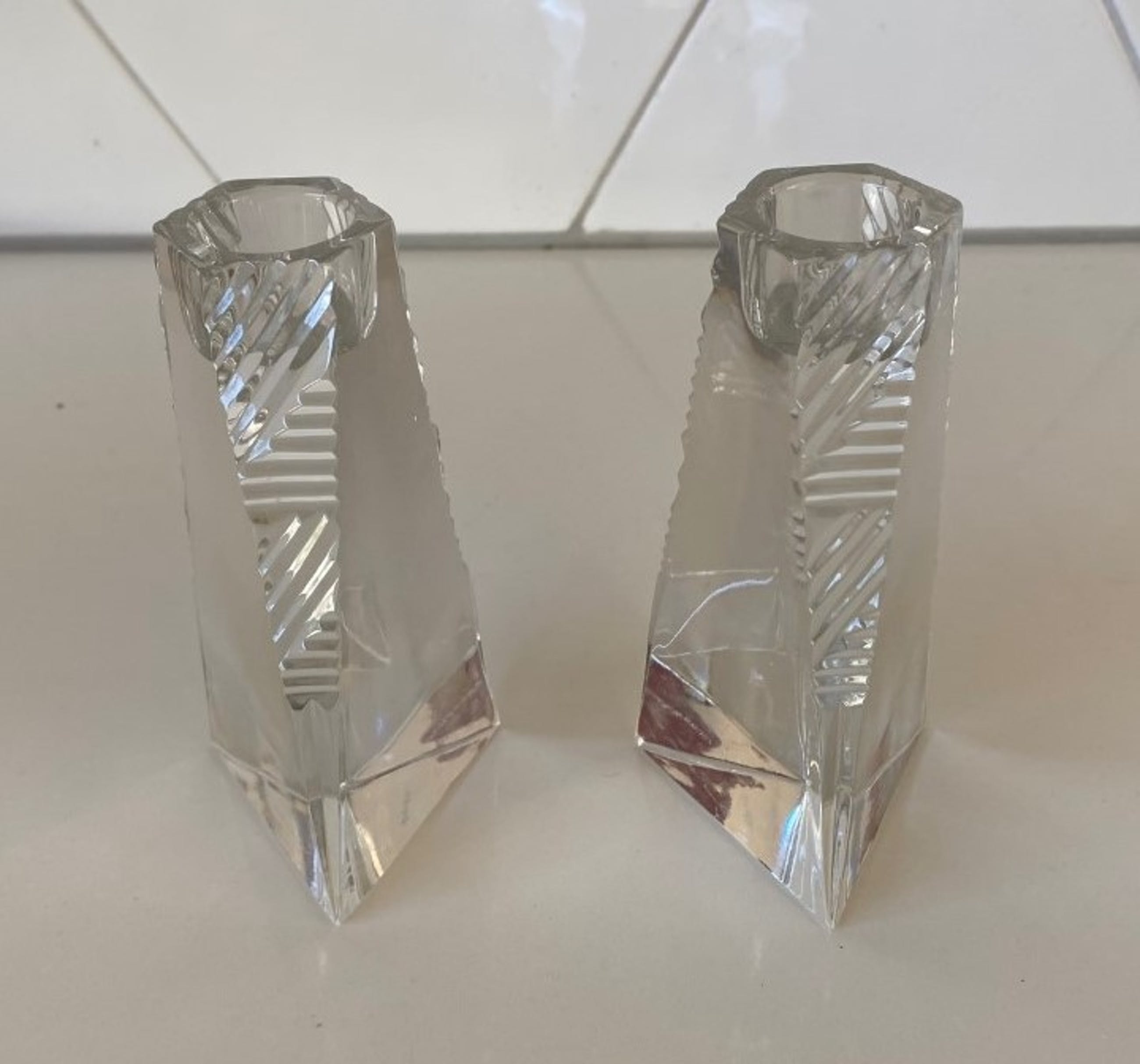 Villeroy & Boch - Twee kristallen Prisma kandelaren. De kandelaren zijn in art deco stijl geslepen en drie hoekig, beide kandelaren hebben een stootplekje op een van de drie hoeken bij de voet. Beide kandelaren zijn gemerkt met een etsmerk.