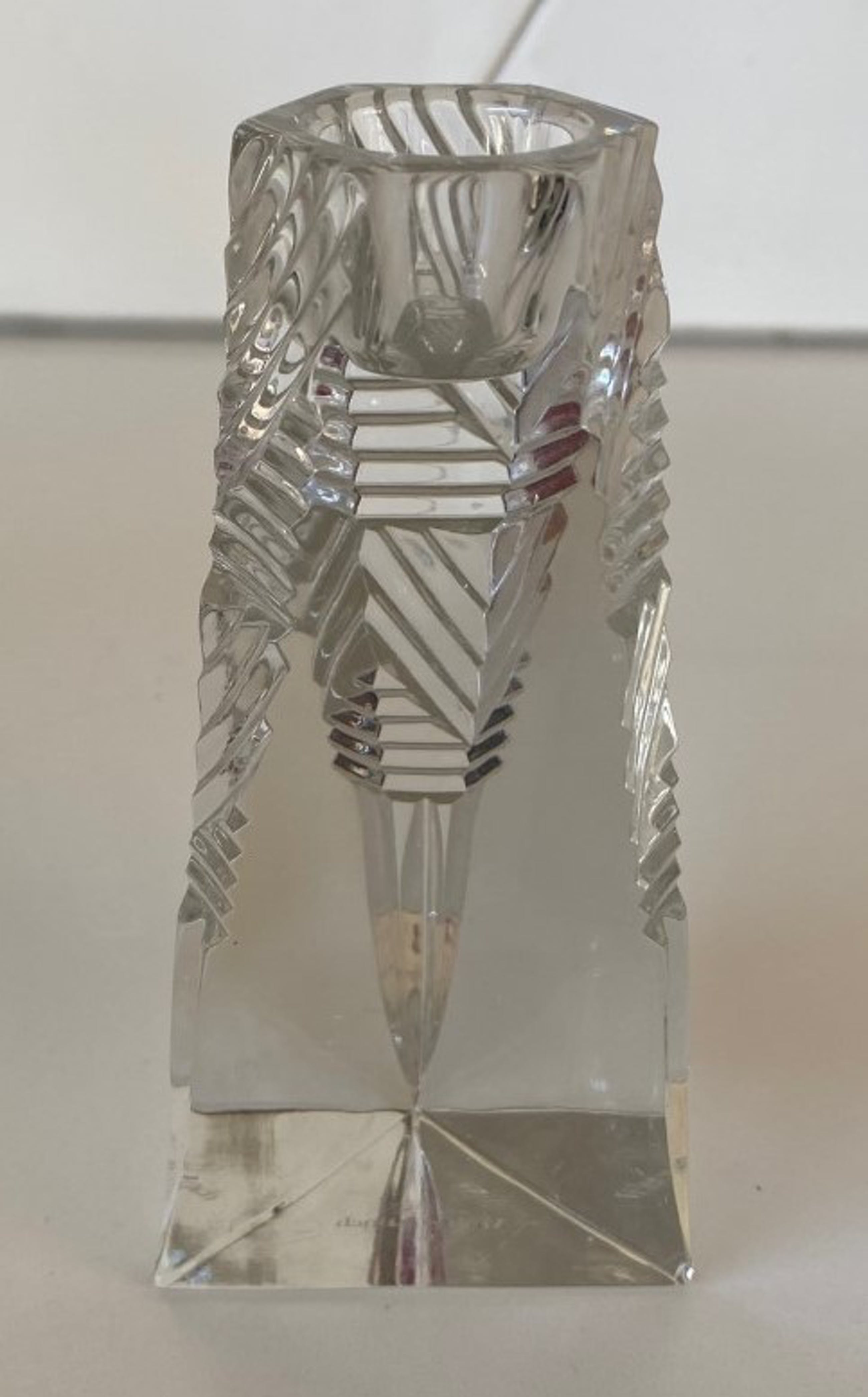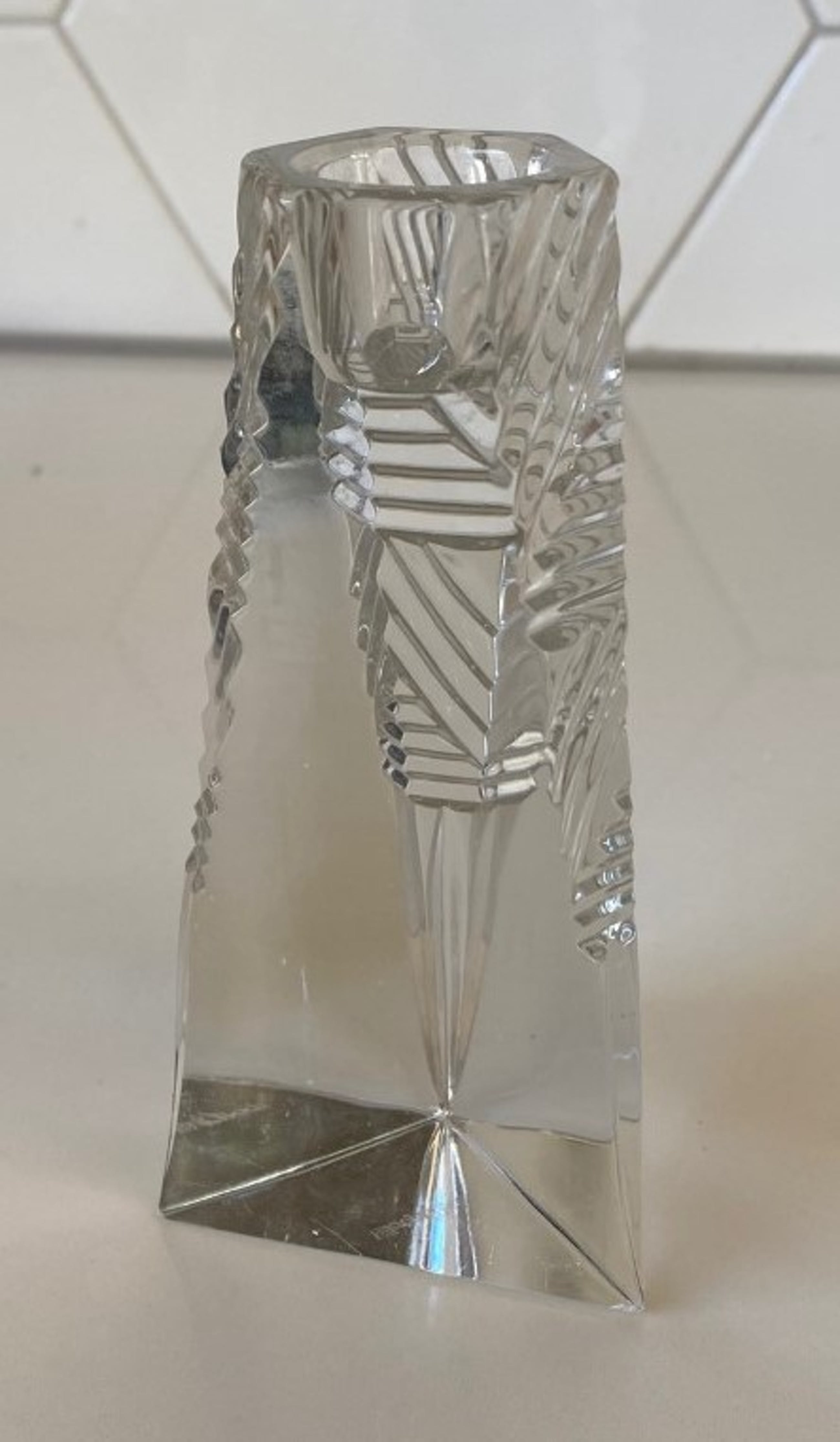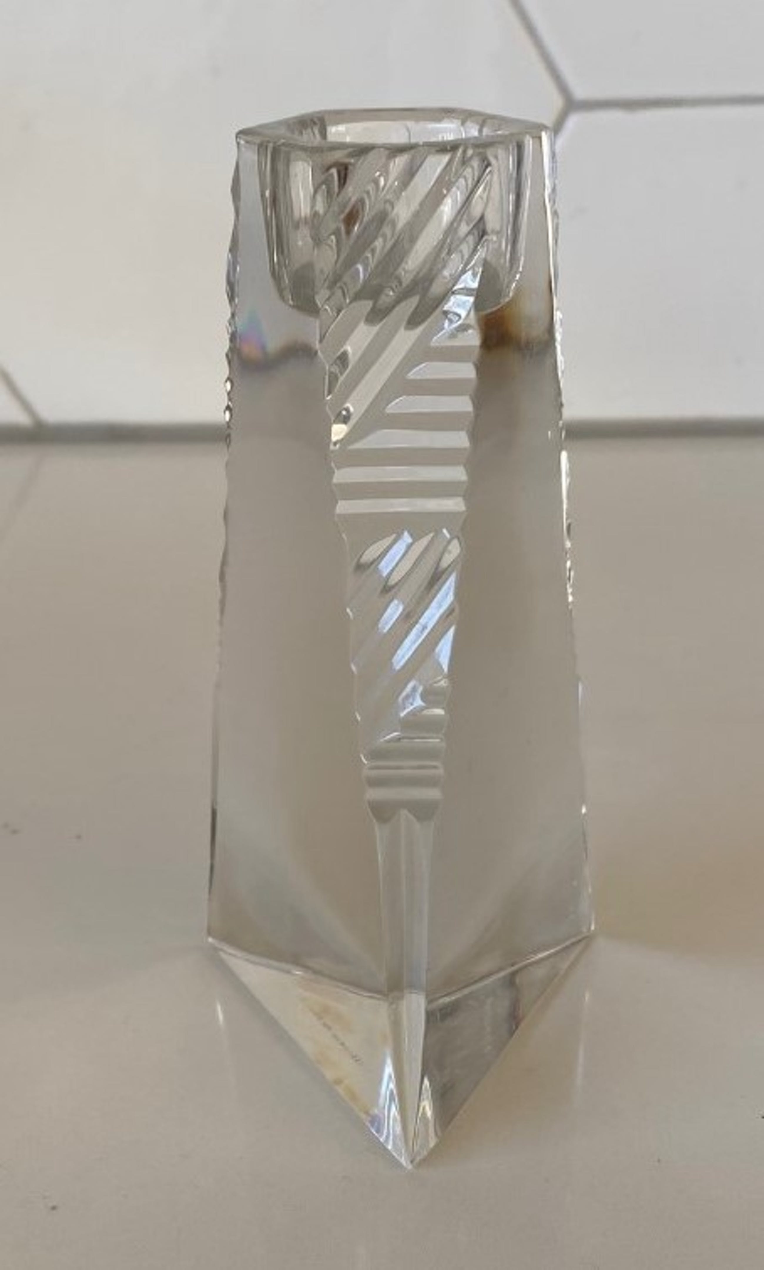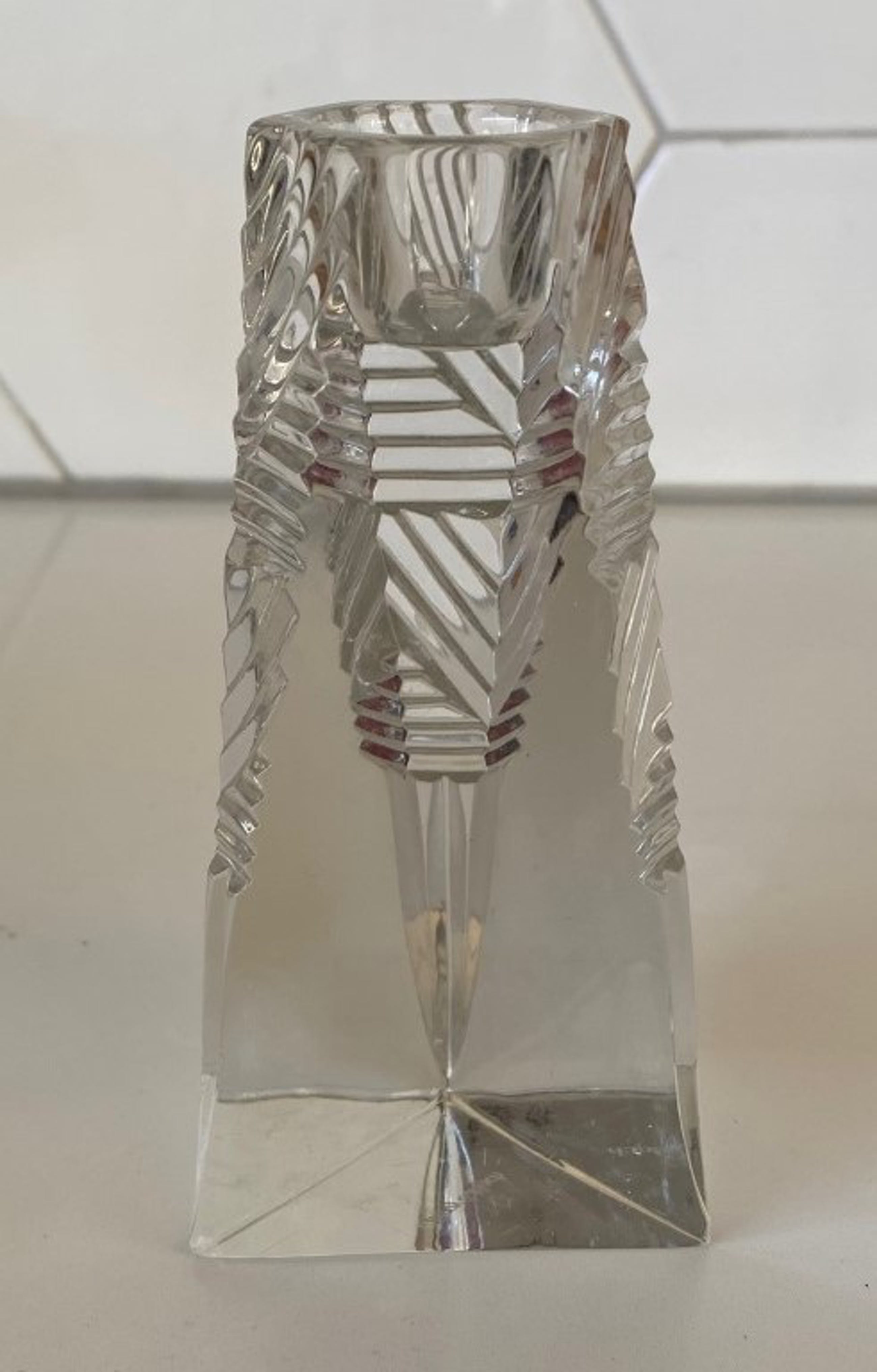 Villeroy & Boch - Twee kristallen Prisma kandelaren. De kandelaren zijn in art deco stijl geslepen en drie hoekig, beide kandelaren hebben een stootplekje op een van de drie hoeken bij de voet. Beide kandelaren zijn gemerkt met een etsmerk.