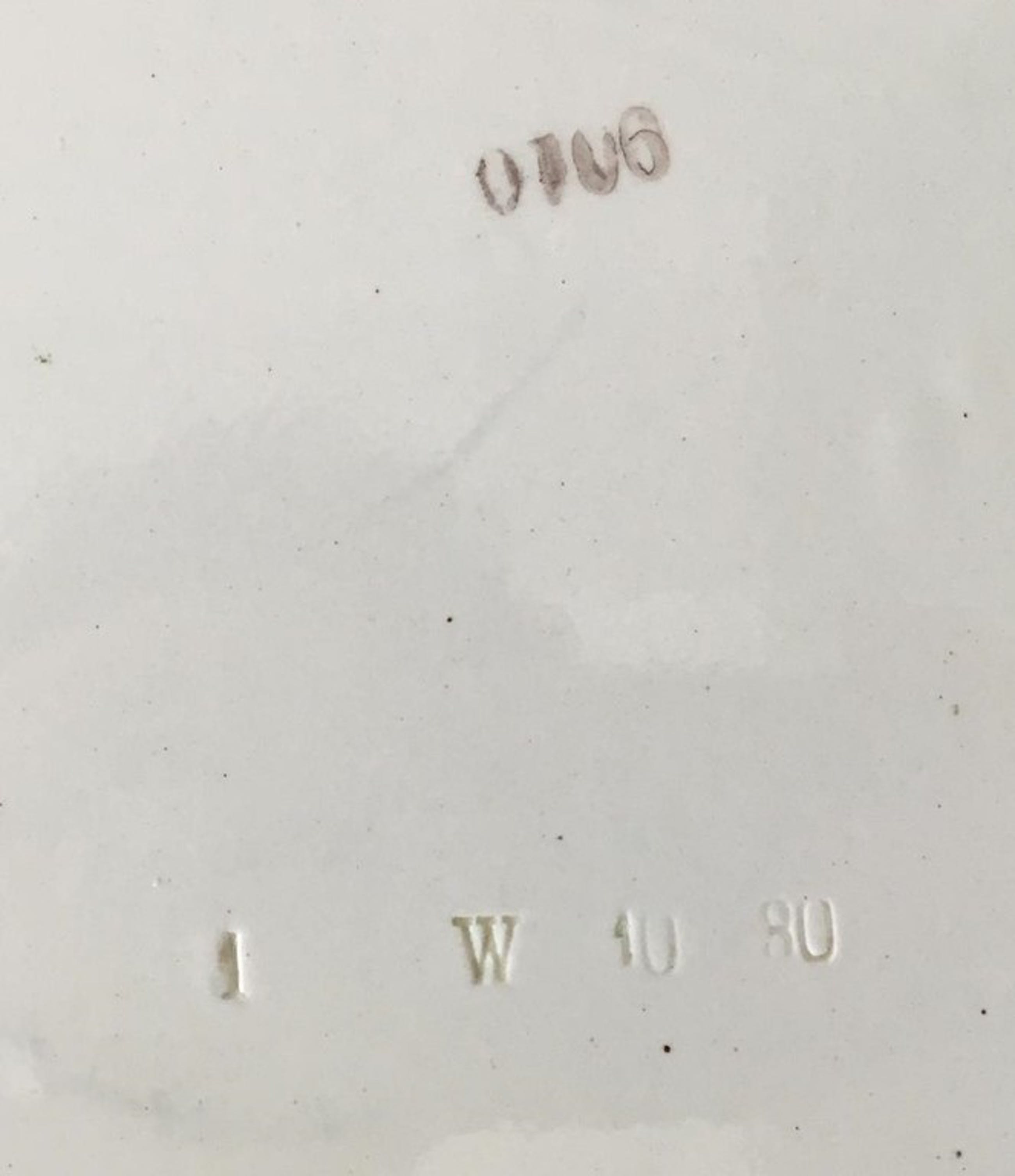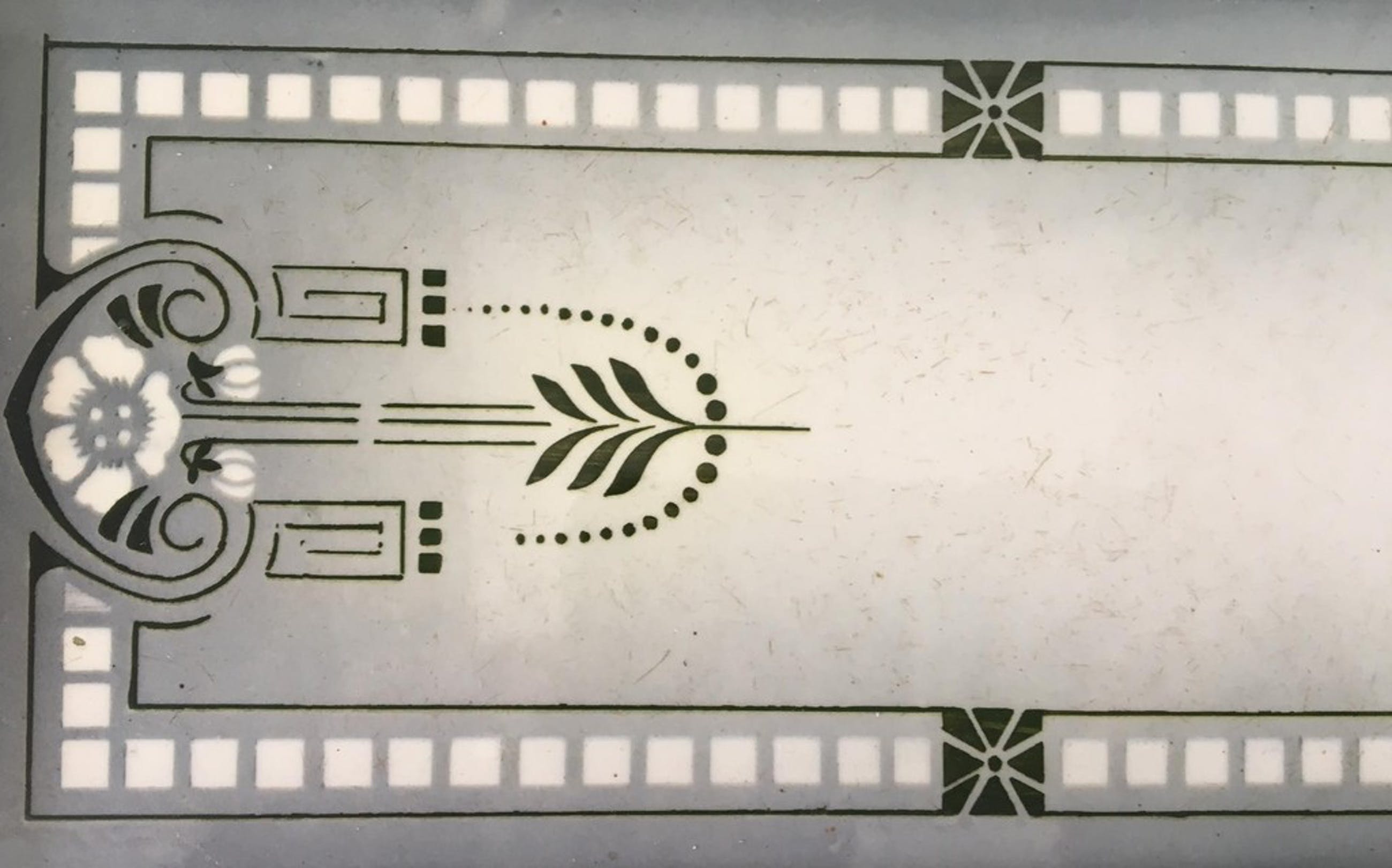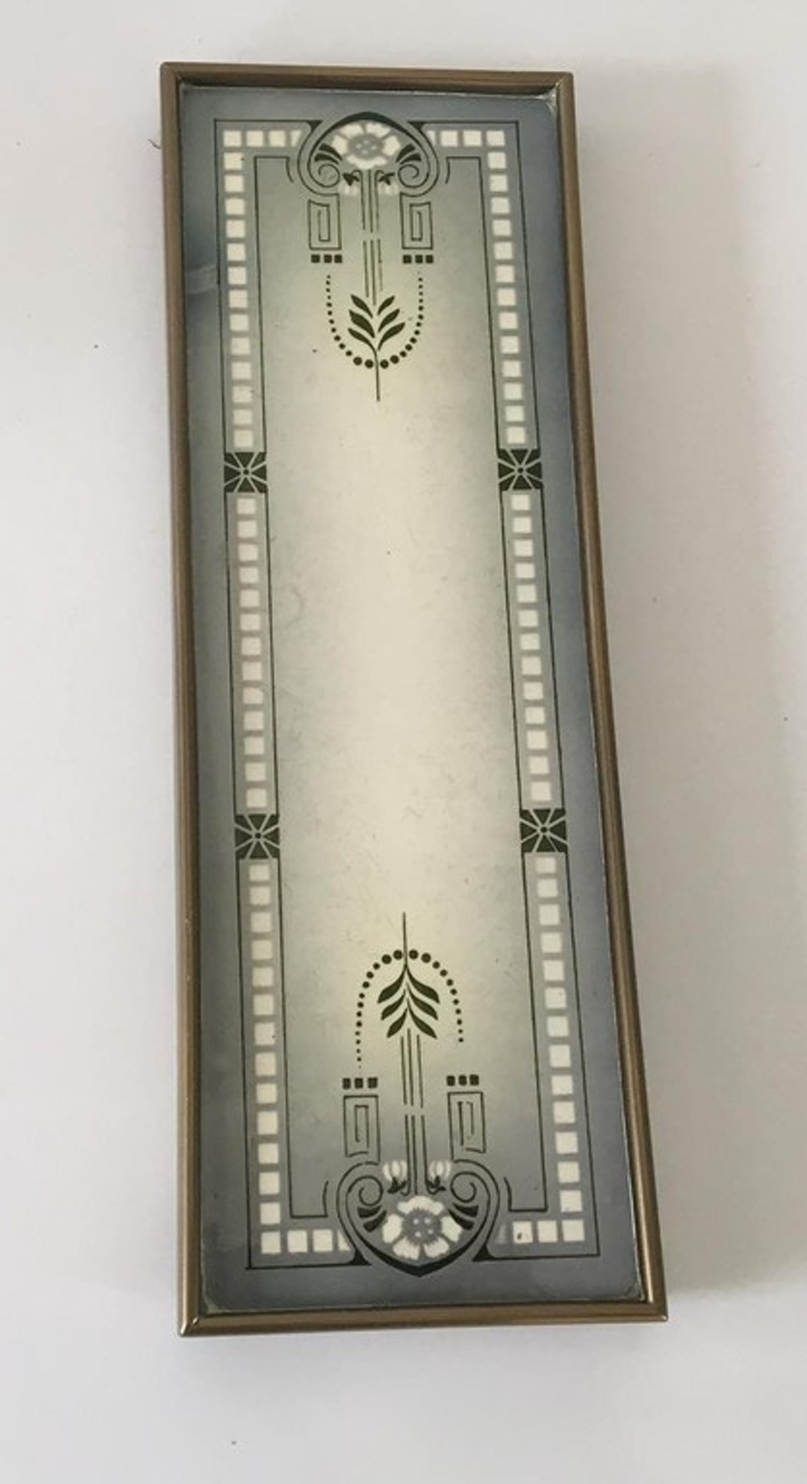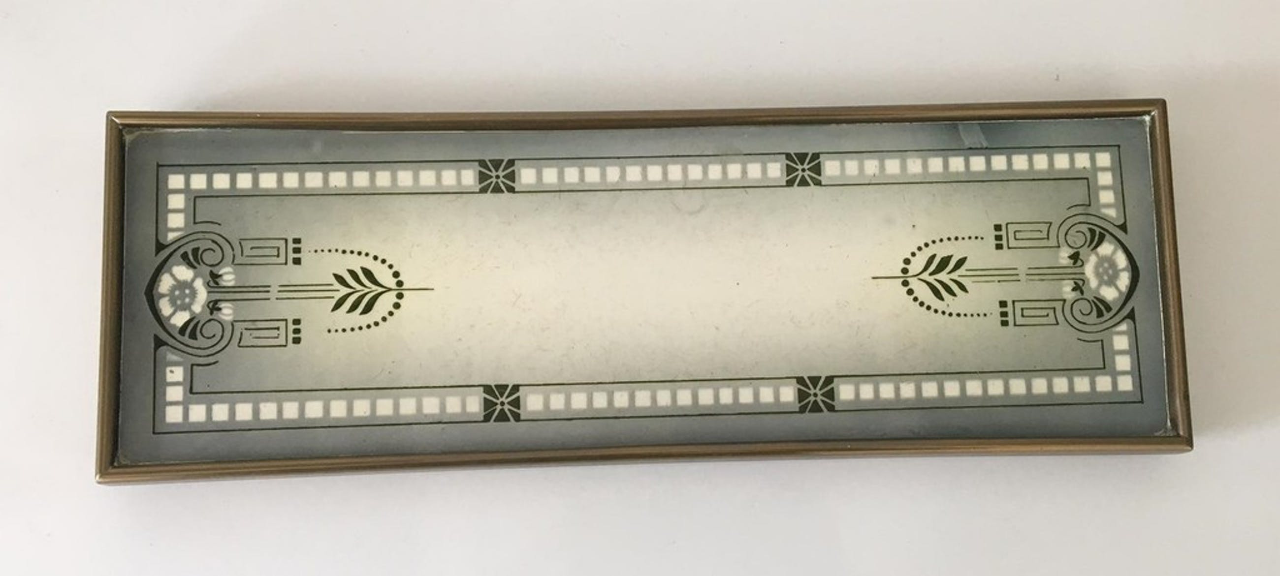 Mooi rechthoekig aardewerken dienblaadje voorzien van een geometrisch Jugendstil decor met metalen of tinnen montuur. In prima onbeschadigde conditie en aan onderzijde voorzien van ingedrukte en gestempelde model en decornummers.