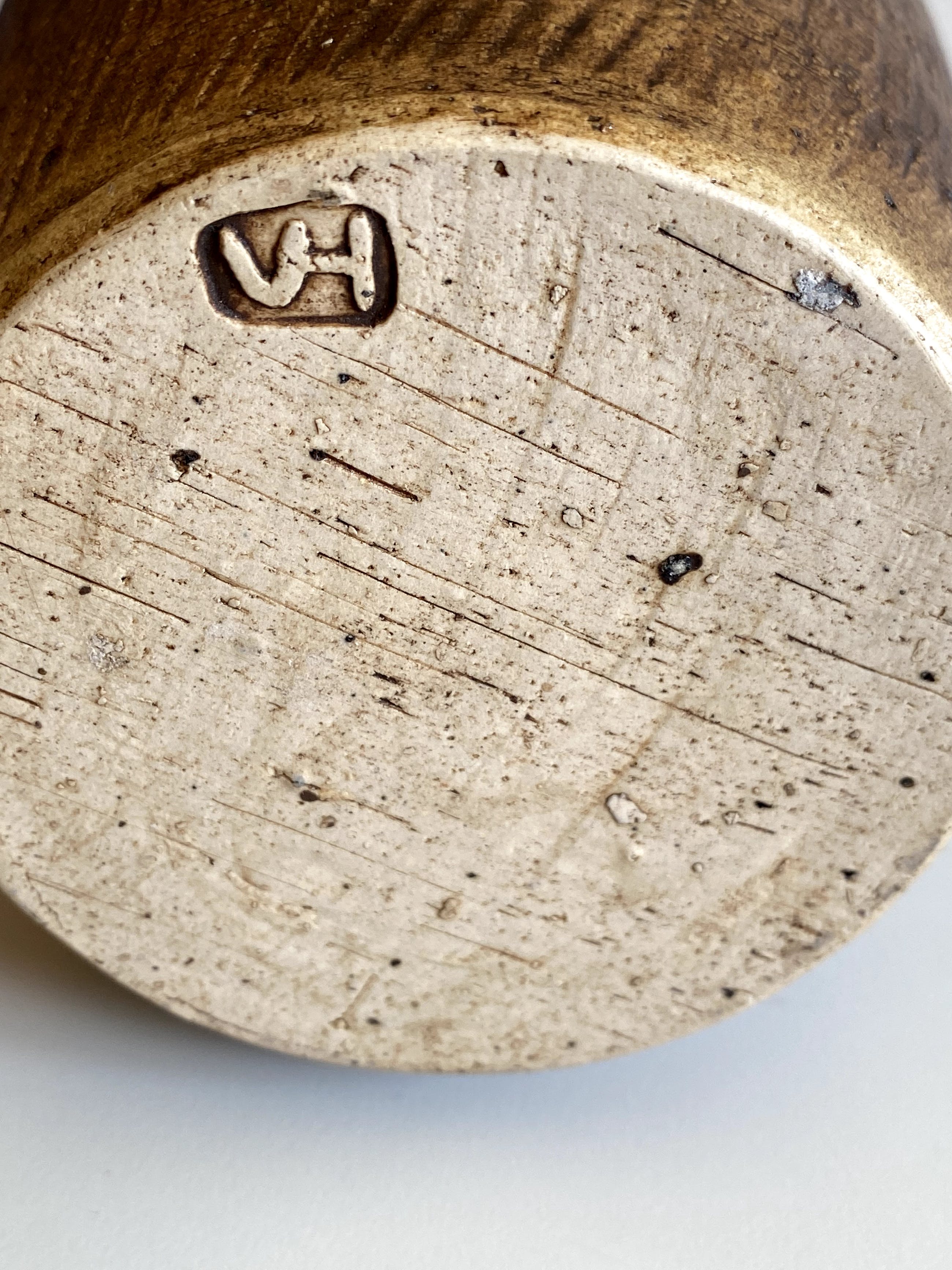 Vaasvorm van Vilma Henkelman gemaakt in haar Haagse Atelier rond 1976. de vaas heeft twee chipjes. Gesigneerd met monogram.