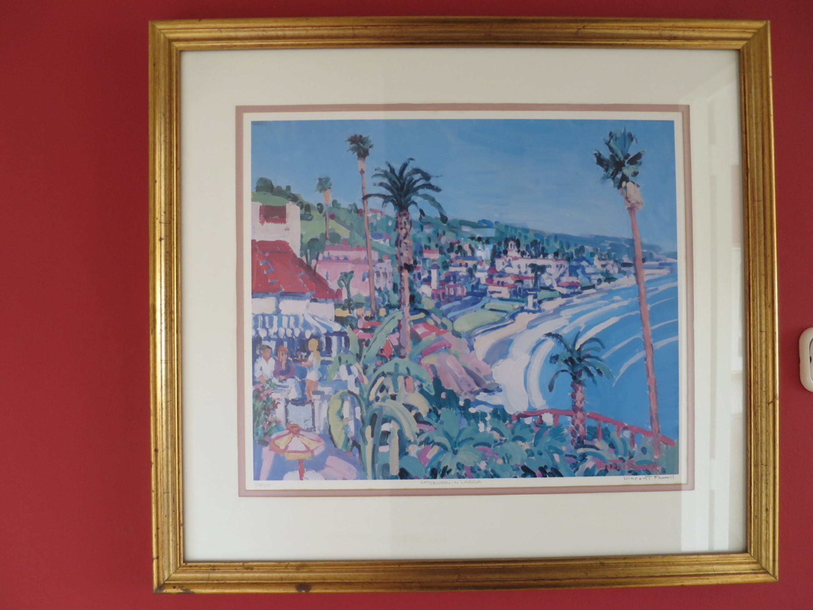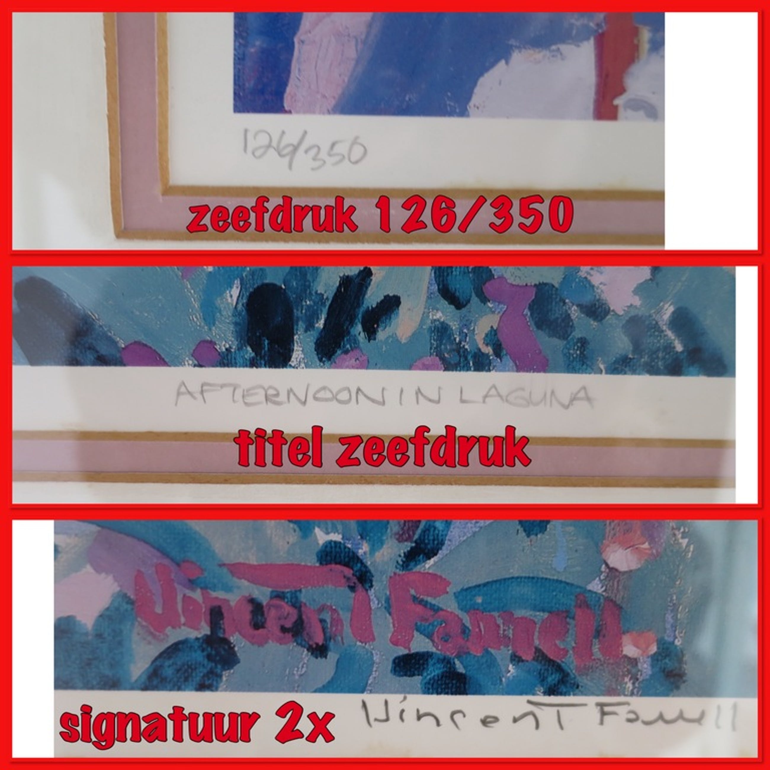Bijzonder fraaie zeefdruk (zie nieuwe foto's) van de Californische kunstenaar VINCENT FARREL (Laguna Beach 1928-2008). Het werk, prachtig ingelijst, de titel meegekregen “Afternoon in Laguna”. Laguna, waar Farrel woonde en werkte, is een bekende badplaats aan de Californische kust. De zeefdruk is vervaardigd in een oplage van slechts 350 stuks en dit werk kreeg nummer 126 mee. De afmetingen zijn: lijstmaat 73x67cm, zeefdrukmaat 50x40cm. De zeefdruk, passe partout en lijst verkeren in goede staat. Een prachtig zonnig en sfeervol werk.