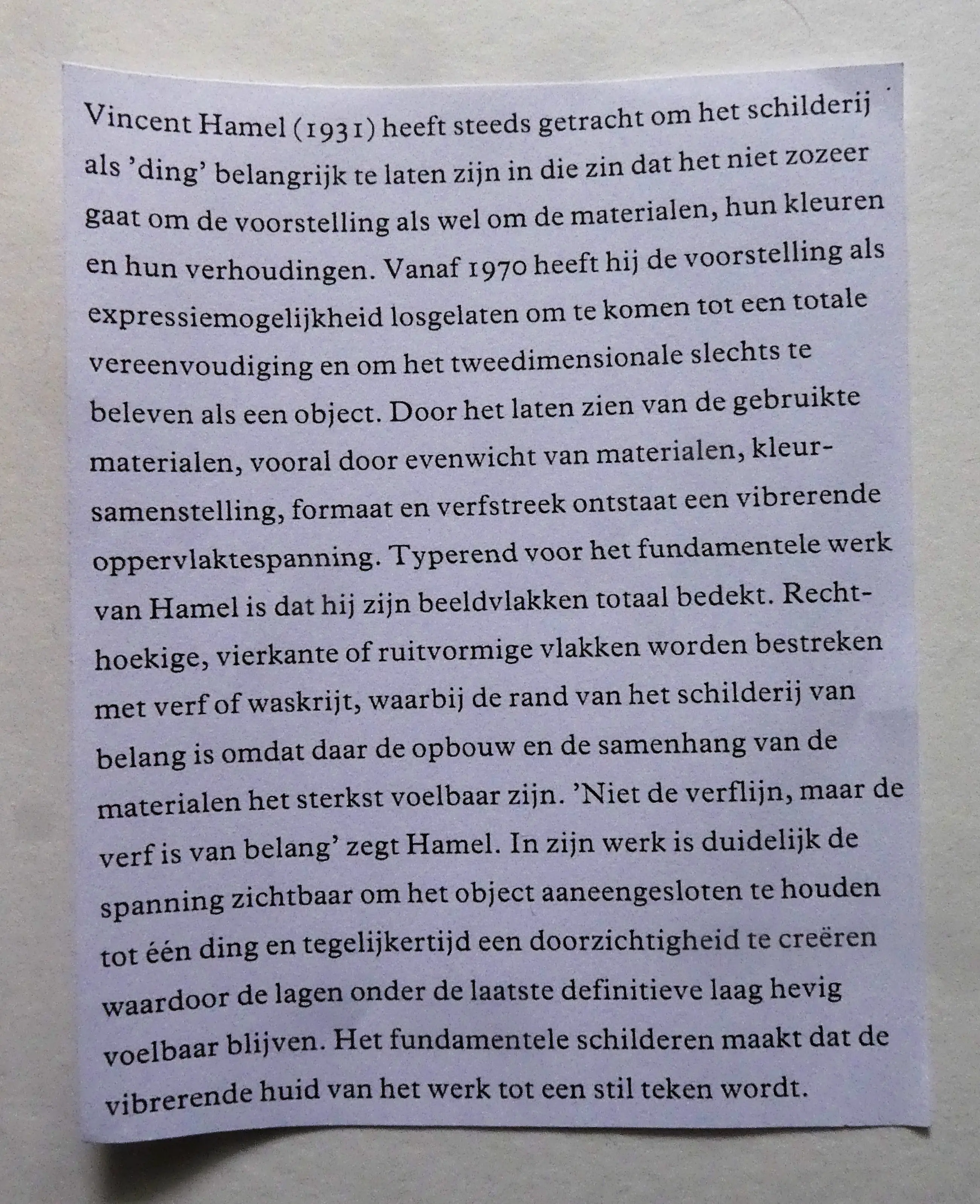 Het werk heeft een dikte van 5 cm. Olieverf op doek op paneel. 1 x monogram en datum en 2 x gesigneerd op de achterzijde.