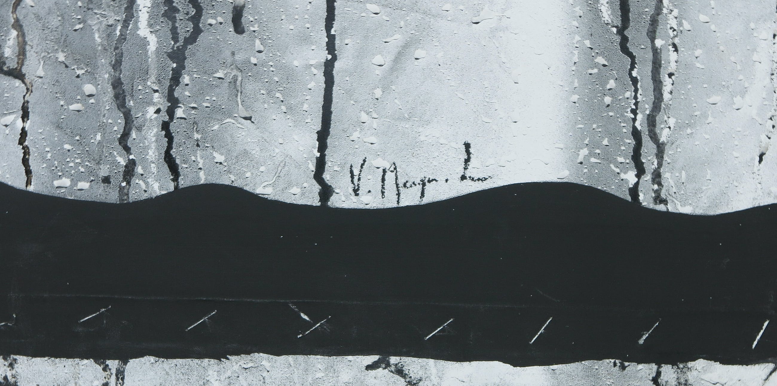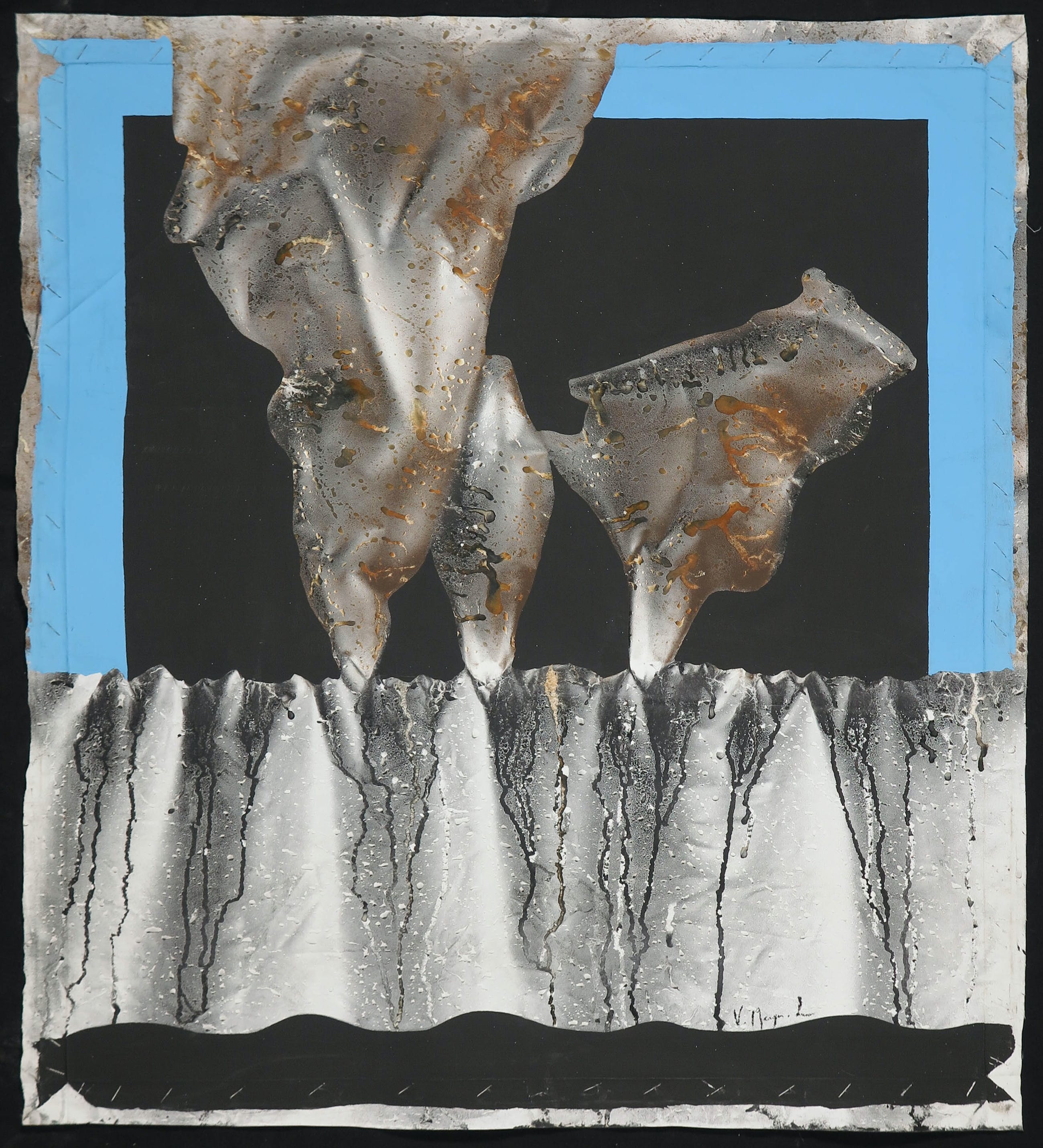 | Randen zijn lichtelijk gekruld. Doek heeft gleuven langs de rand van de nietjes waarmee het doek op het spieraam bevestigd wordt. Er loopt een horizontale bolling door het doek. | |||||||||||