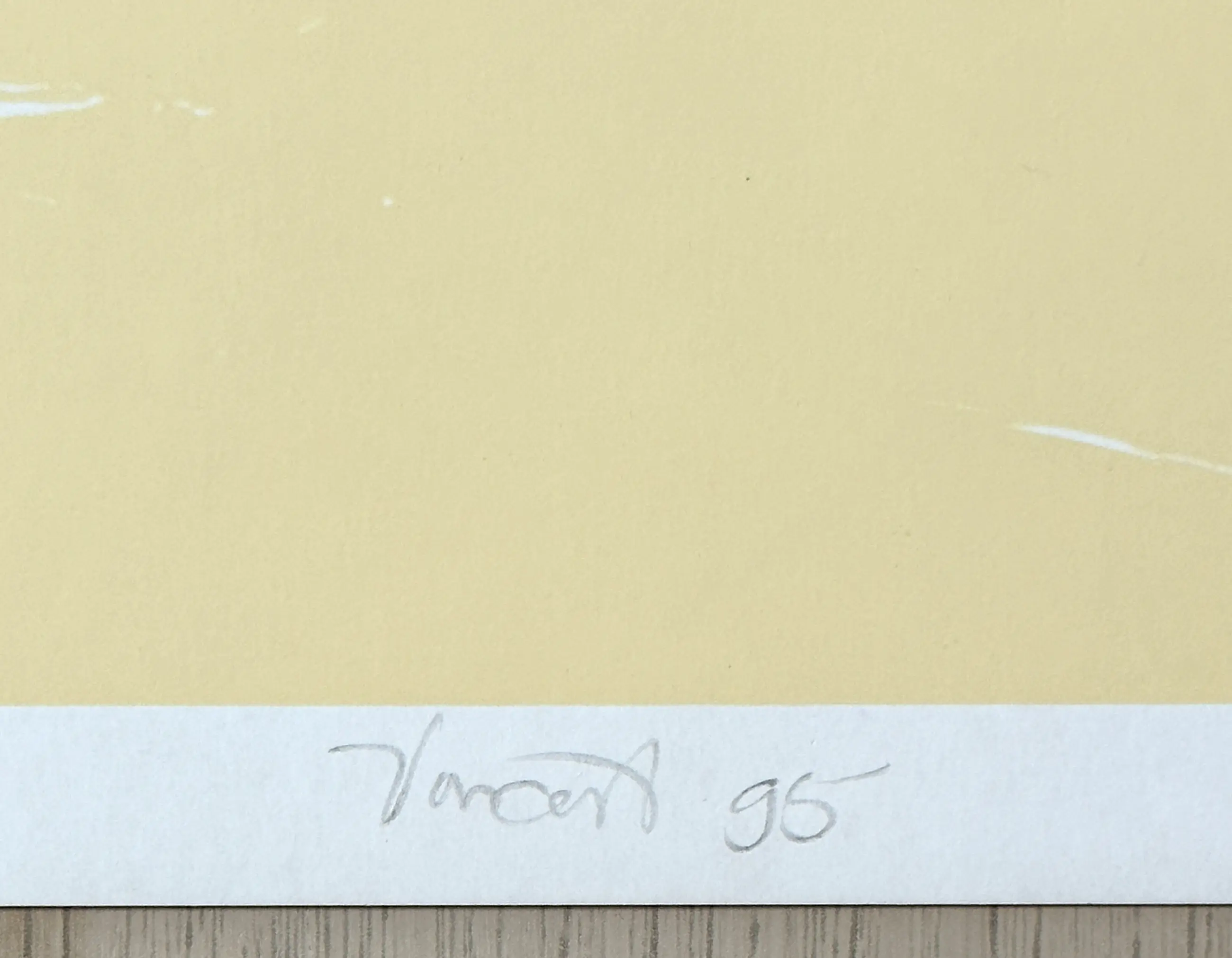 Zeefdruk met twee hondenkoppen van Vincent Rijnbende gemaakt in 1995. Gedrukt op zuurvrij papier, papierformaat 32 x 45 cm. Handgesigneerd en genummerd 'e.a.' (Epreuve d'Artiste) door de kunstenaar. De zeefdruk is in uitstekende staat.