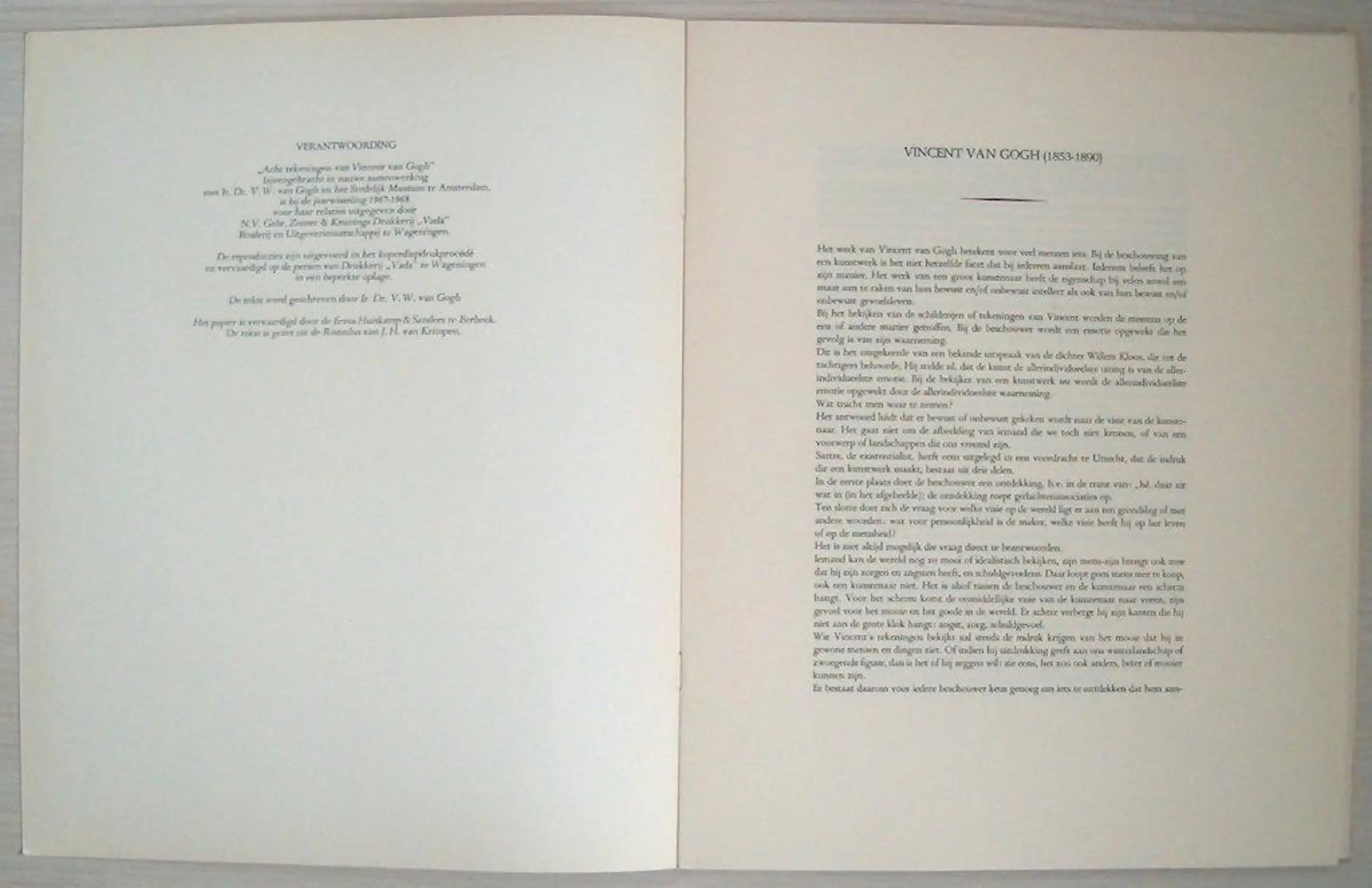 In tegenstelling tot zijn oom kreeg Vincent W. van Gogh pas op latere leeftijd interesse in schilderkunst. Hij was de zoon van Theo van Gogh en genoemd naar diens broer, kunstschilder Vincent van Gogh. Zijn passie (zijn beroep was ingenieur) waren bedrijfsprocessen. Pas op latere leeftijd verdiepte hij zich in de kunstverzameling die hij erfde na de dood van zijn moeder in 1925 waarover hij het beheer voerde. In 1960 richtte hij de Vincent van Gogh Stichting op met als doel de collectie bijeen te houden en onder te brengen in een Van Gogh museum. Hij schreef de tekst bij de map, waarin hij o.a. stilstond bij de gelaagdheid in het proces van kunst ontdekken en maken.