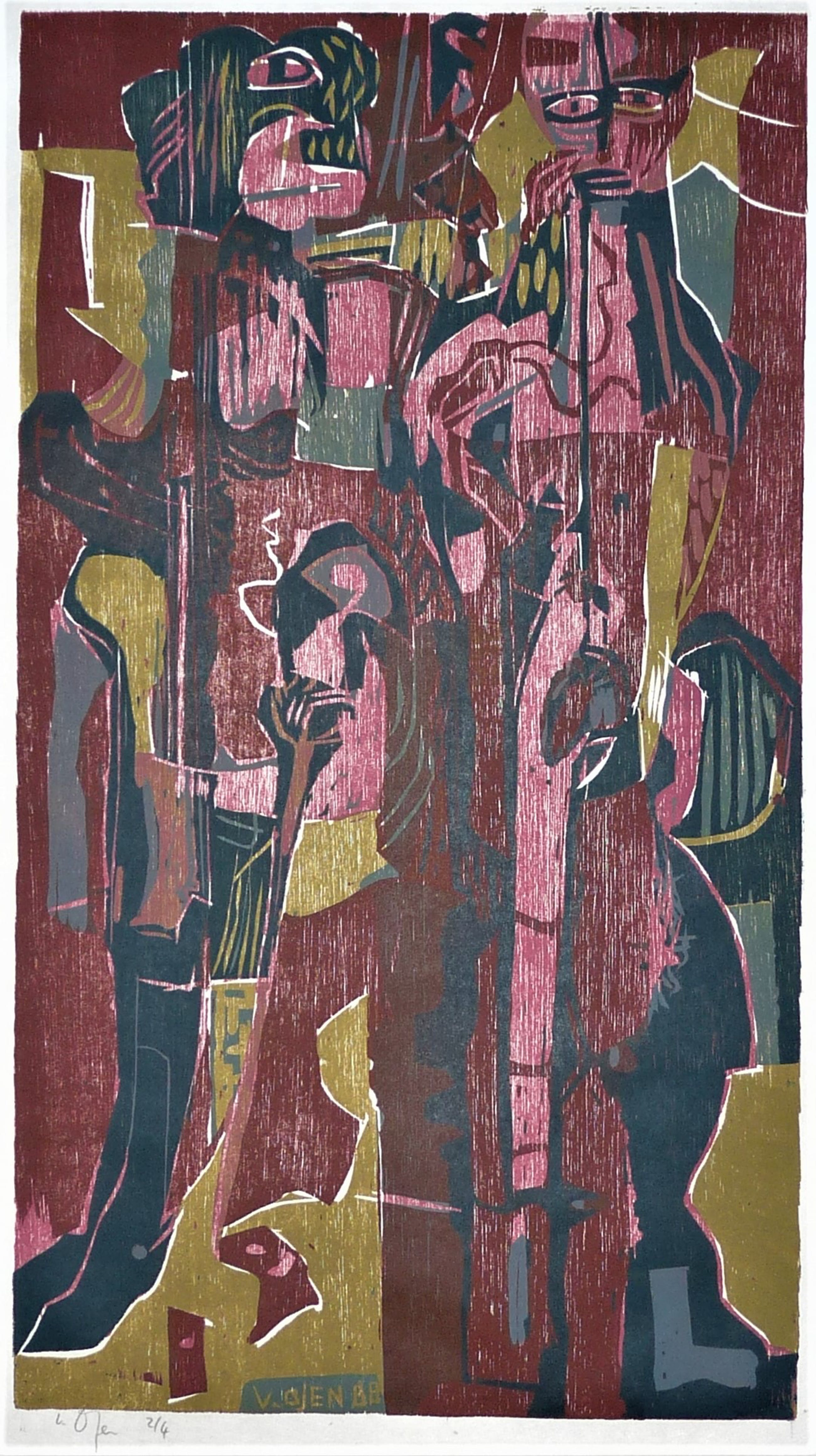 *Fraaie houtsnede van Vincent van Ojen in zeer beperkte oplage van slechts 4 exemplaren. De voorstelling betreft een tweetal figuren of gestaltes. *Werk is met passe-partout, doch zonder lijst. *Verzending is aangetekend, verzekerd en goed verpakt. * Bij verzending, is dit zonder passe-partout i.v.m. max. maten Postnl.