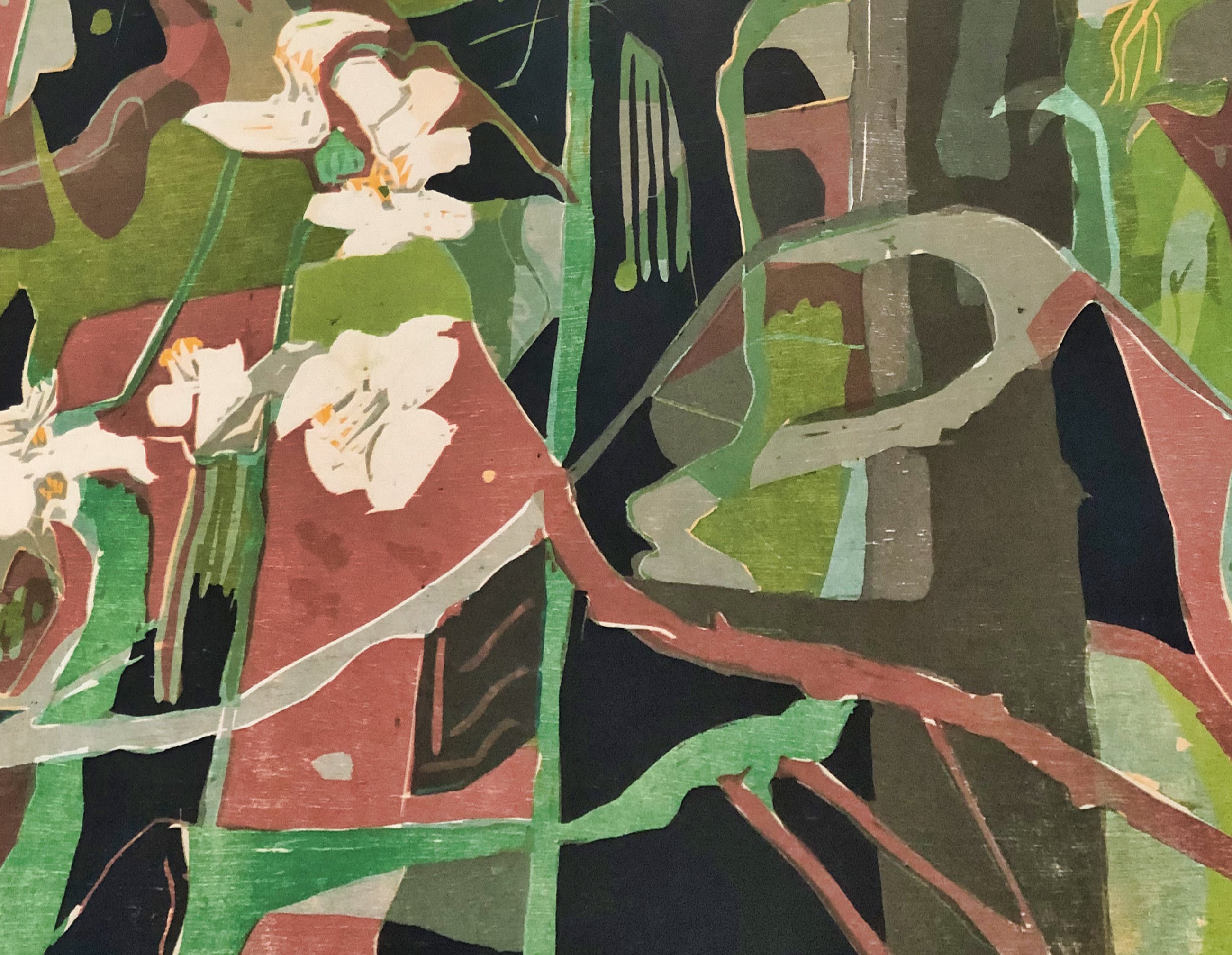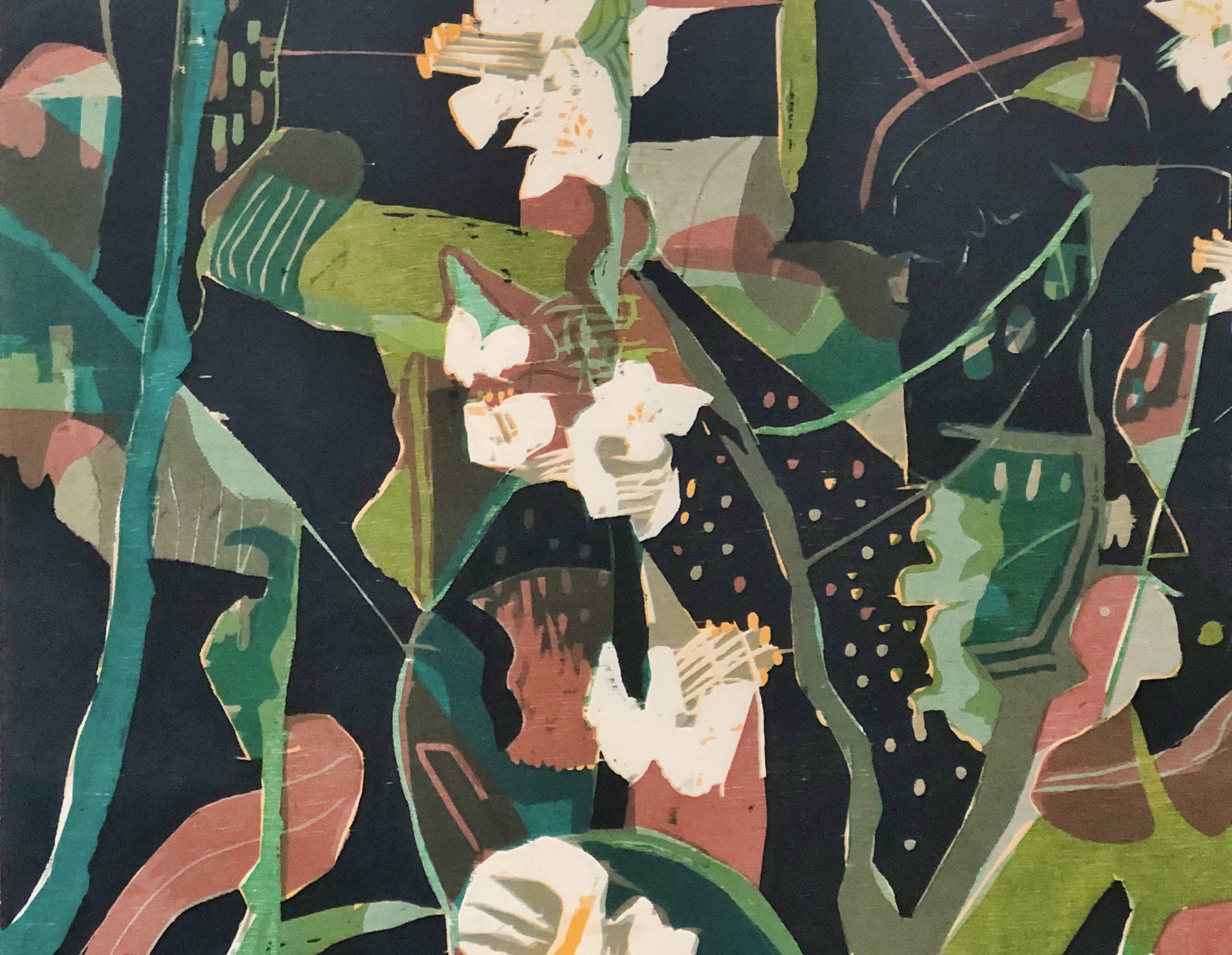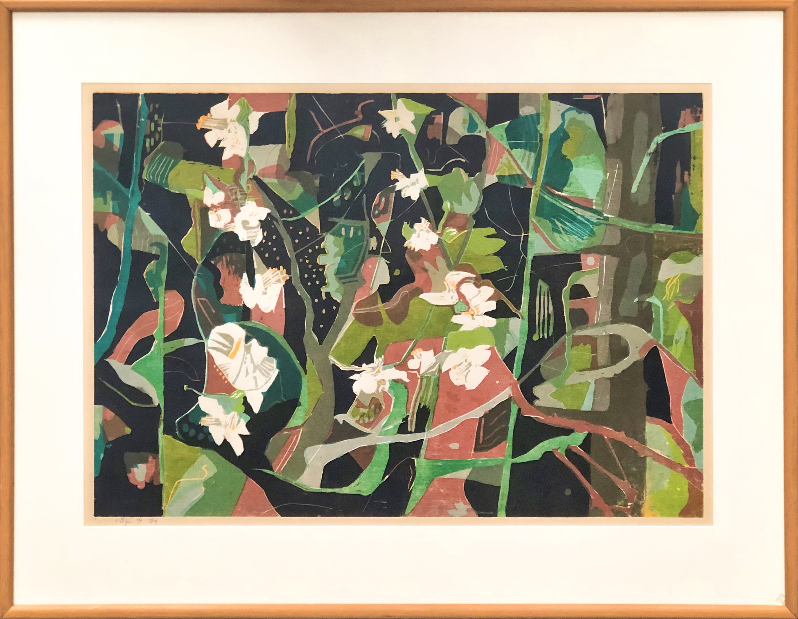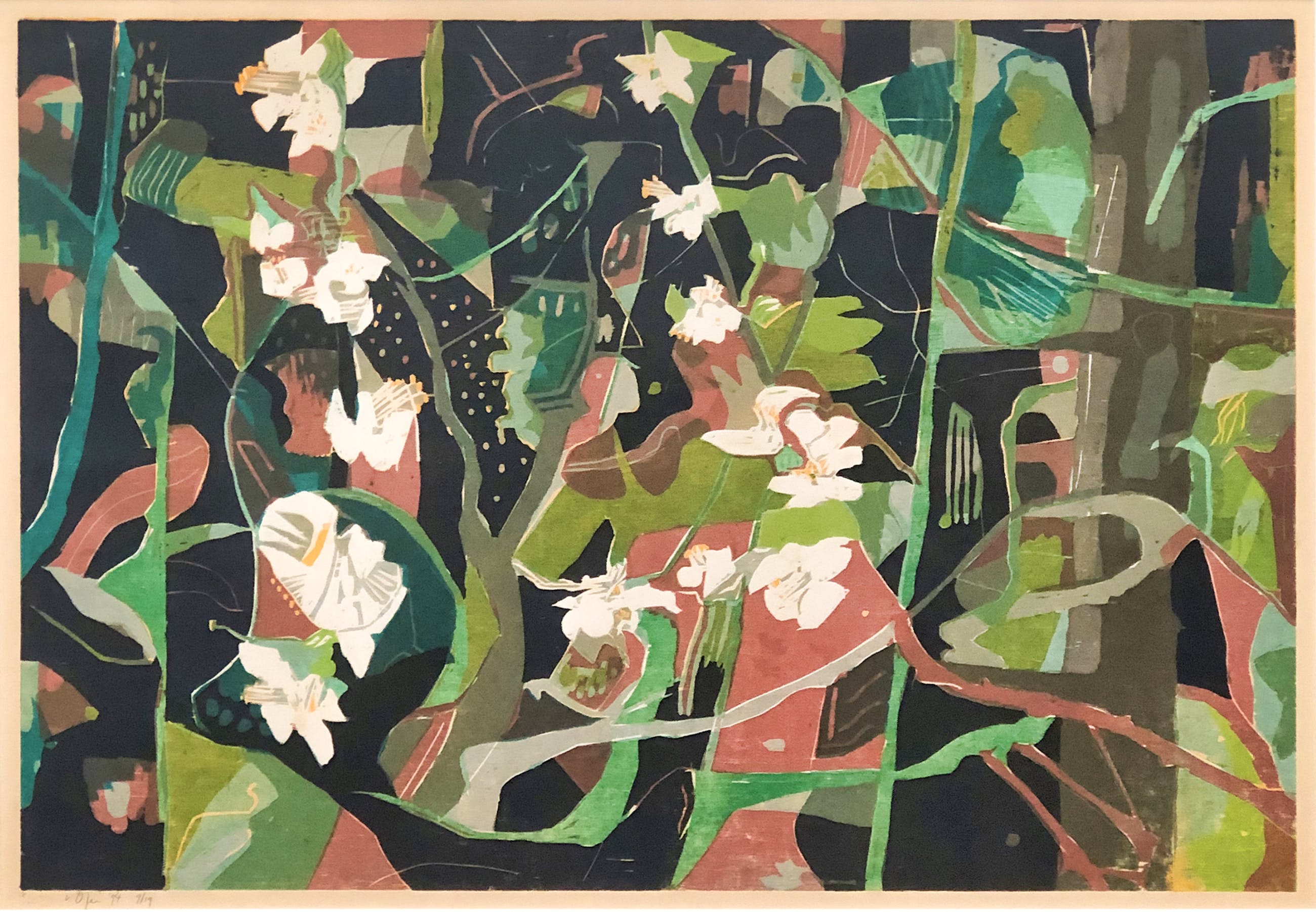 Dit kleurrijke grote werk van Vincent van Ojen is kenmerkend voor zijn geliefde stijl. Het bestaat uit prachtig uitgesneden en ingekleurde lelies tegen een abstracte achtergrond.In de uiterst rechtse hoek zit een nauwelijks zichtbaar barstje in het glas Gezien de grootte en de kwetsbaarheid: uitsluitend ophalen