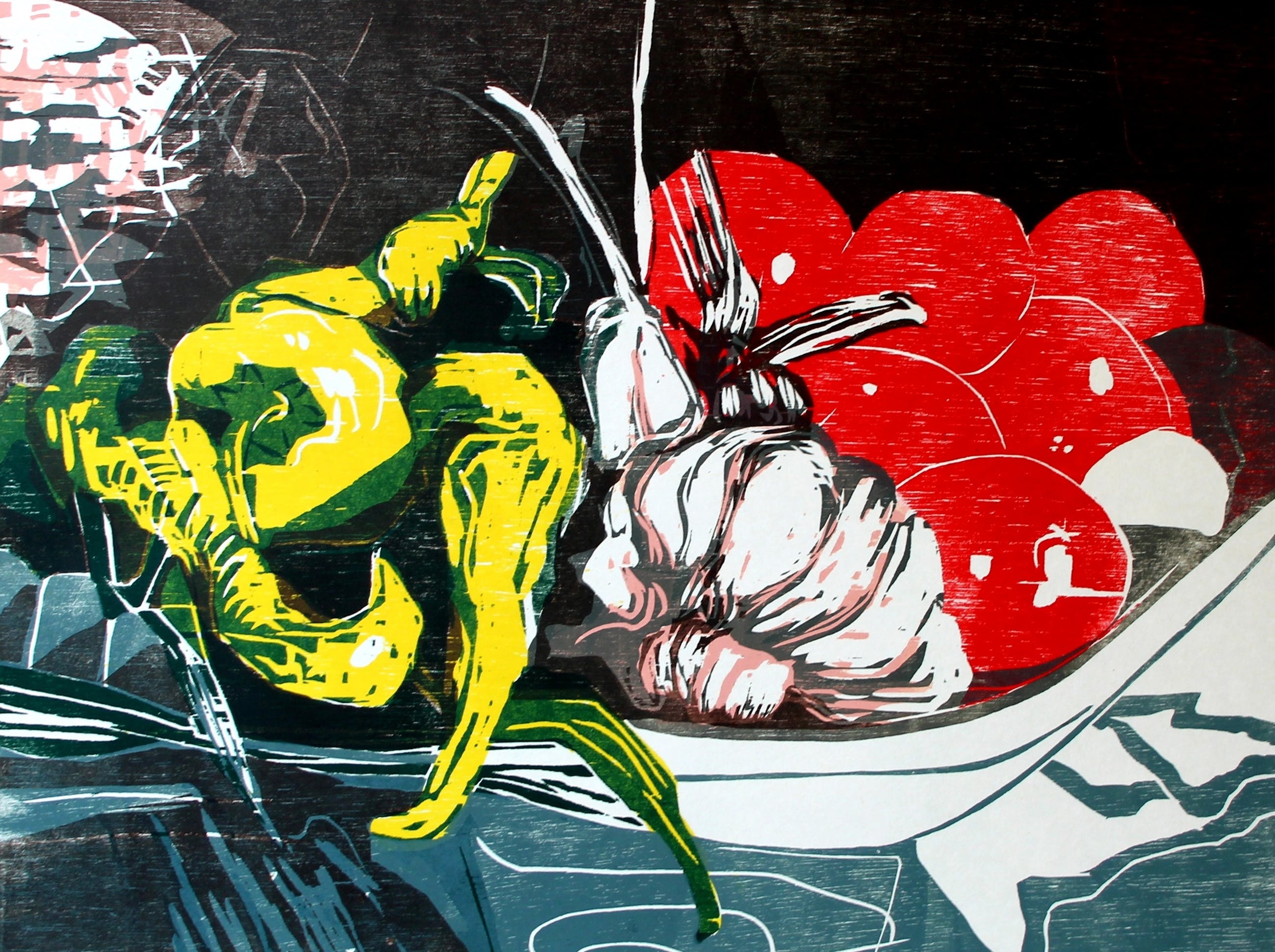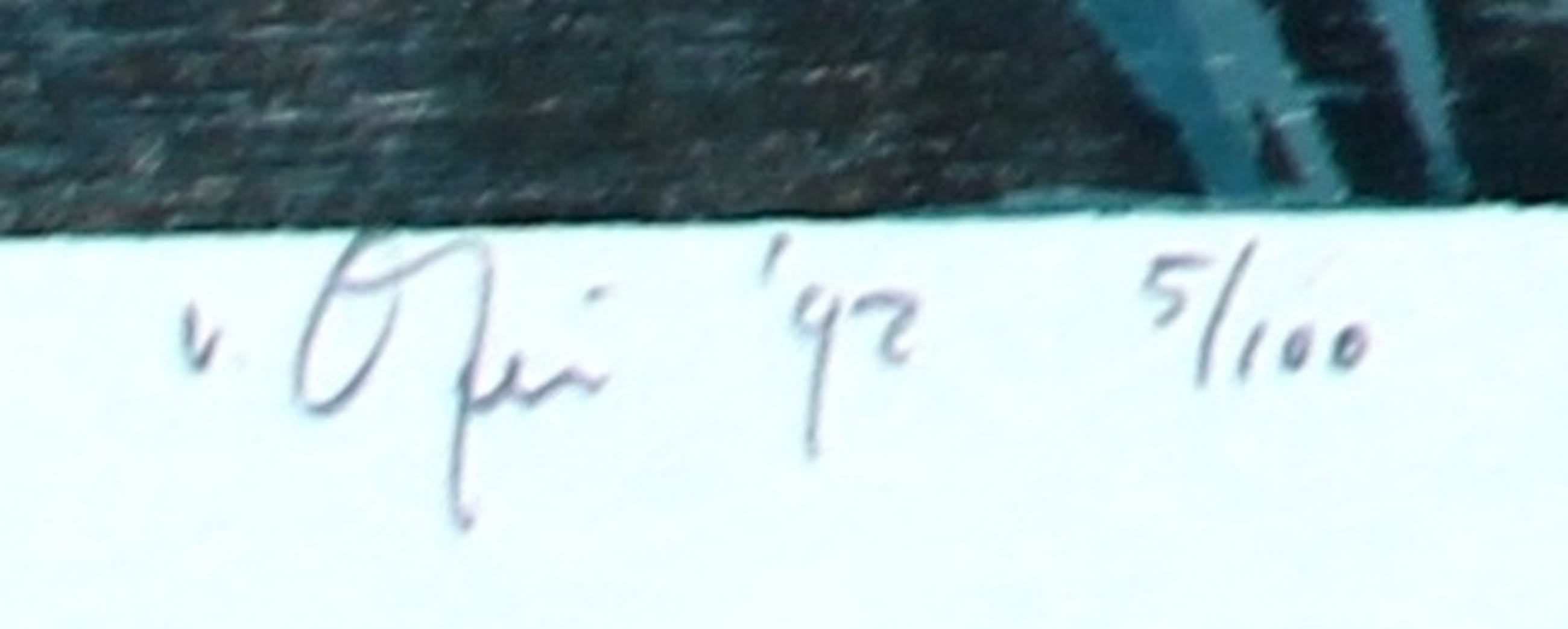 Houtsnede van Vincent van Ojen. Stilleven fruitschaal. Nummer: 5/100. Afmetingen blad: h49.5 x b64.5cm. Afmetingen voorstelling: h40 x b52 cm. Het werk is links onderaan, met potlood, gesigneerd door de kunstenaar. De authenticiteit van dit werk wordt volledig gegarandeerd. Een certificaat van echtheid kan, op aanvraag, worden gemaild.