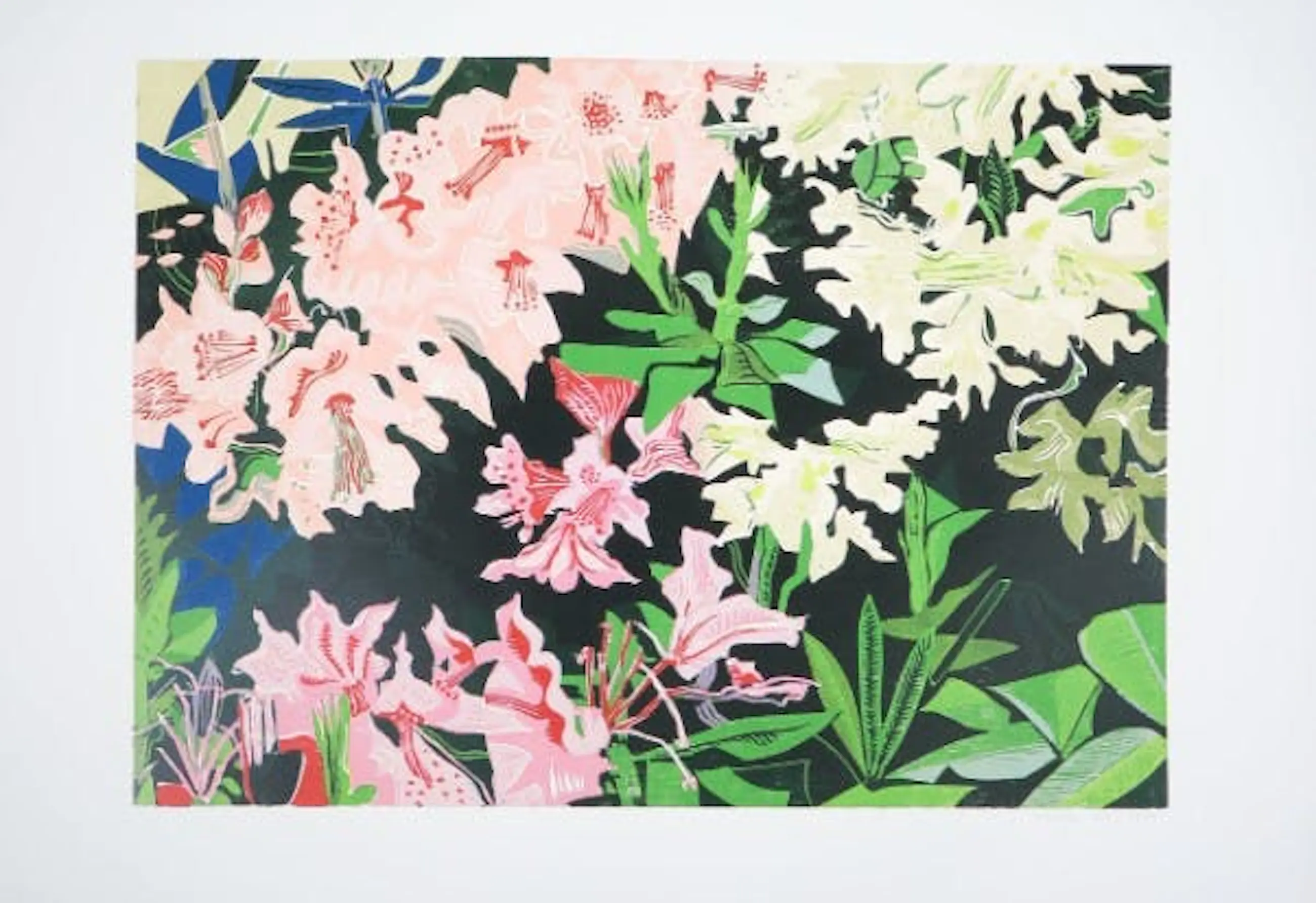 Puntgave en kleurrijke houtsnede (nummer 28 uit de oplage van 40) van rhododendrons in de bloei uitgevoerd op helder, dik papier (zie de eerste 3 afbeeldingen)