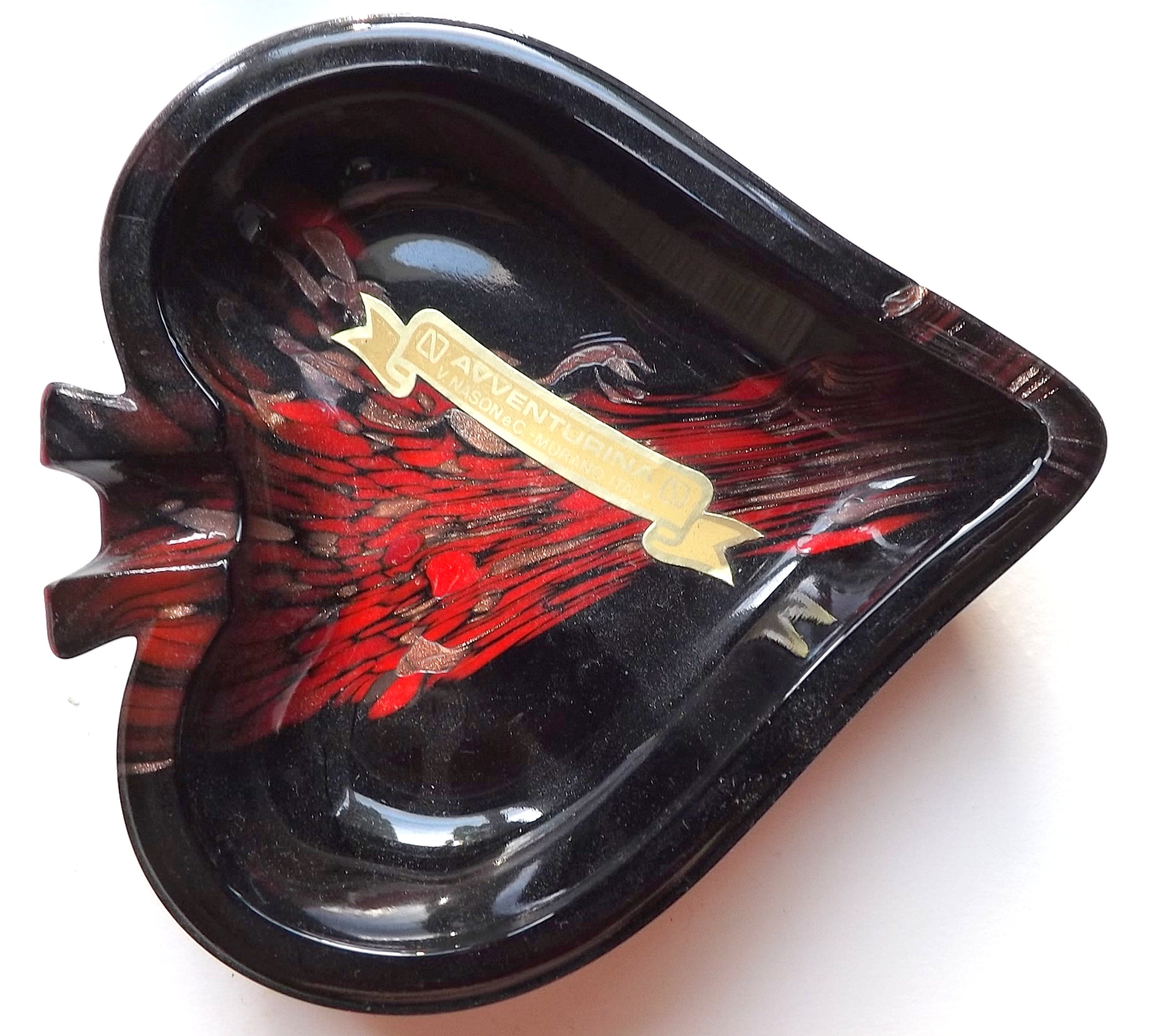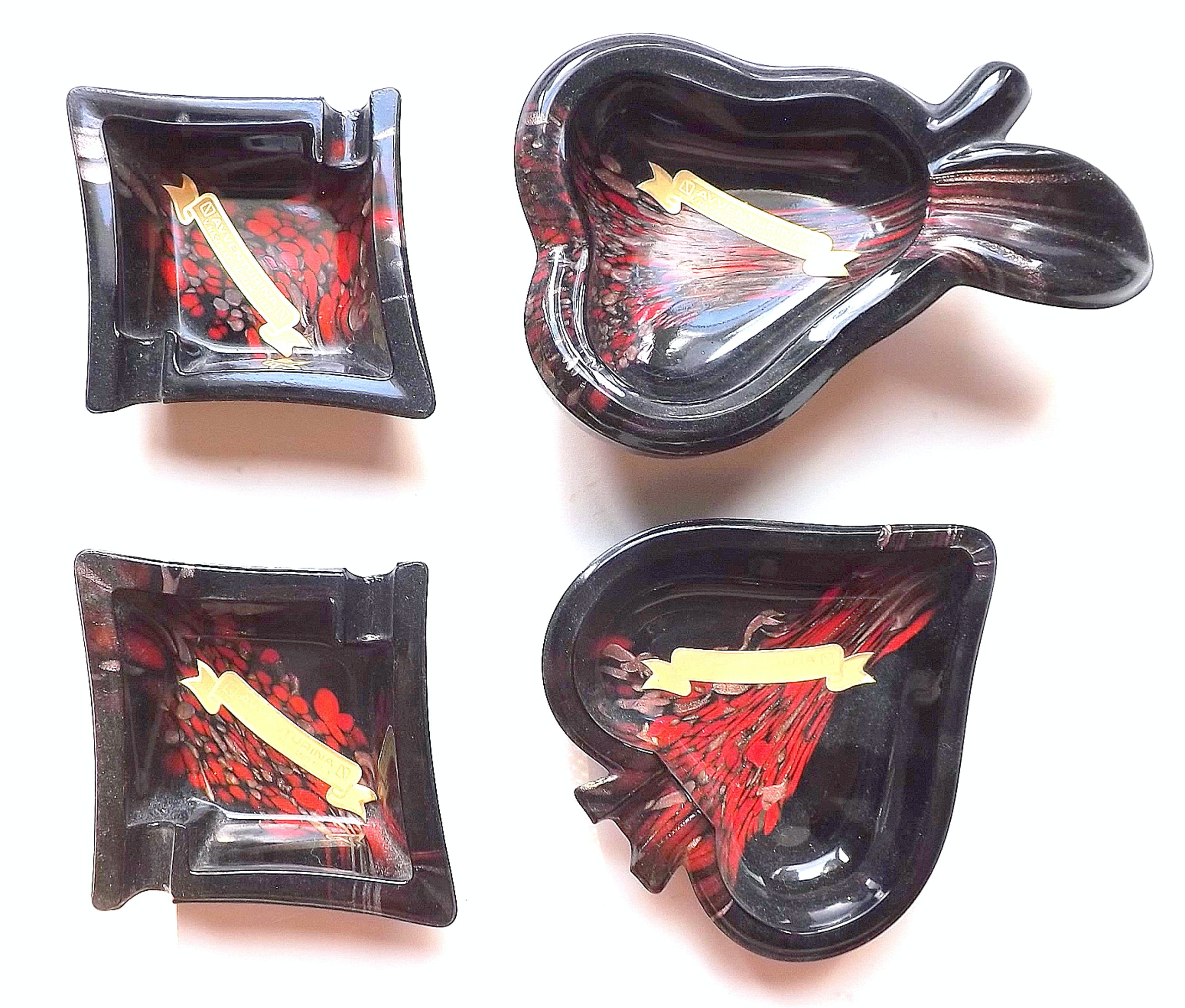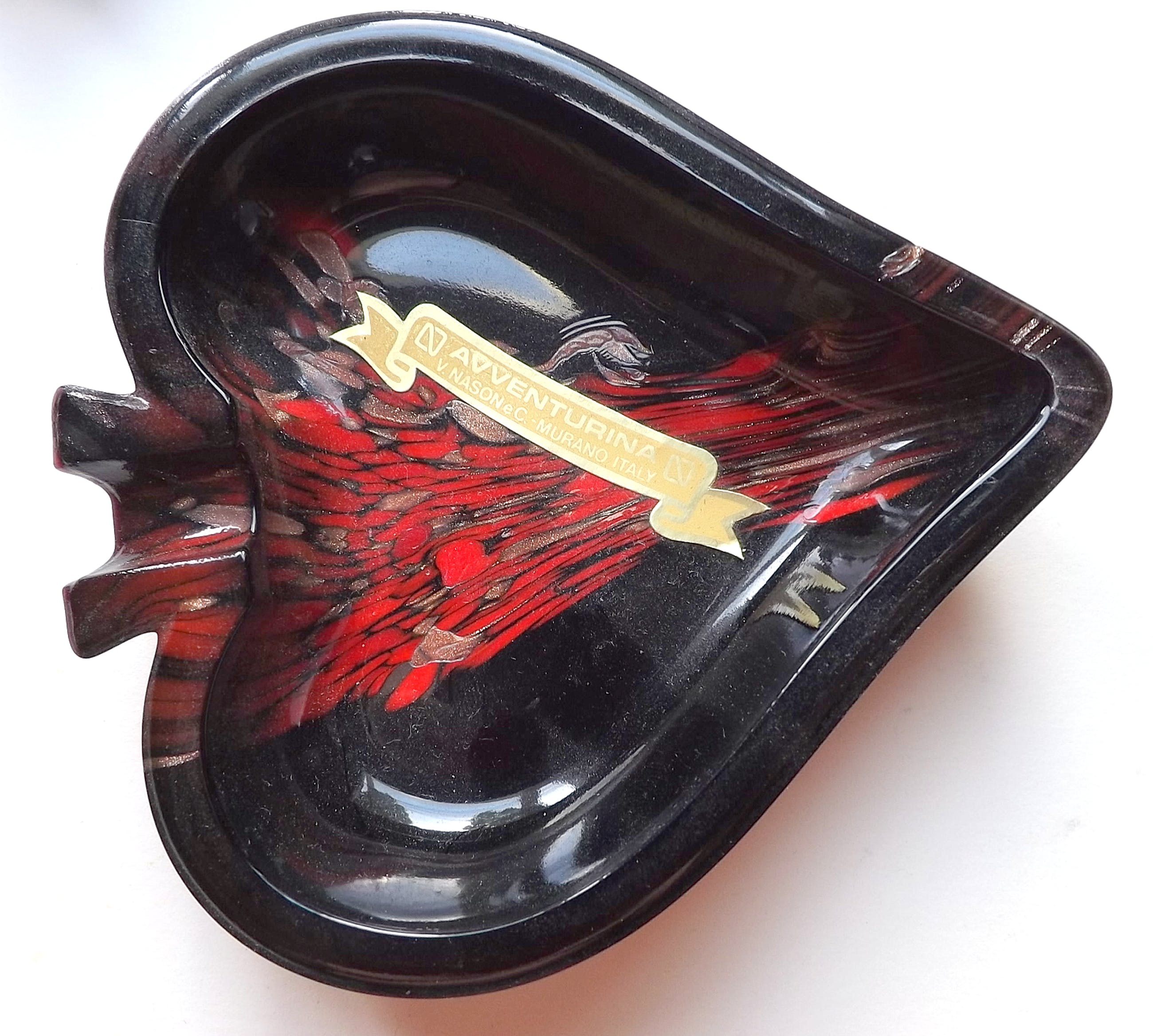 Stunning mid century Murano glass ashtrays wich are made from opaque black glass with copper aventurine inclusions. These are from Nason's "Avventurina Line" produced in the late 1960s. The pieces still retains it's original label and are in excellent vintage condition. The copper sparkles brilliantly; a beautiful set of Italian art glass ! For measurements see foto's. Photo's have been taken by the right lighting with a macro lens and are part of the object(s) description. Registered insured shipping PostNL