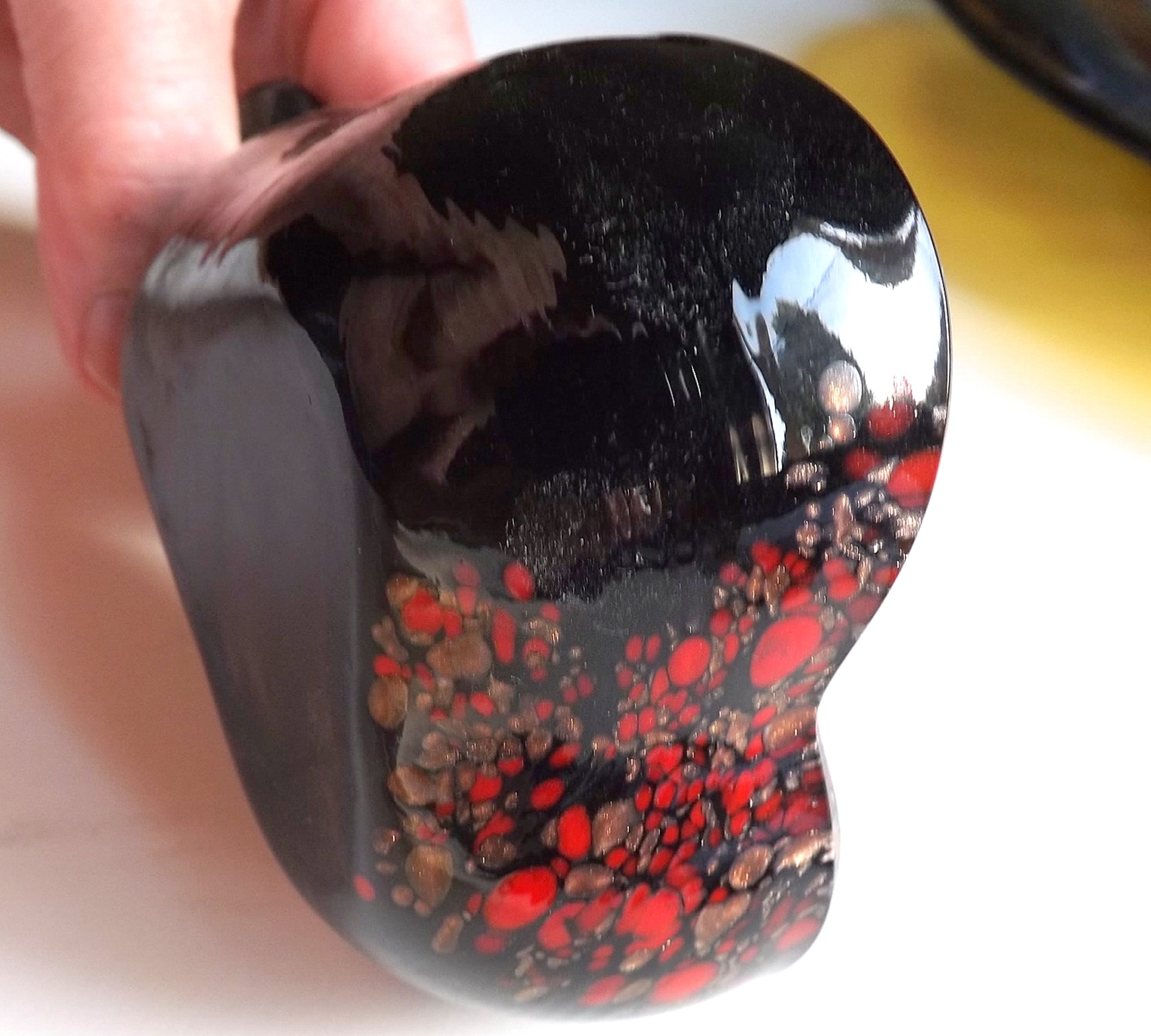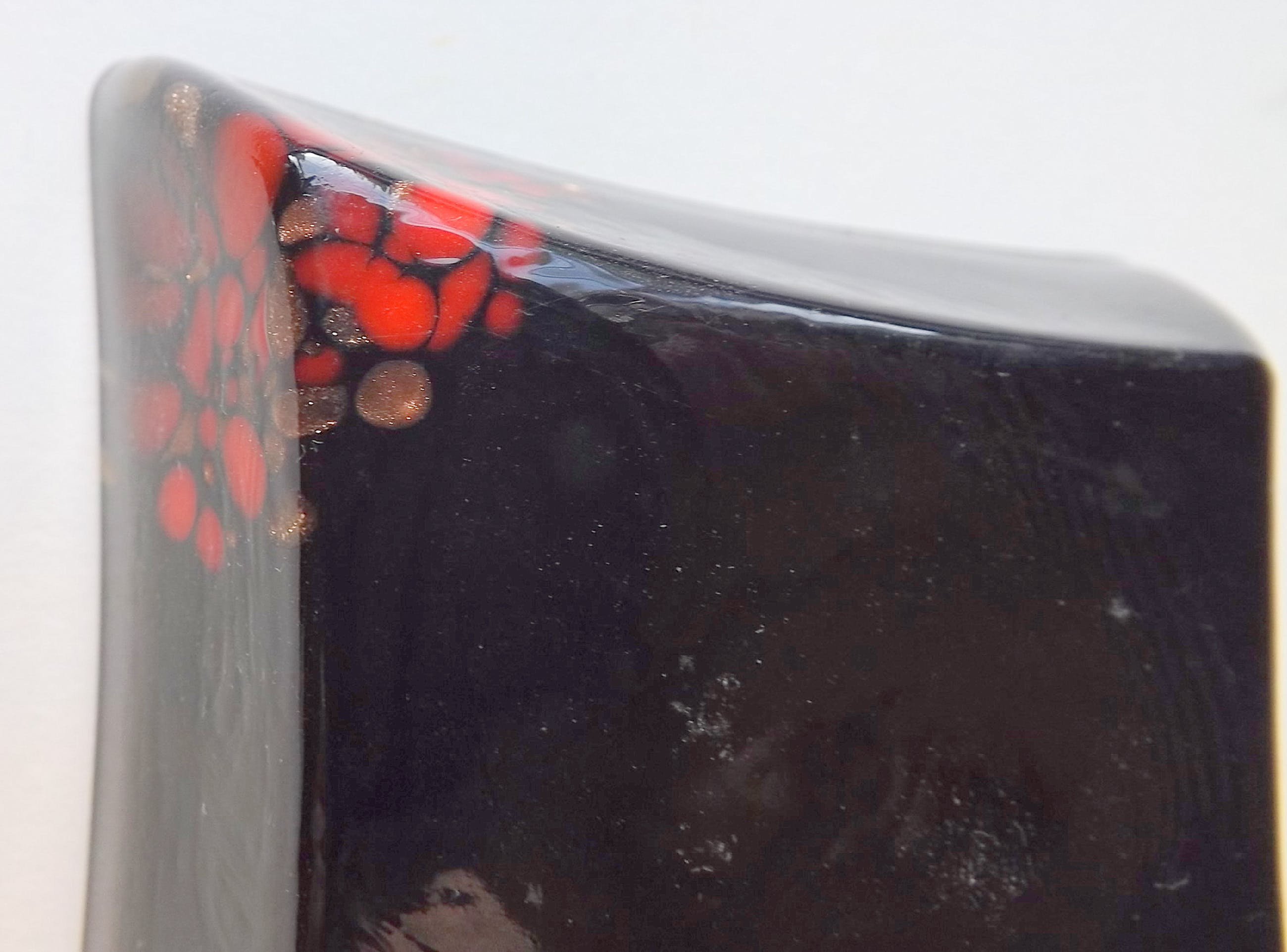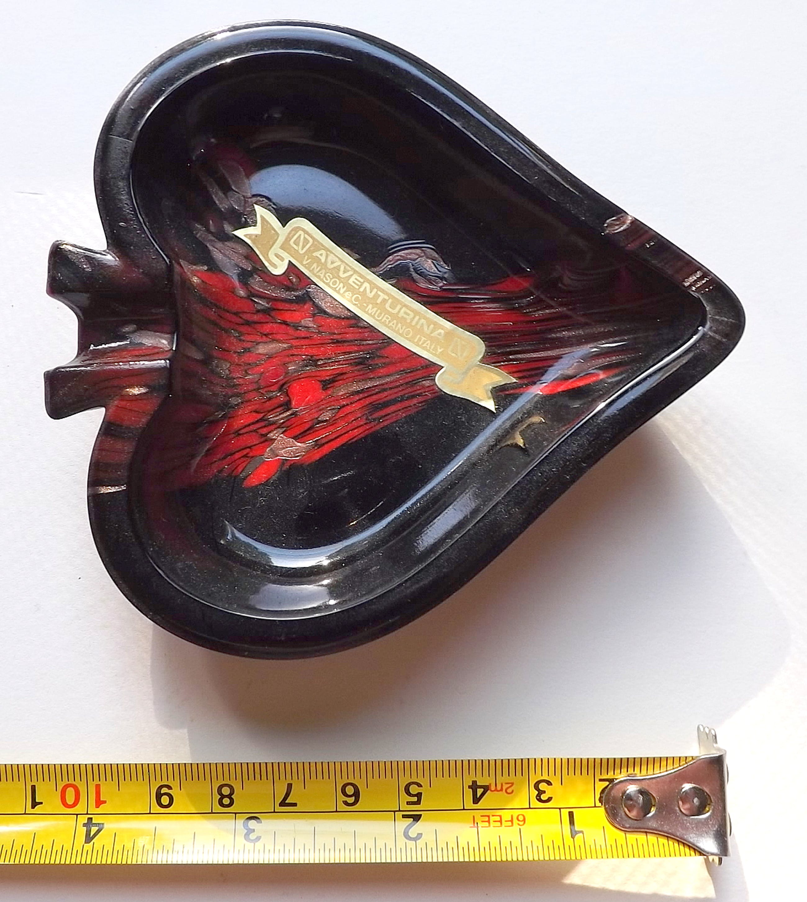 Stunning mid century Murano glass ashtrays wich are made from opaque black glass with copper aventurine inclusions. These are from Nason's "Avventurina Line" produced in the late 1960s. The pieces still retains it's original label and are in excellent vintage condition. The copper sparkles brilliantly; a beautiful set of Italian art glass ! For measurements see foto's. Photo's have been taken by the right lighting with a macro lens and are part of the object(s) description. Registered insured shipping PostNL