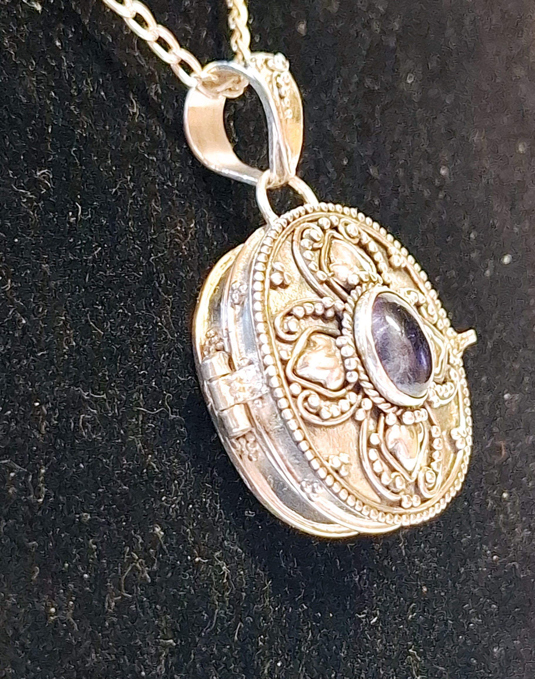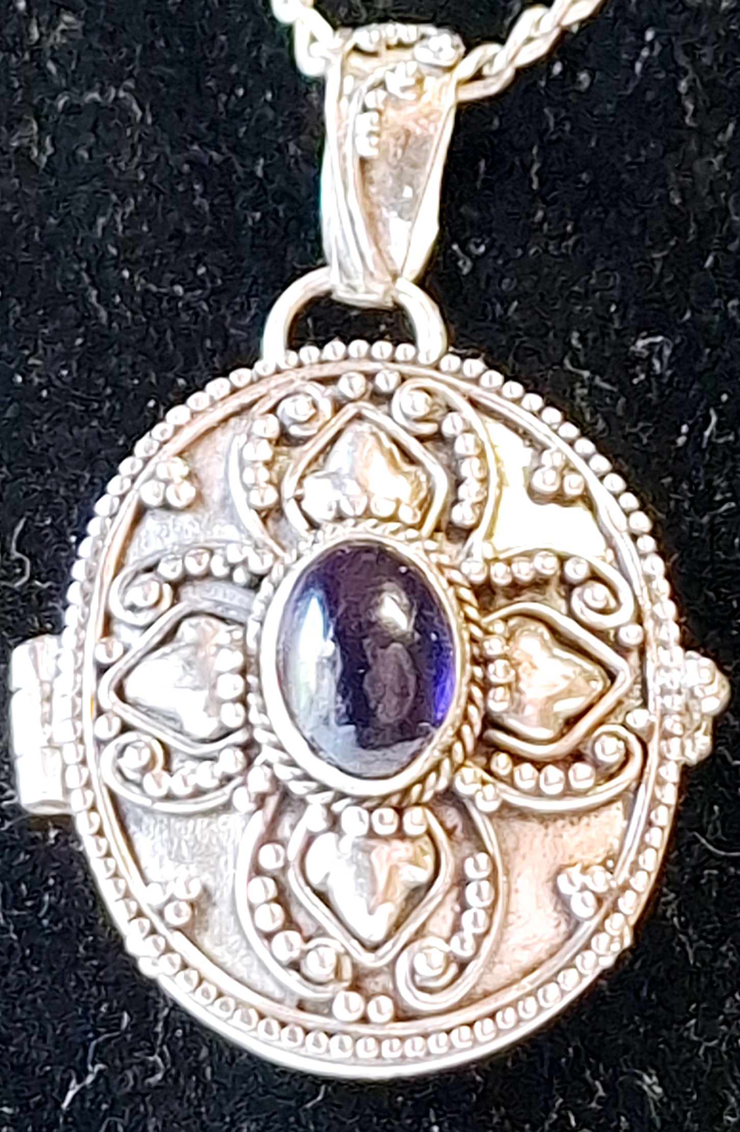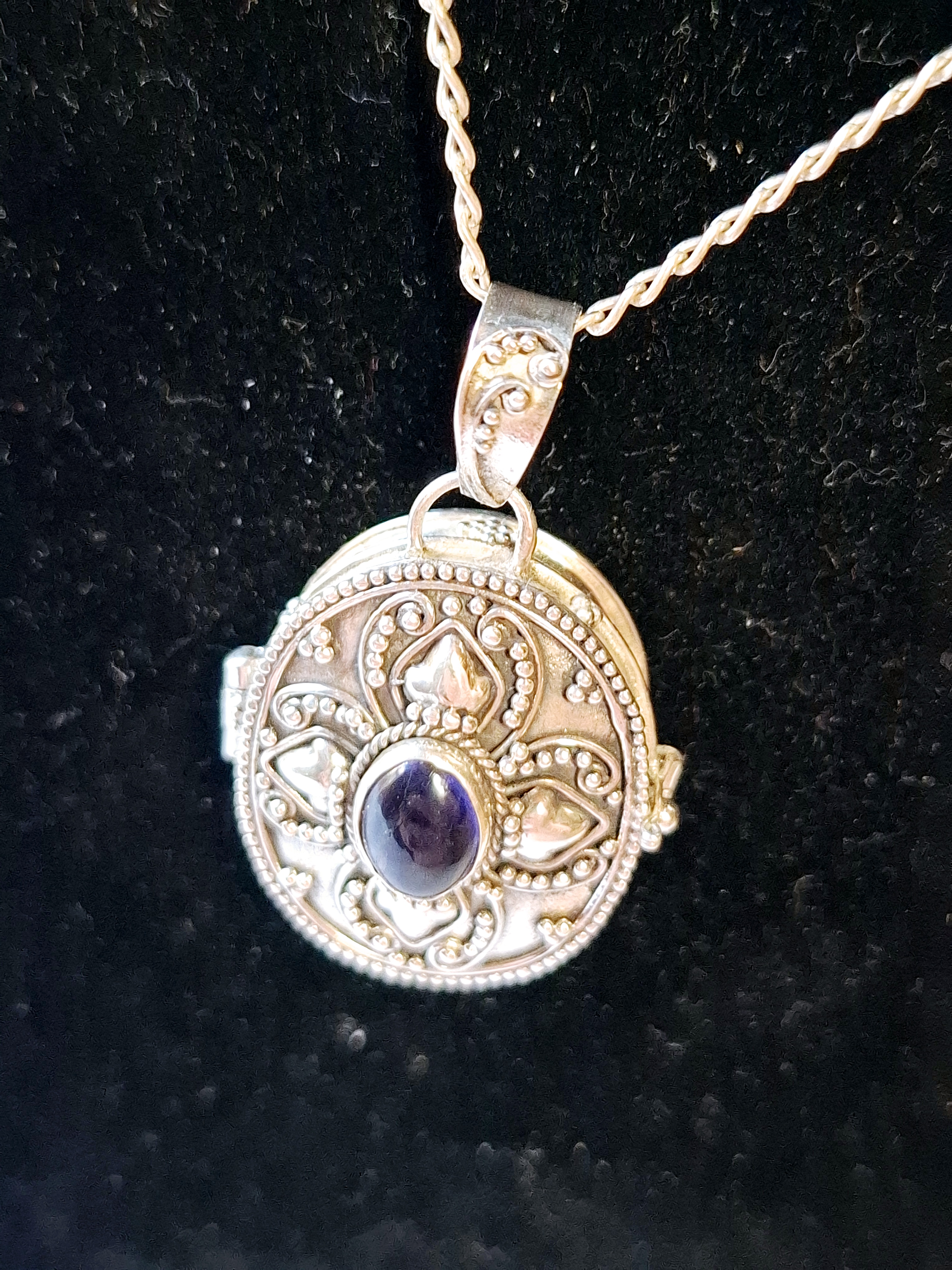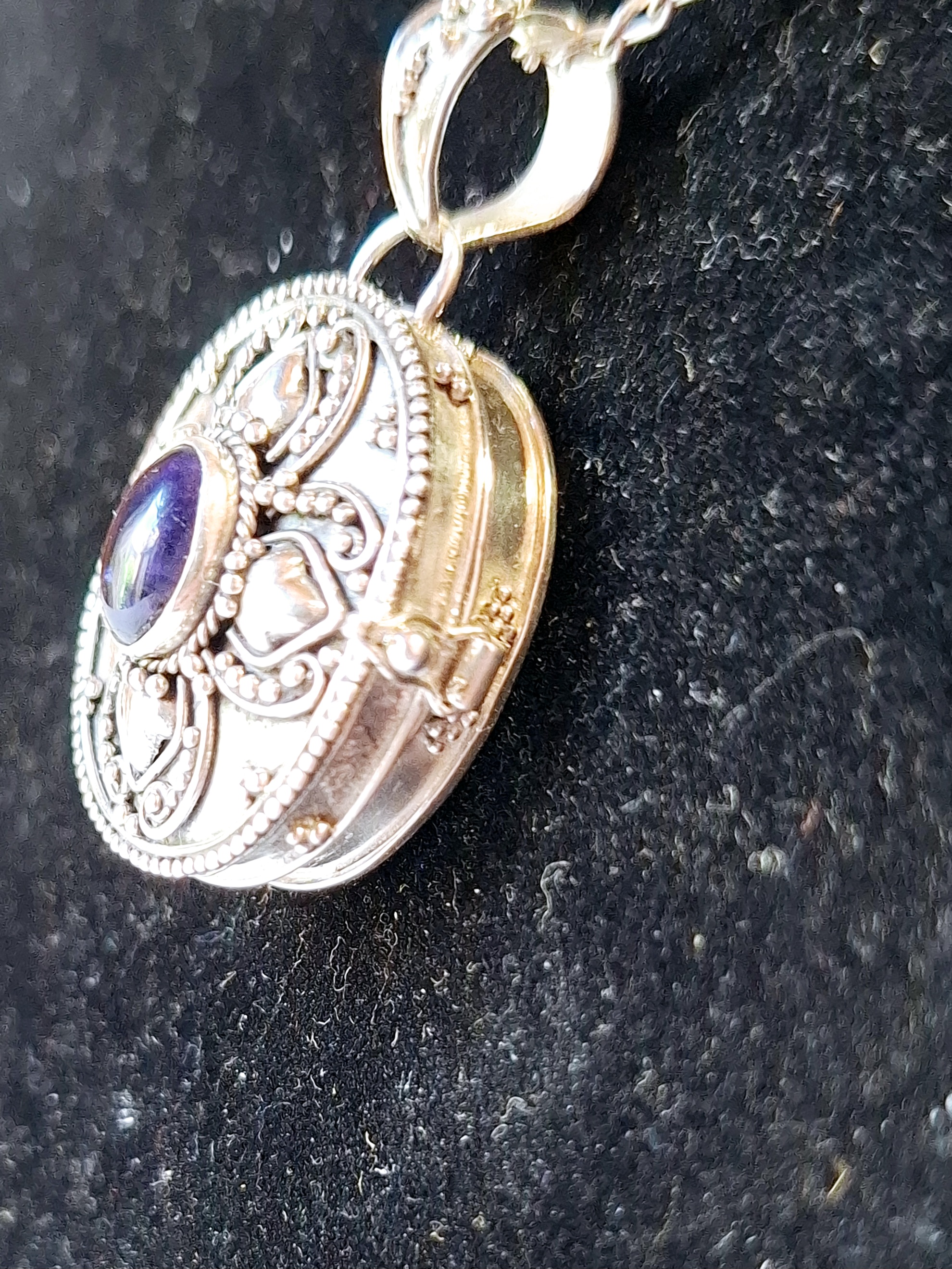 Mooie uitgewerkte keltische Vintage sterlingzilver 925 amethist cabochon hanger/gif, aandenken, pillendoosje medaillon/paarse edelsteen/ ketting heeft een lengte van 42 cm. De totale lengte van de hanger is 3.5 cm. Komt uit een prive Collectie en heeft altijd in een vitrine bak gelegen om te tentoonstellingen aan klanten . Word goed verpakt en verzekerd verzonden met track en trace .