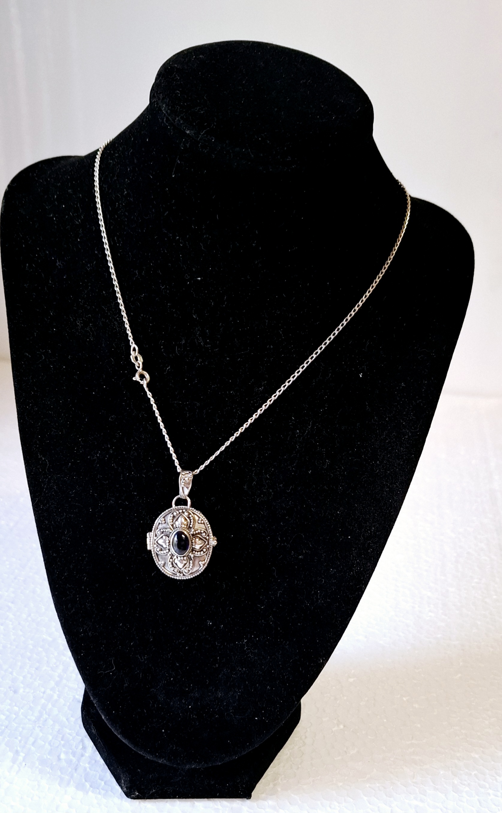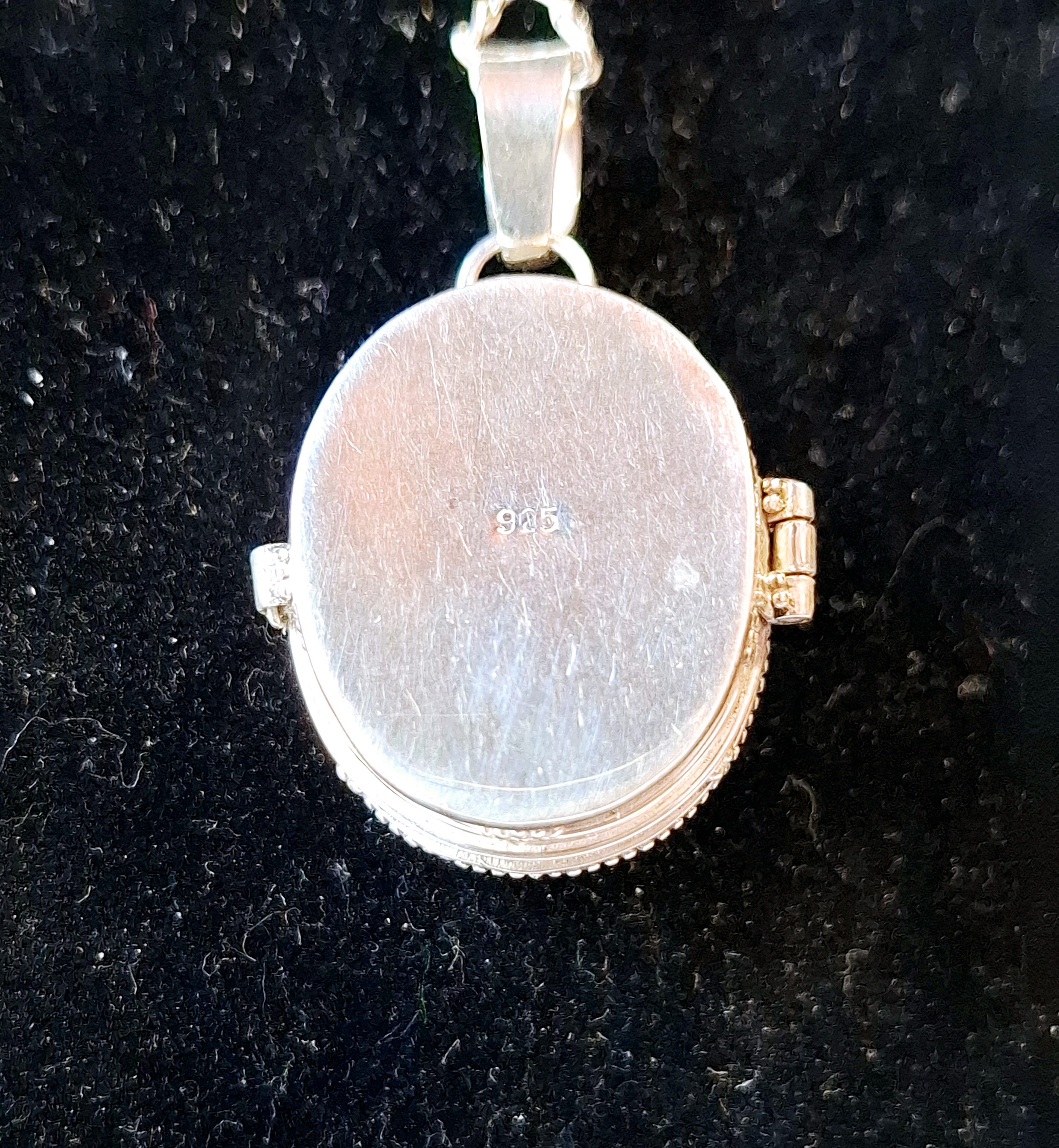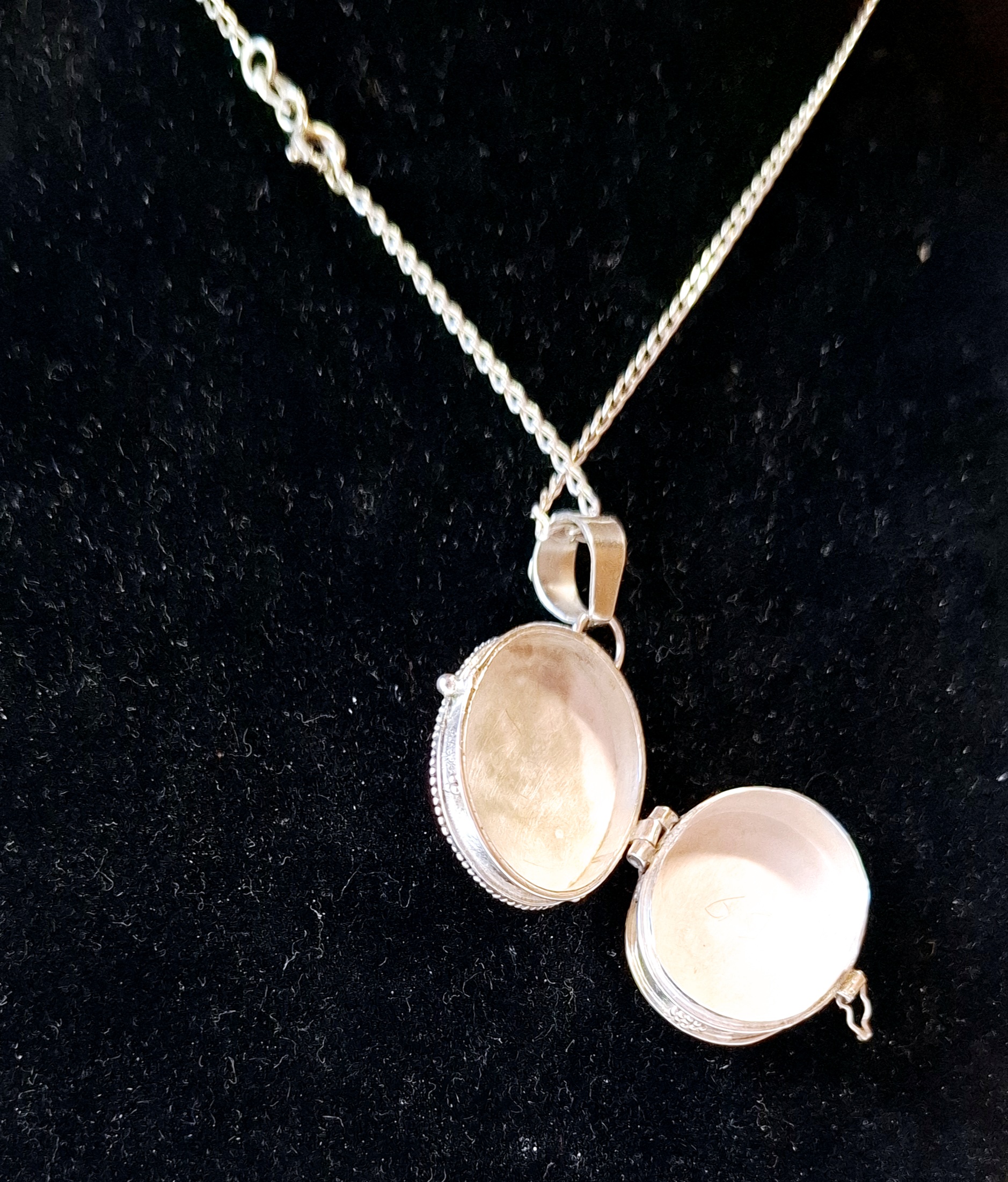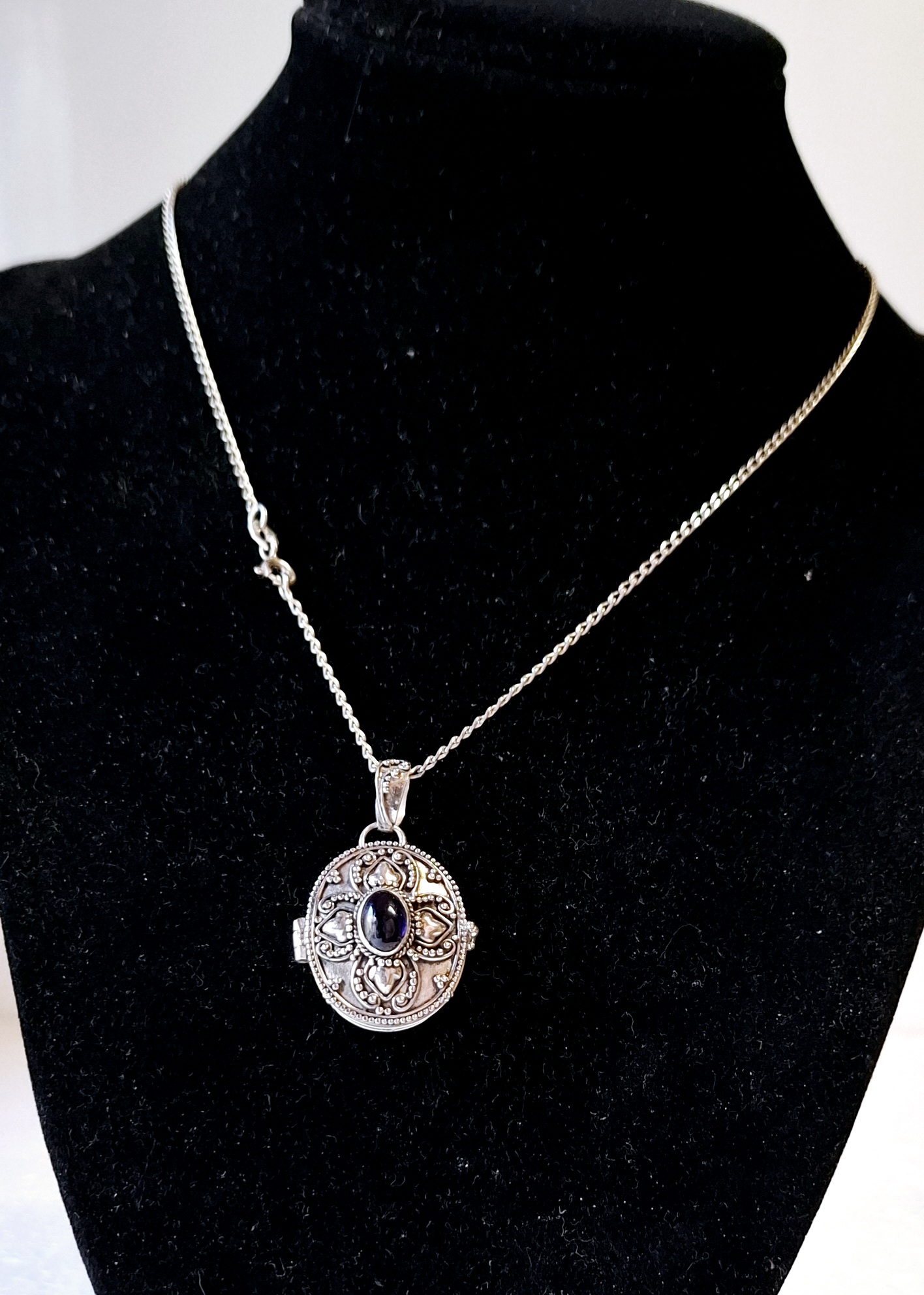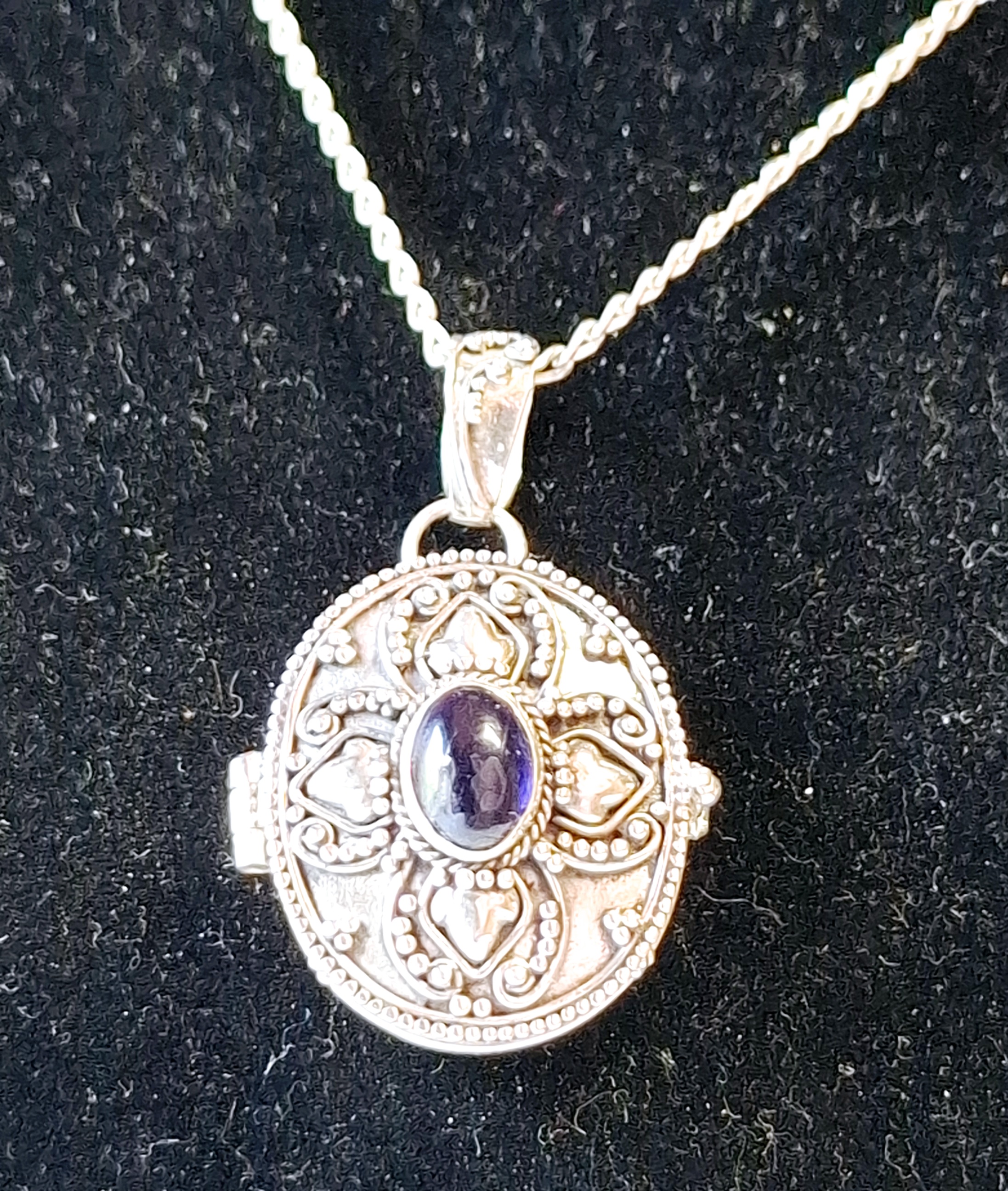Mooie uitgewerkte keltische Vintage sterlingzilver 925 amethist cabochon hanger/gif, aandenken, pillendoosje medaillon/paarse edelsteen/ ketting heeft een lengte van 42 cm. De totale lengte van de hanger is 3.5 cm. Komt uit een prive Collectie en heeft altijd in een vitrine bak gelegen om te tentoonstellingen aan klanten . Word goed verpakt en verzekerd verzonden met track en trace .