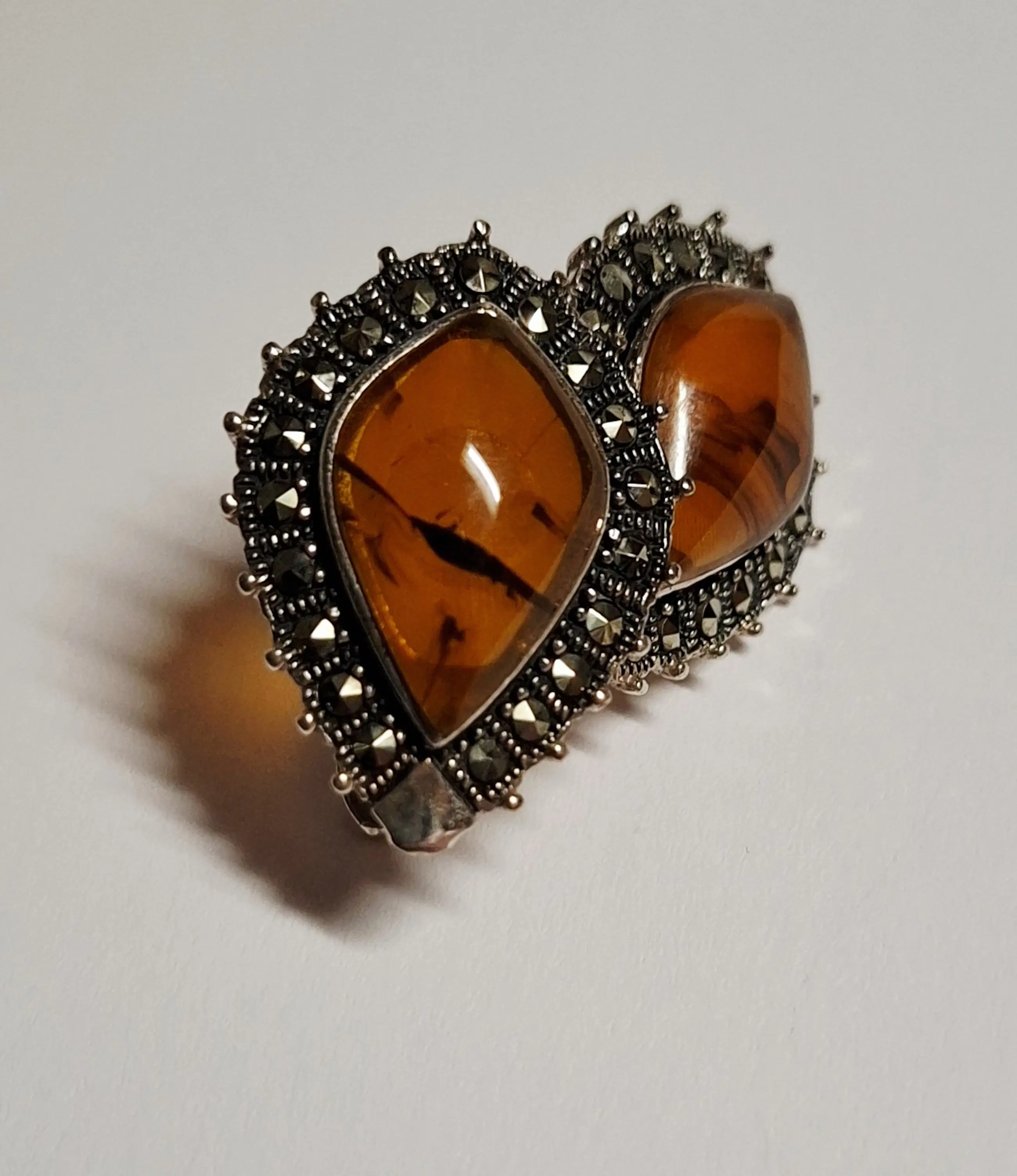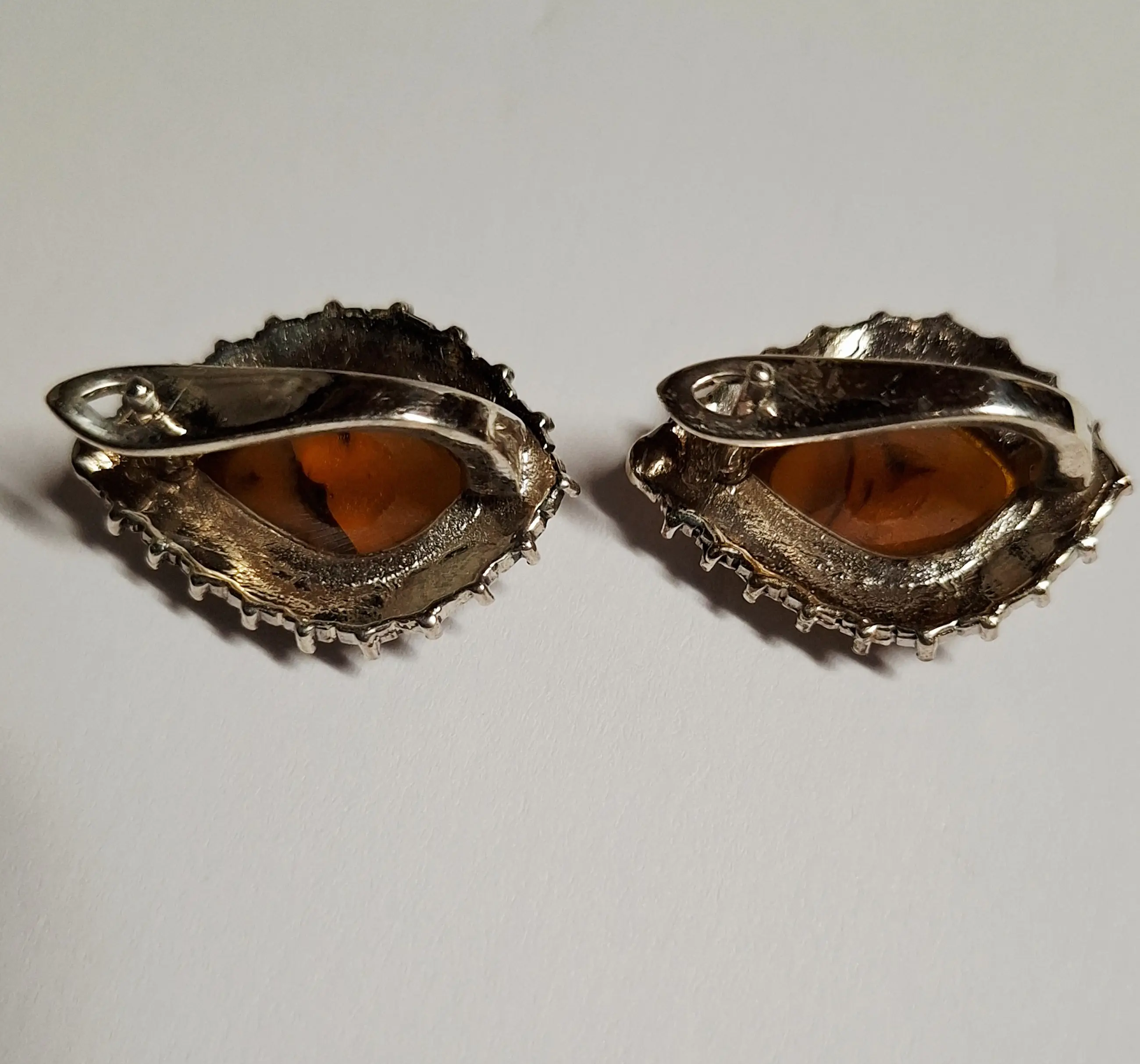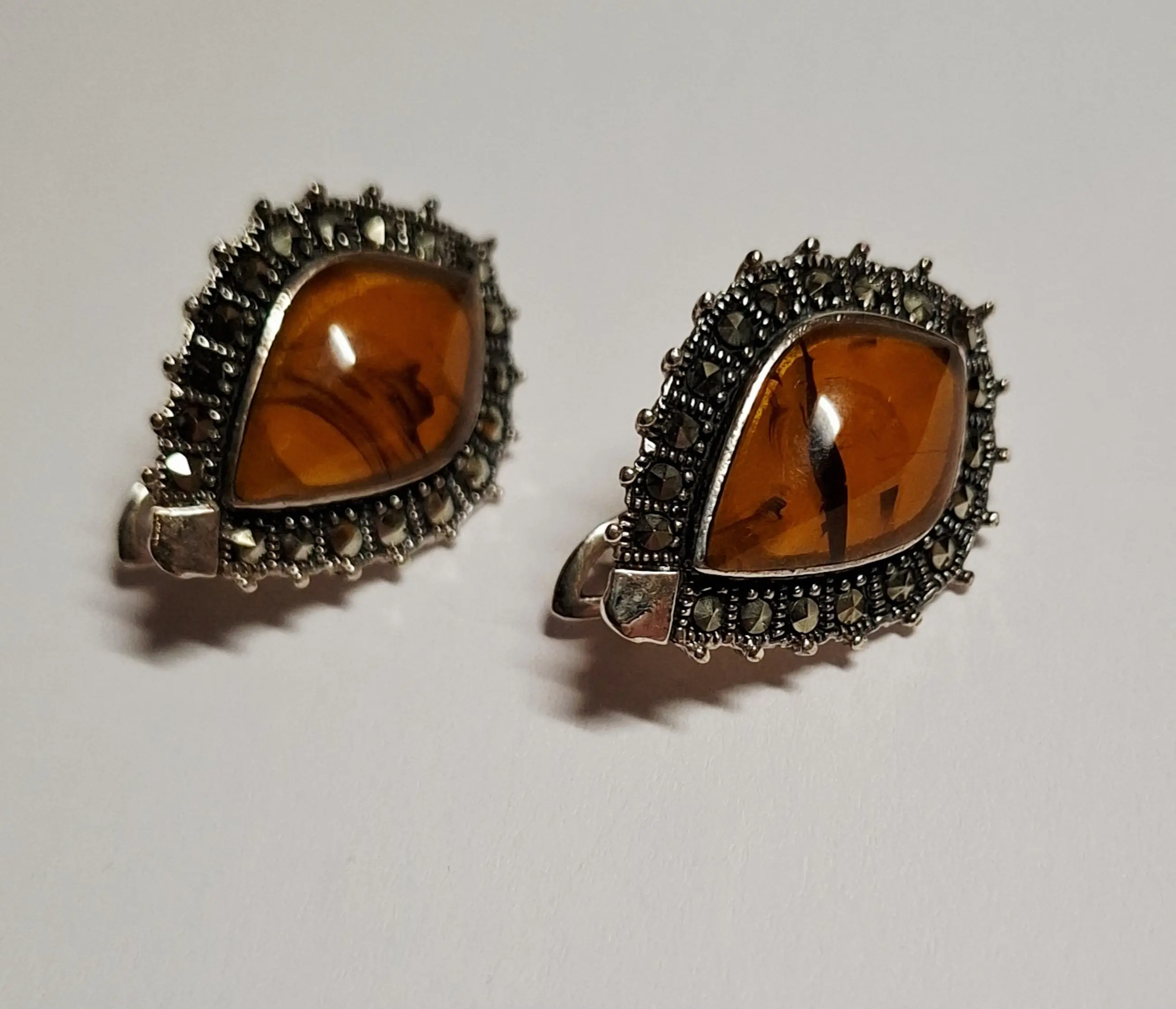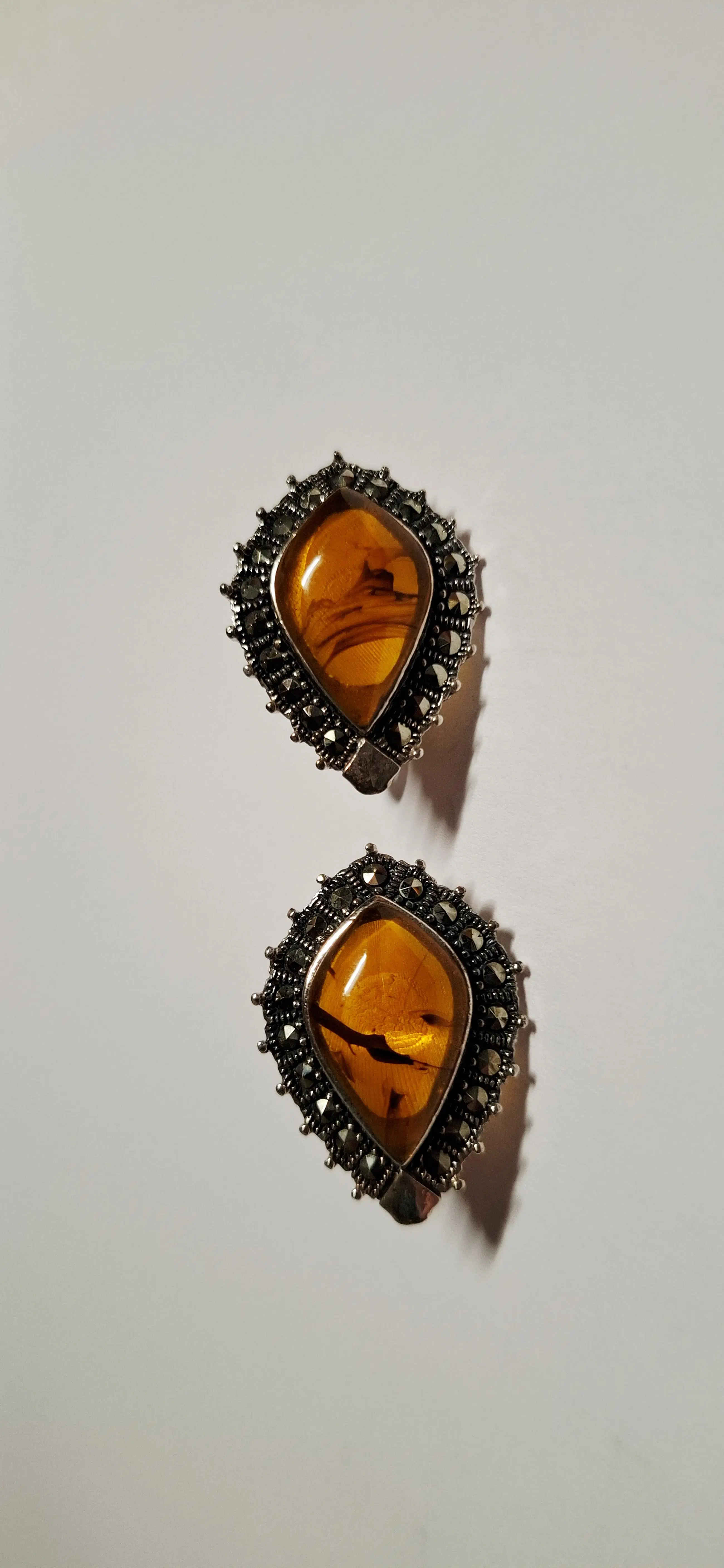 De setting van deze druppelvormige oorbellen is zilver en de rand heeft een mooi marcasiet setting. Het midden heeft een koepelvormig stuk gouden Amber met een open achterkant.