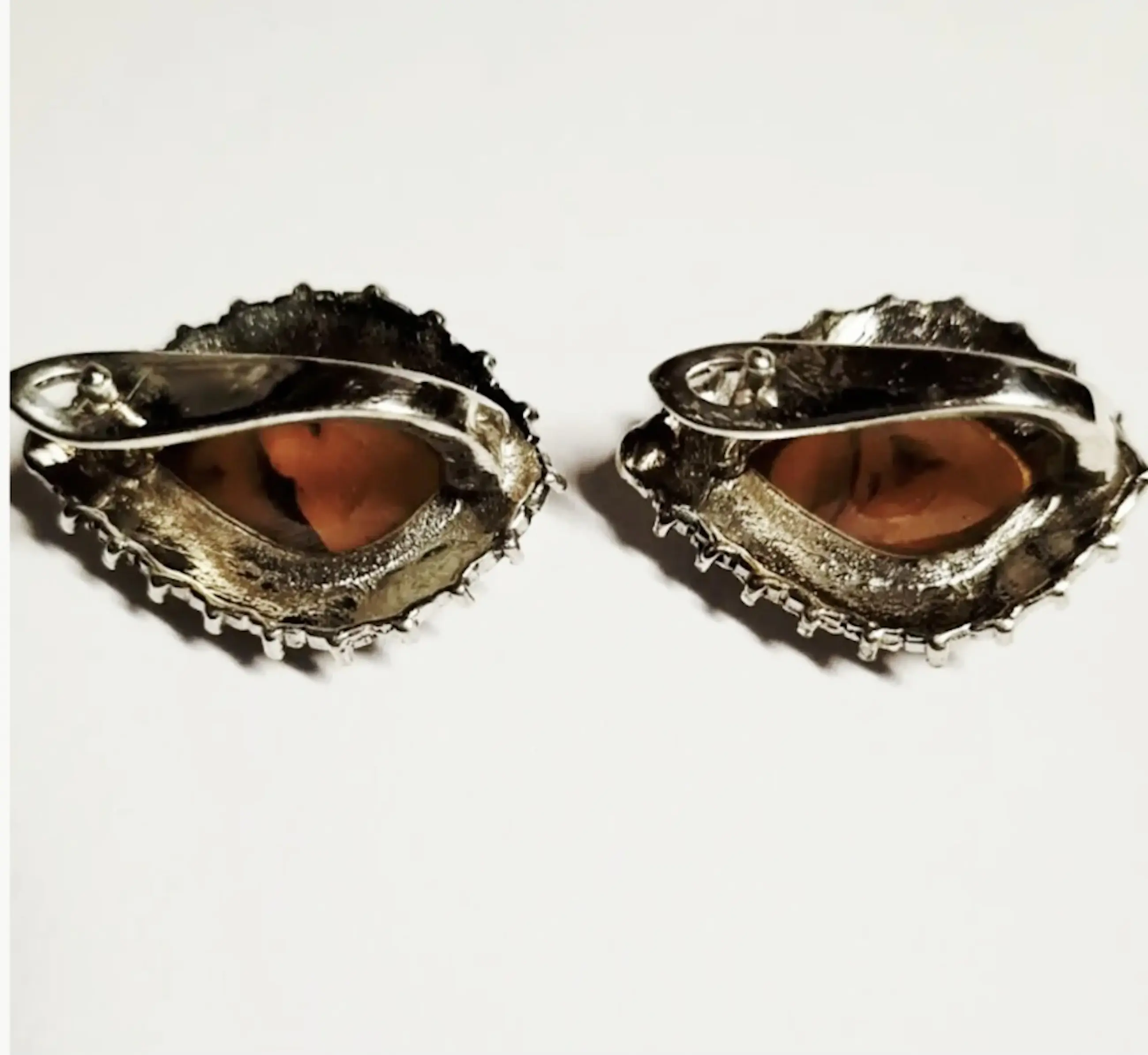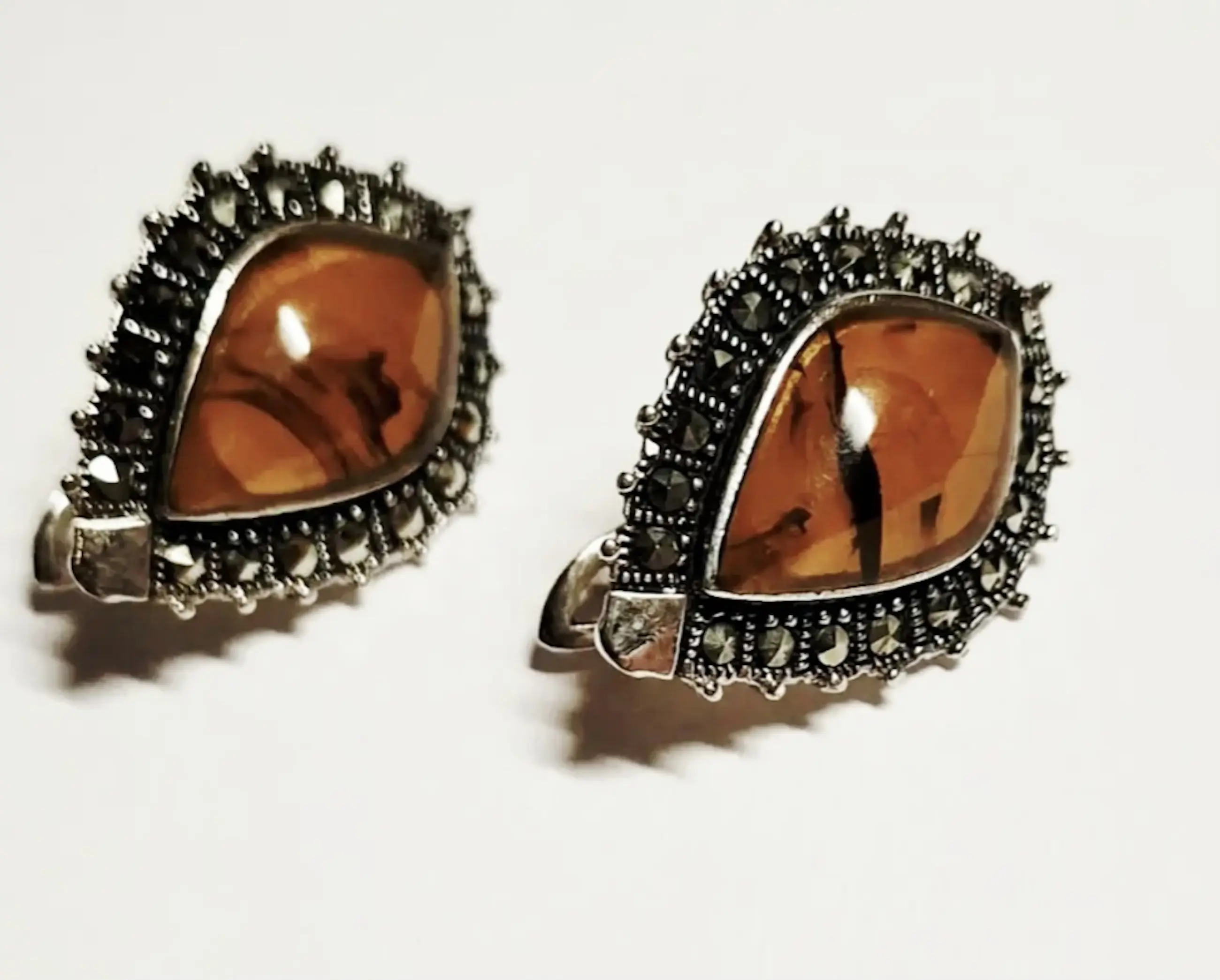 De setting van deze druppelvormige oorbellen is zilver en de rand heeft een mooi marcasiet setting. Het midden heeft een koepelvormig stuk gouden Amber met een open achterkant.