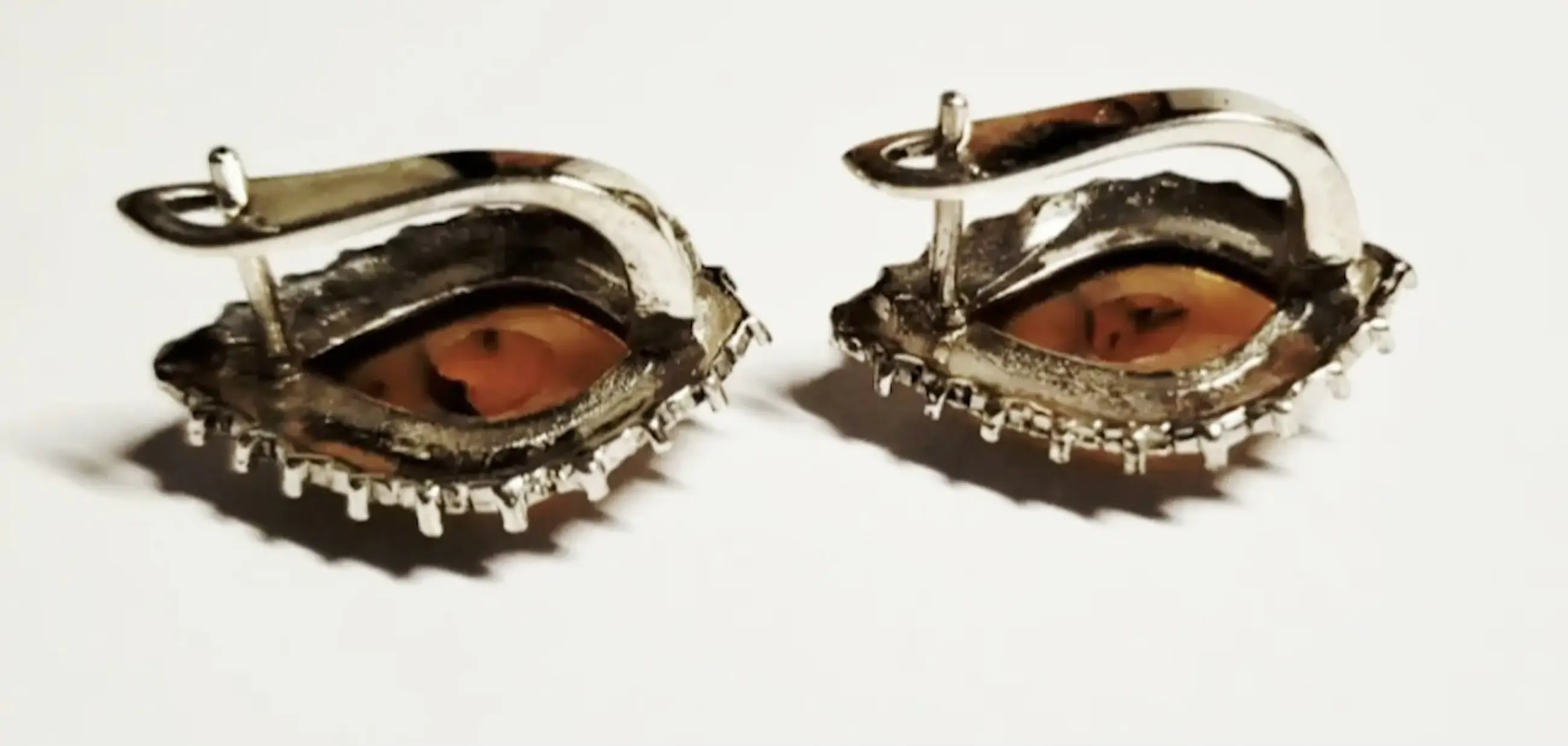 Vintage teardrop oorbellen met gouden amber en marcasiet en decoratief, gestippeld