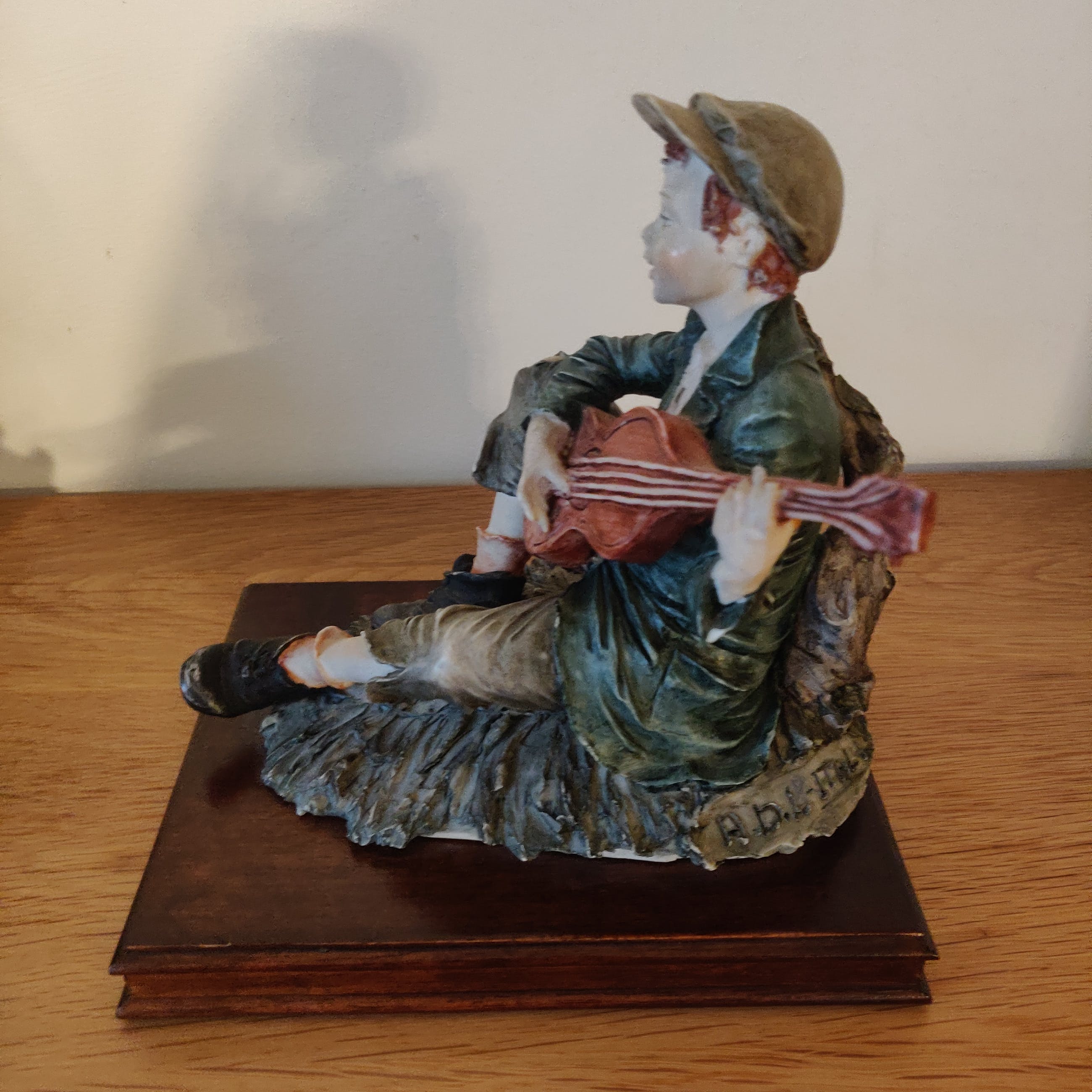 Prachtig beeld van Vittorio Tessaro jongen met gitaar. Handgeschilderd van klei. Zeer gedetailleerd op houten voet. Jaartal niet bekend maar waarschijnlijk tussen 1960 en 1990. Een prachtig gedetailleerd object.