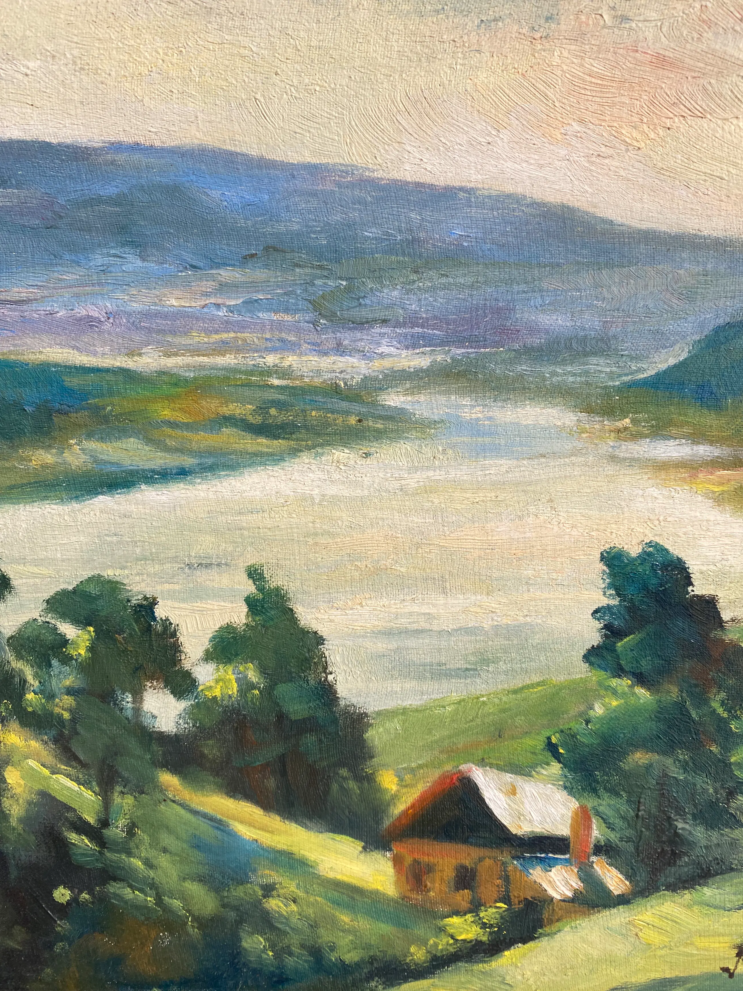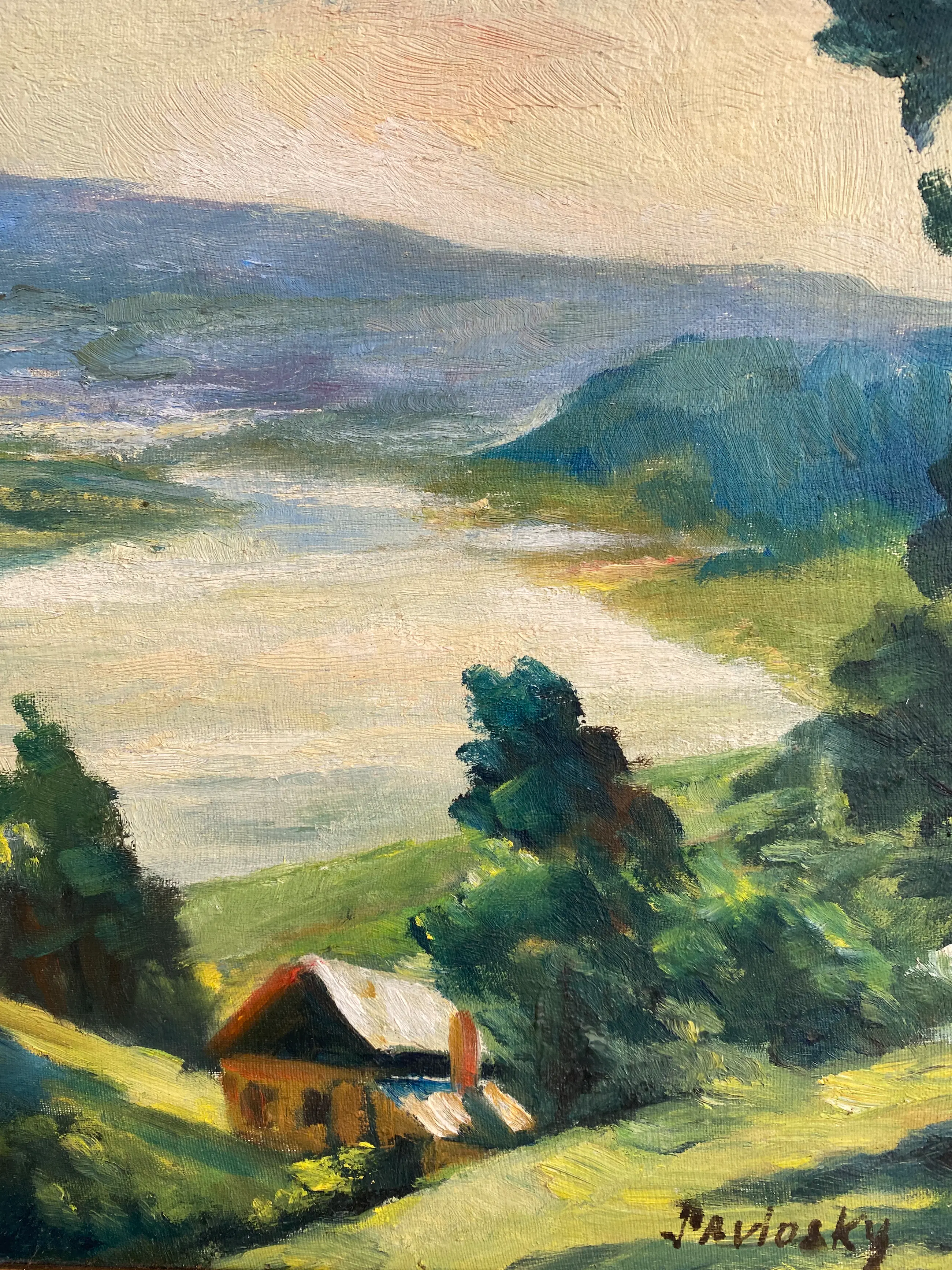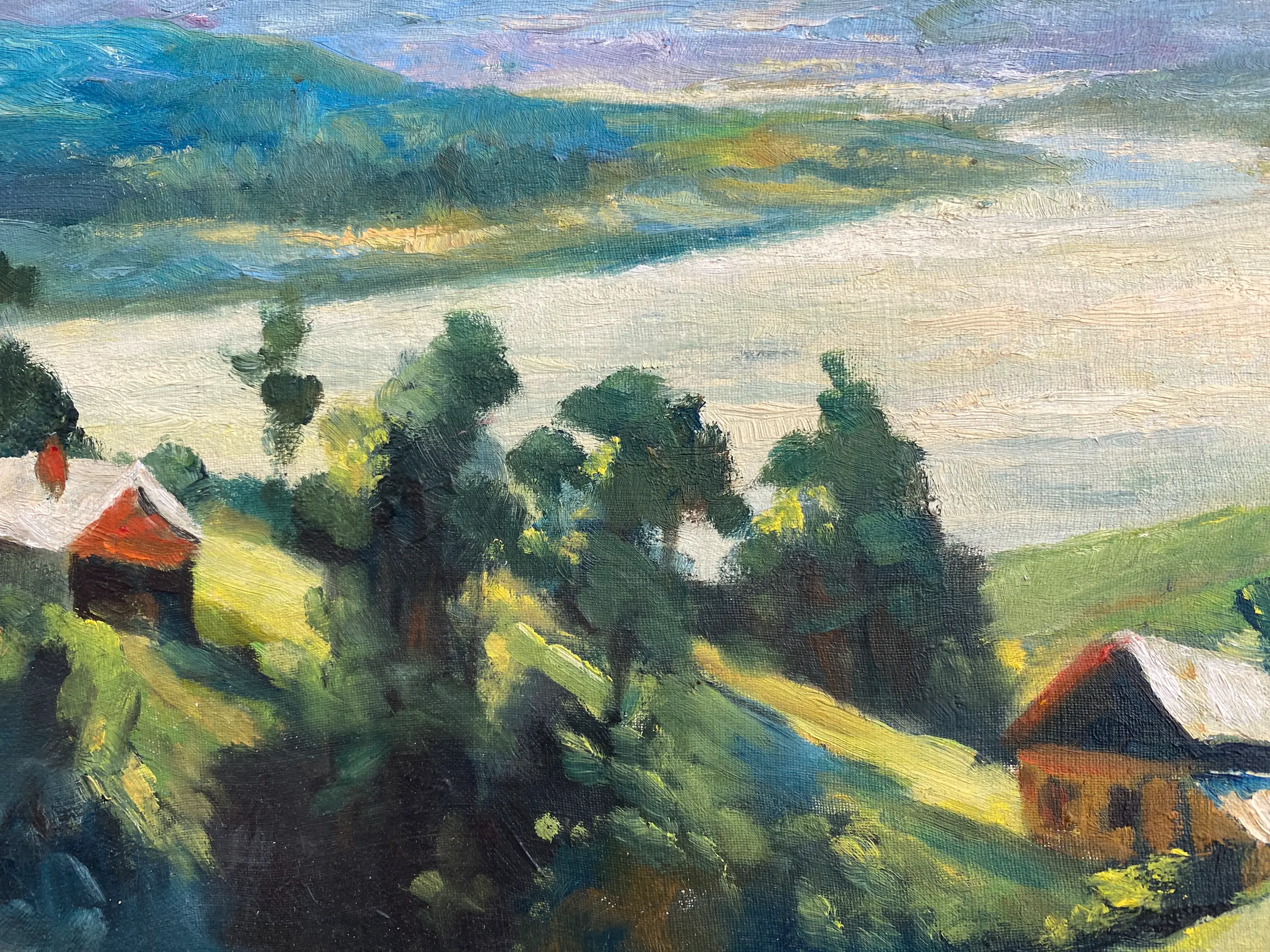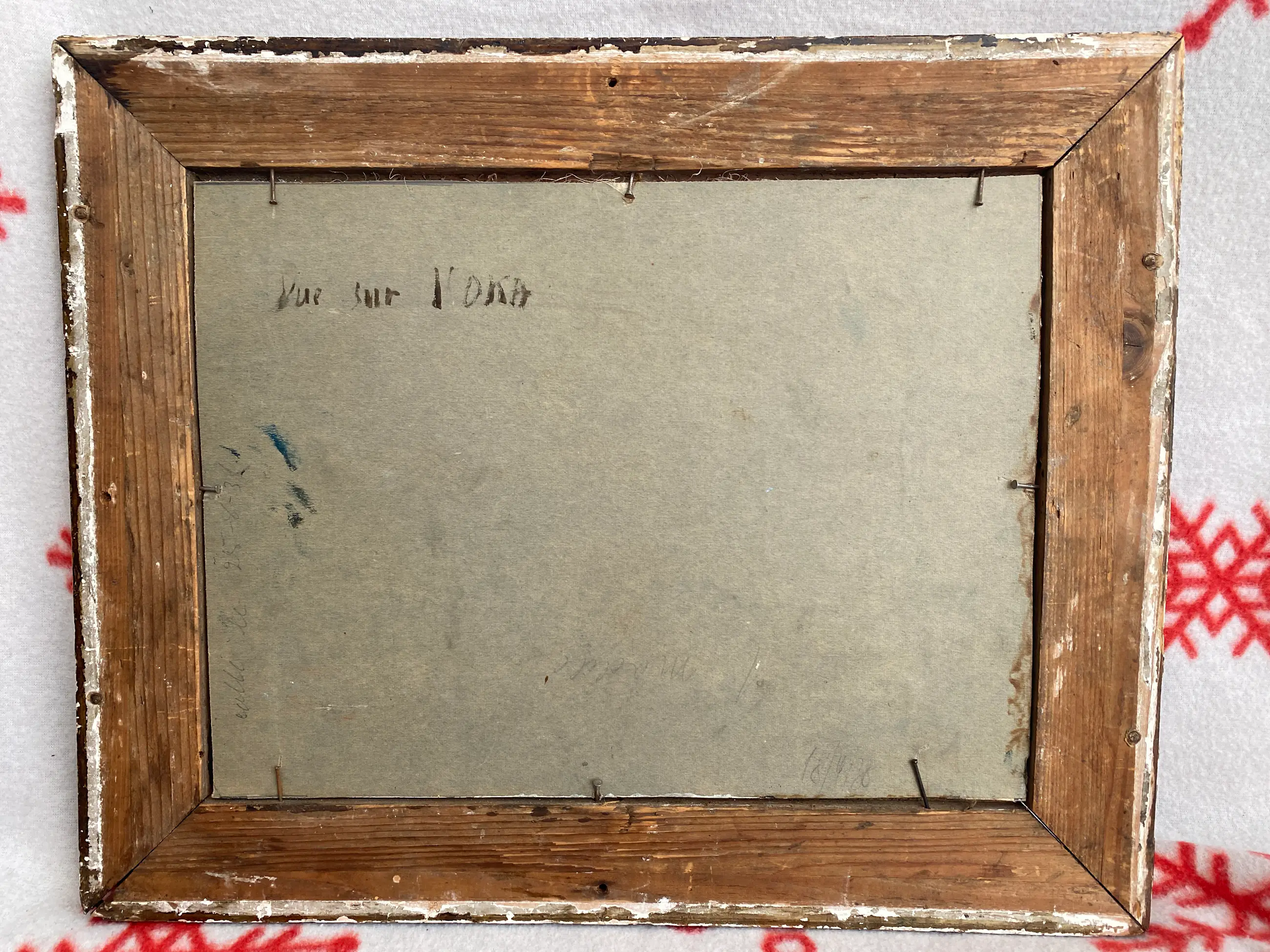 Olieverf op board, gesigneerd rechts onderin, getiteld “ Vue sur l’Oka (nam van de rivier) en gedateerd 1938 op achterkant . In goede conditie, afmetingen lijst 43x36, afbeelding 33x25 cm. Provenance privé verzameling te Amsterdam.