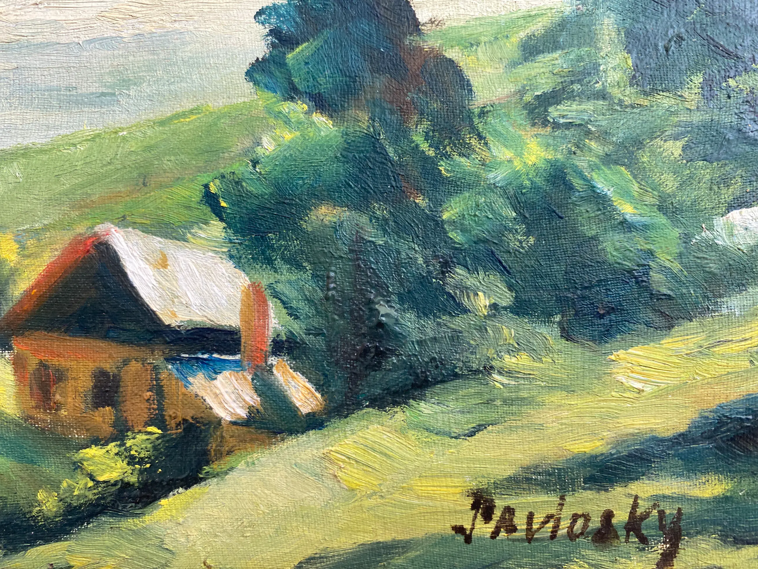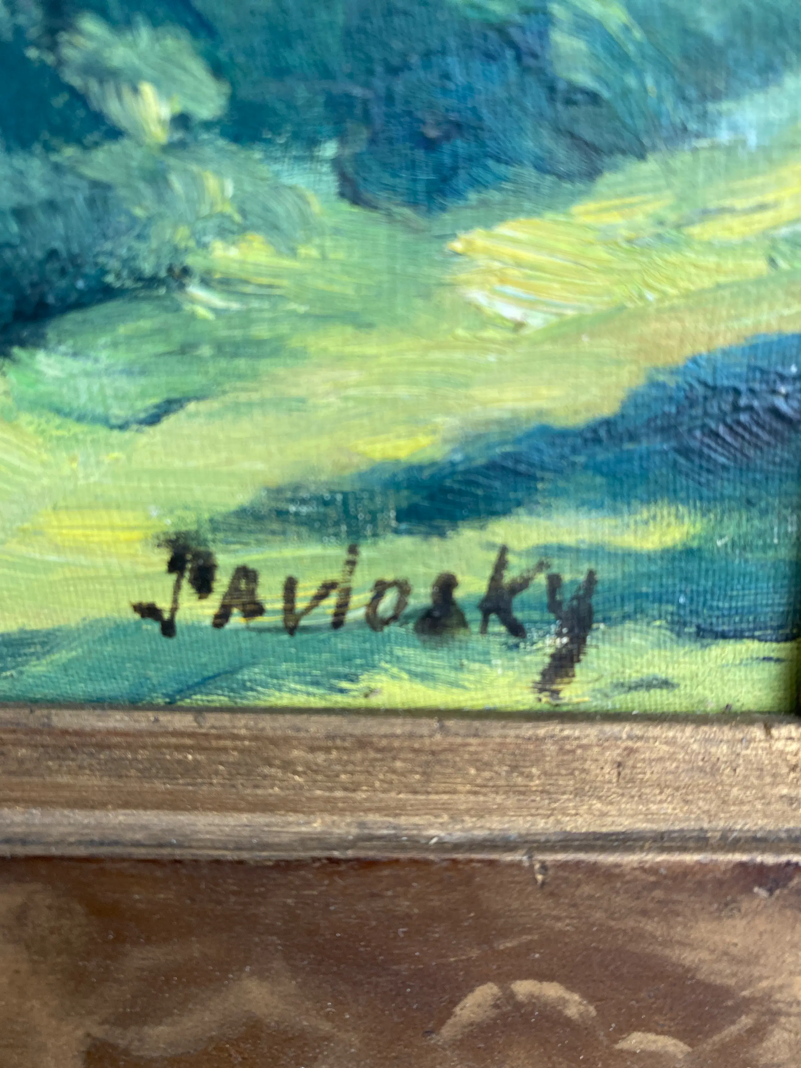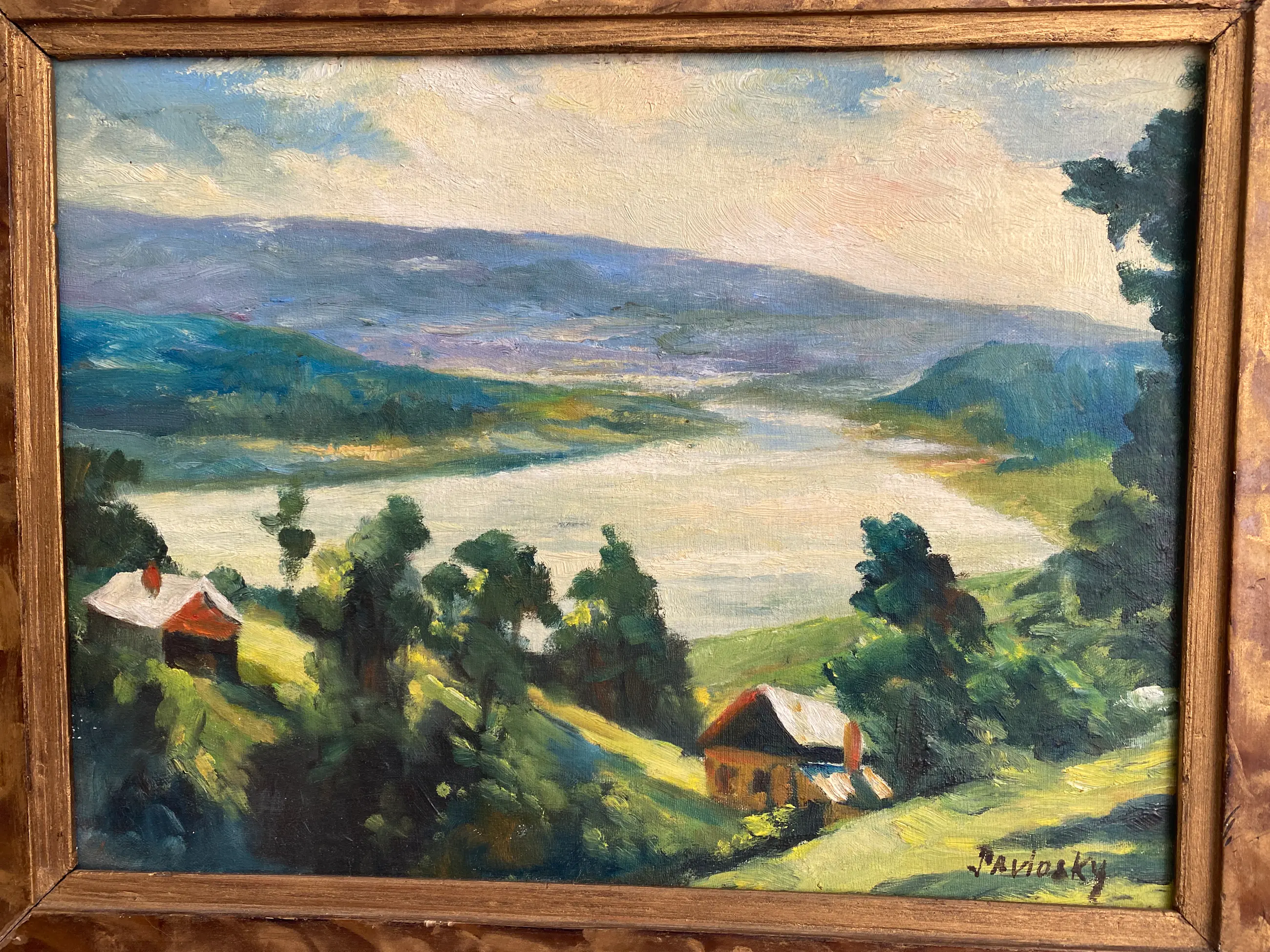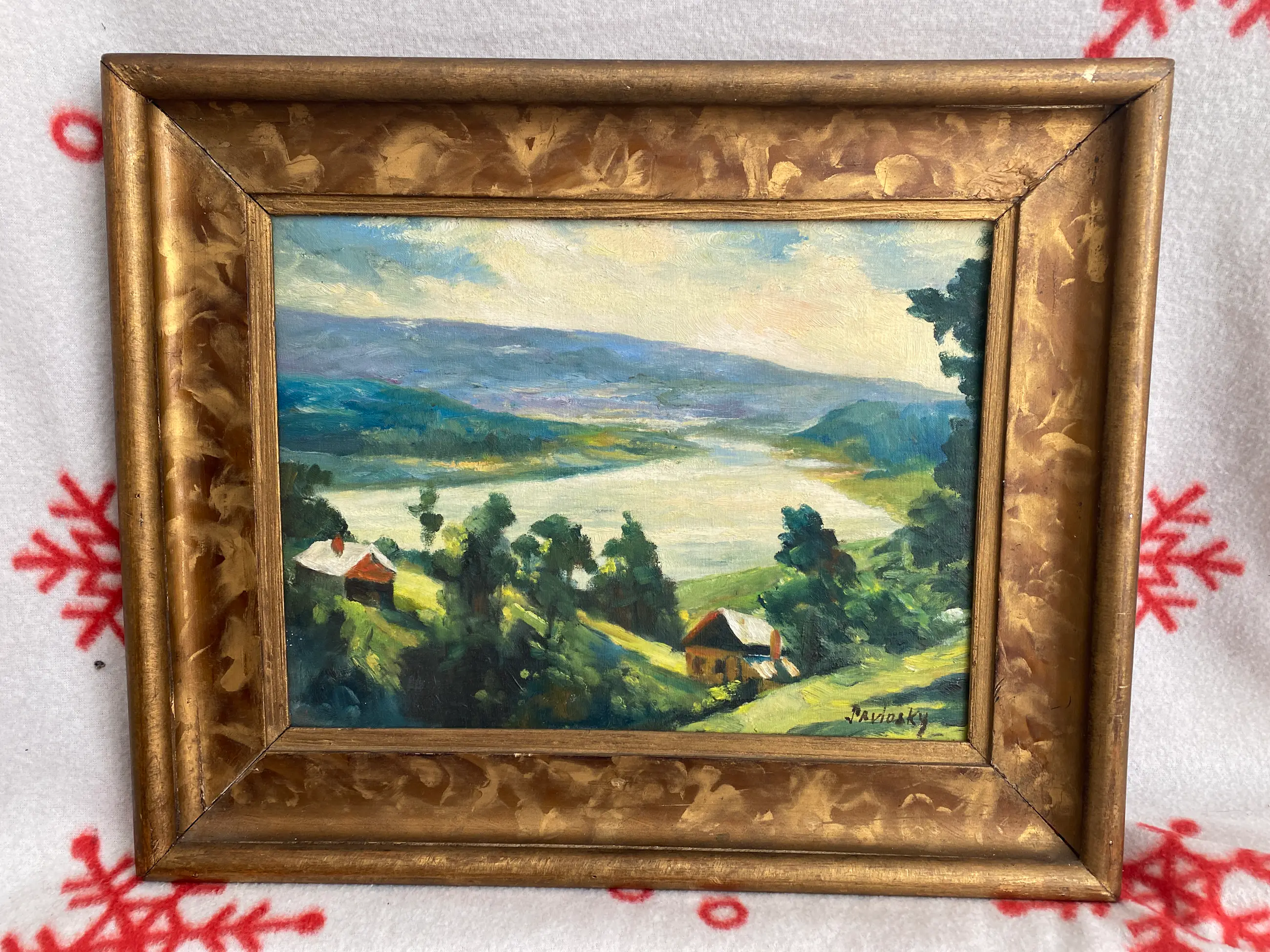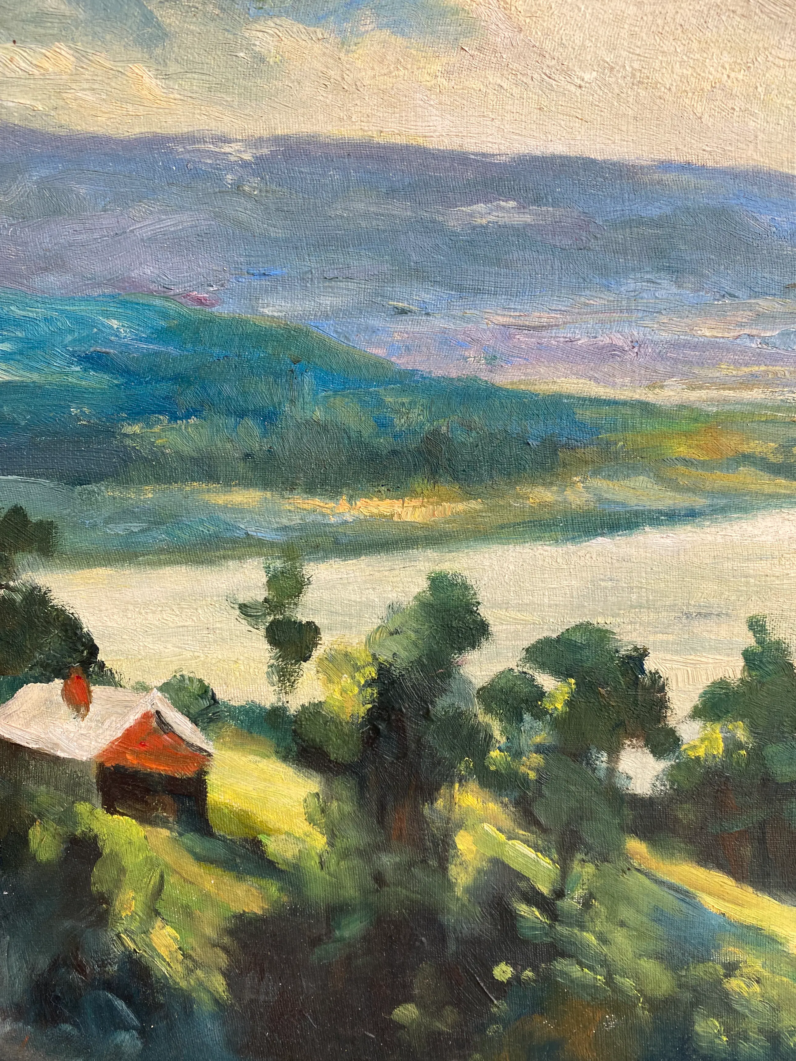 Olieverf op board, gesigneerd rechts onderin, getiteld “ Vue sur l’Oka (nam van de rivier) en gedateerd 1938 op achterkant . In goede conditie, afmetingen lijst 43x36, afbeelding 33x25 cm. Provenance privé verzameling te Amsterdam.