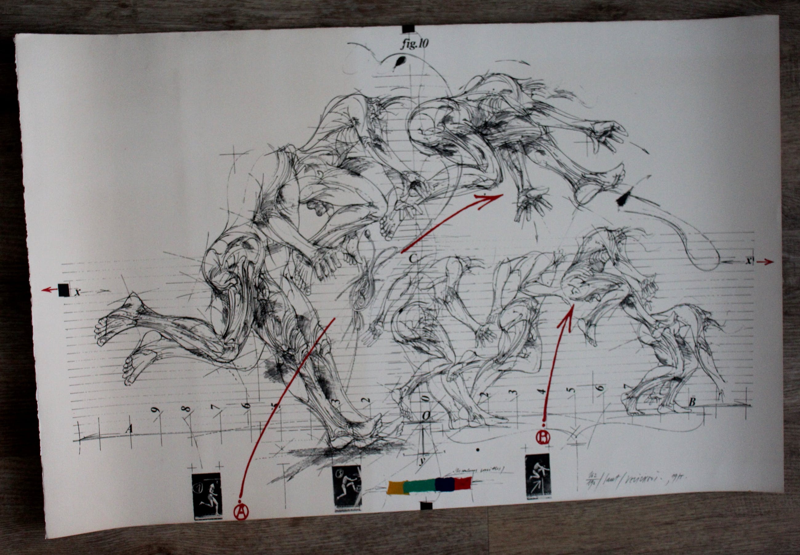 Litho van Vladimir Velickovic. Titel: Sprong. Jaar: 1975. Nummer: 162/190. Afmetingen blad: H57.5 x b89cm. Het werk is rechts onderaan, met potlood, gesigneerd door de kunstenaar. De authenticiteit van het aangeboden werk wordt volledig gegarandeerd. Een certificaat van echtheid kan, op aanvraag, worden gemaild.