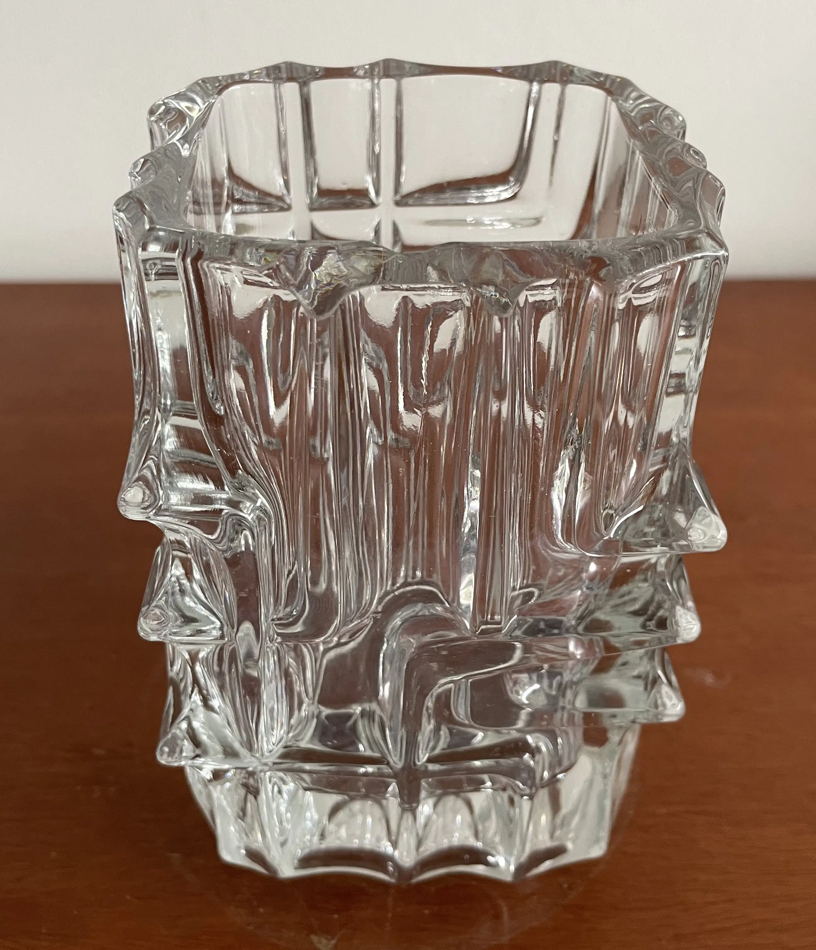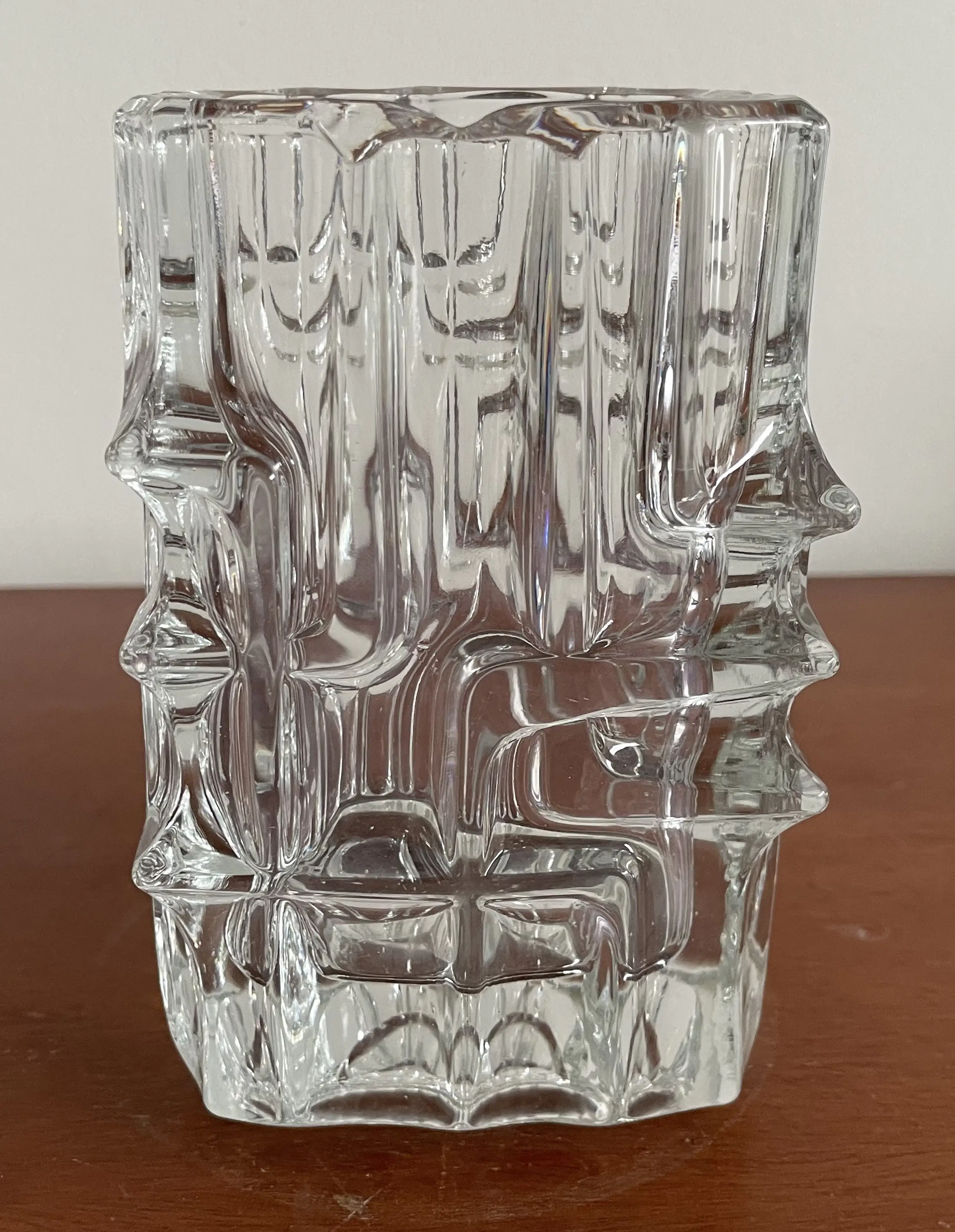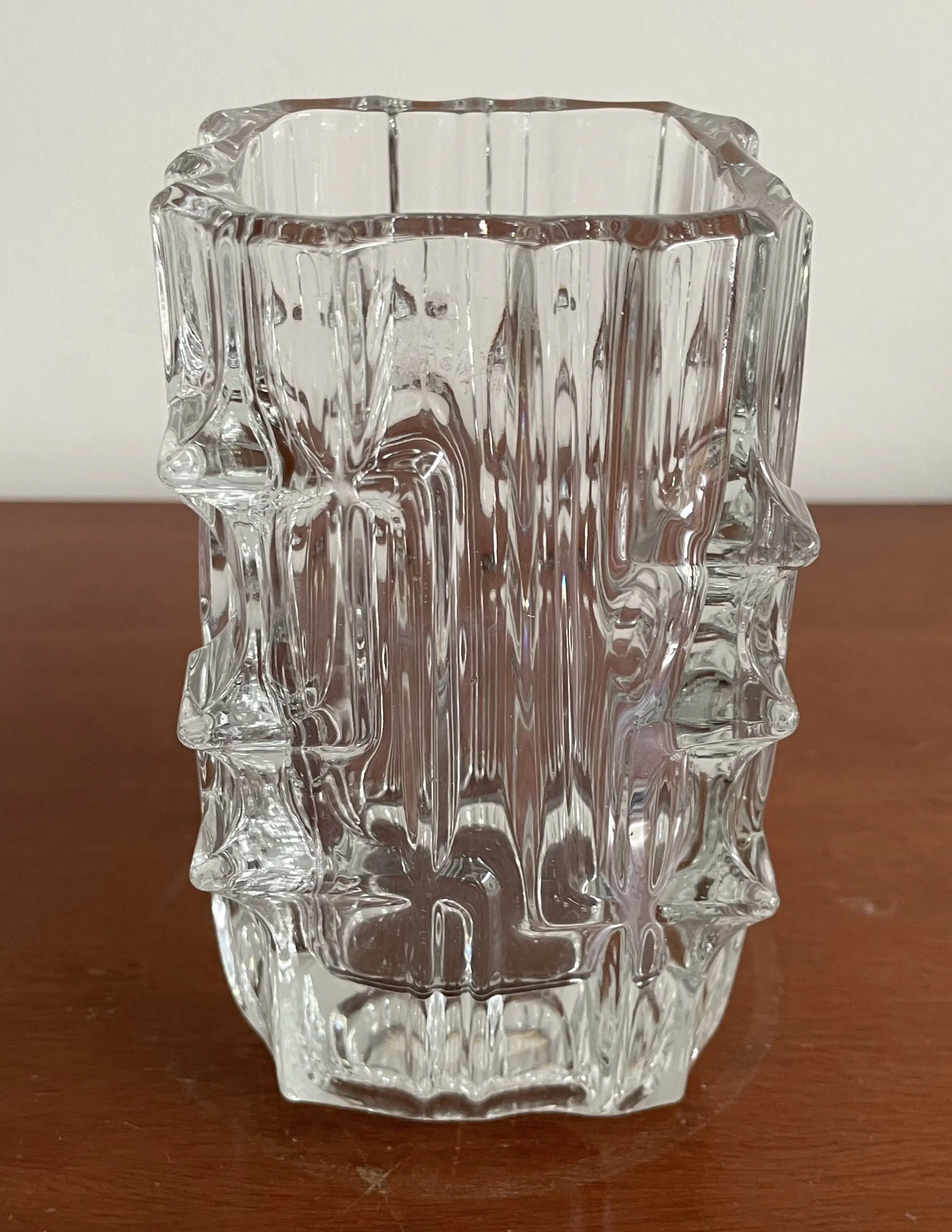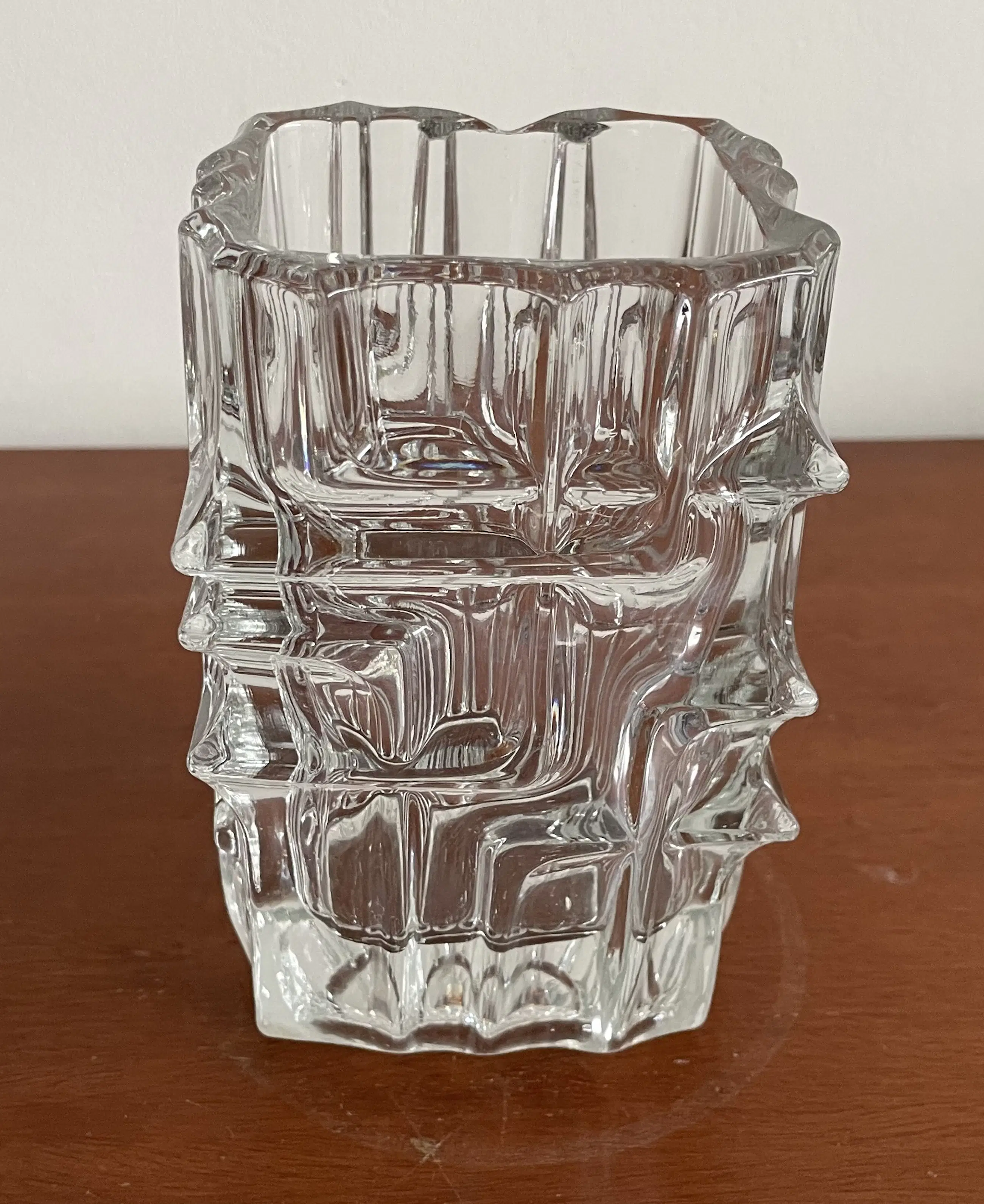 Deze Sklo Union vaas, ontworpen door Vladislav Urban in de jaren 60, is een prachtig voorbeeld van brutalistisch design. De vaas is gemaakt van helder glas en heeft een robuuste, gestructureerde vorm die een statement maakt in elke ruimte. Perfect voor liefhebbers van vintage en designklassiekers.