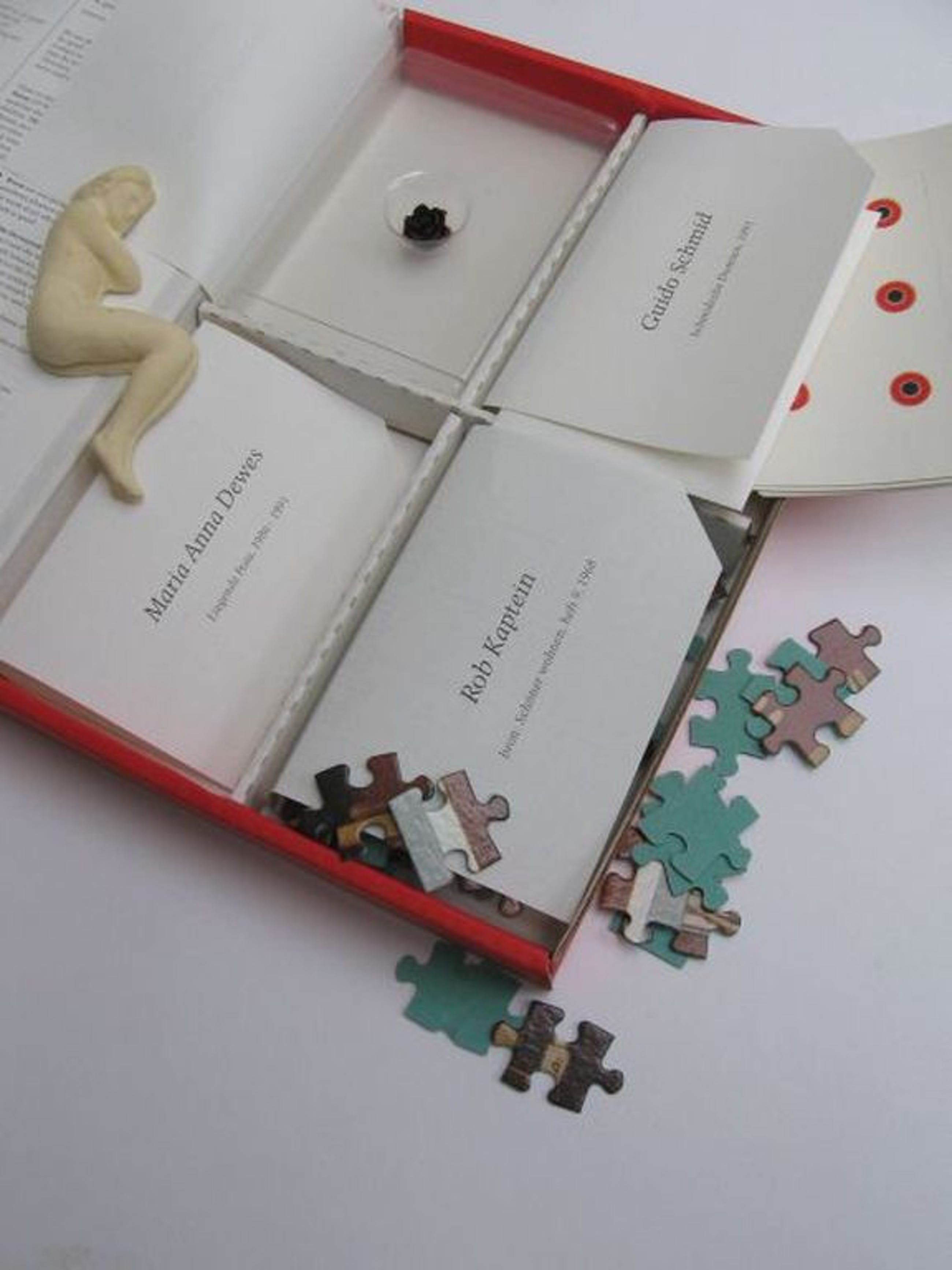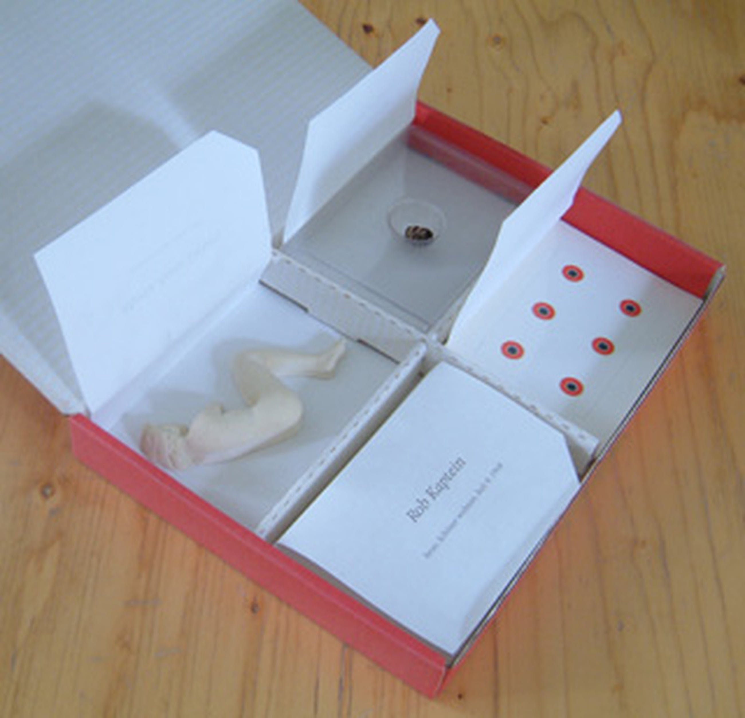 Kartonnen doos met vier multiples van de kunstenaars; Rob Kaptein, Junceau, Guido Schmidt, Maria Anna Dewes