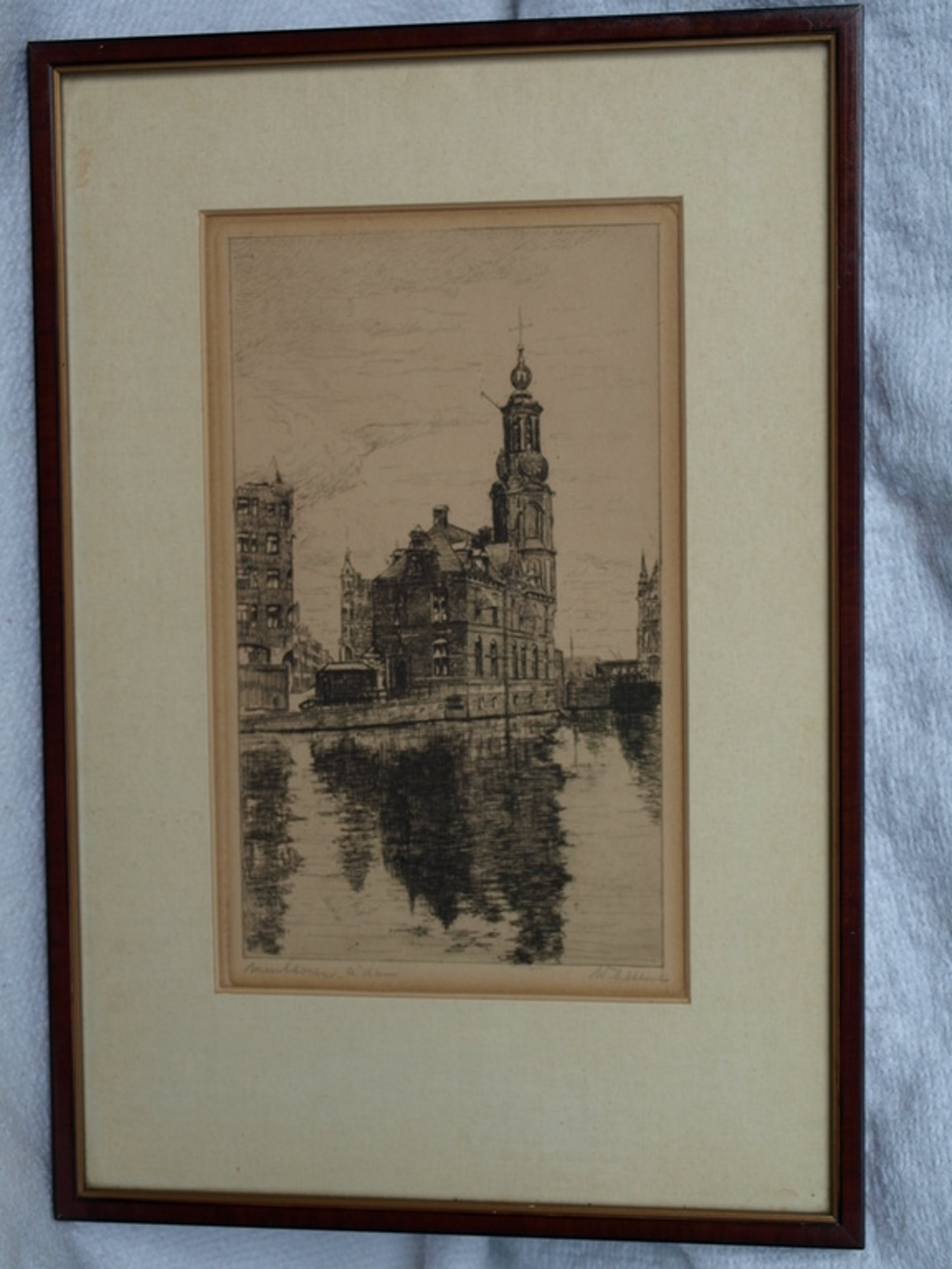 Een oude ets van de Friese kunstenaar W. Ottema van de Munttoren in Amsterdam.