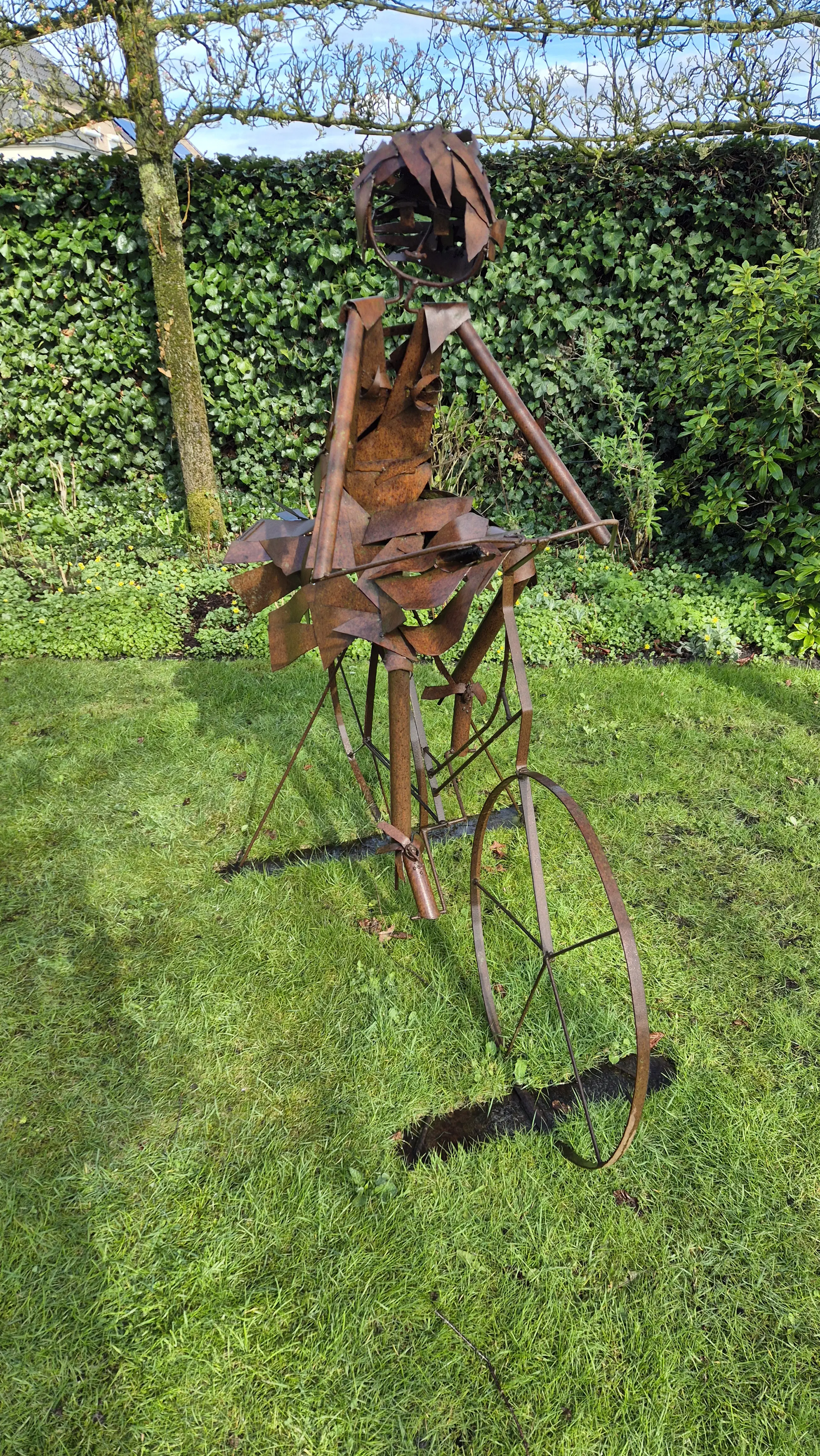 Prachtig en origineel tuinbeeld van cortenstaal: een speelse, karaktervolle fietser met een artistieke uitstraling. Dit beeld is volledig handgemaakt en daardoor een uniek stuk – je komt dit nergens anders tegen. Kunstenaar Willemine van Laarhoven.